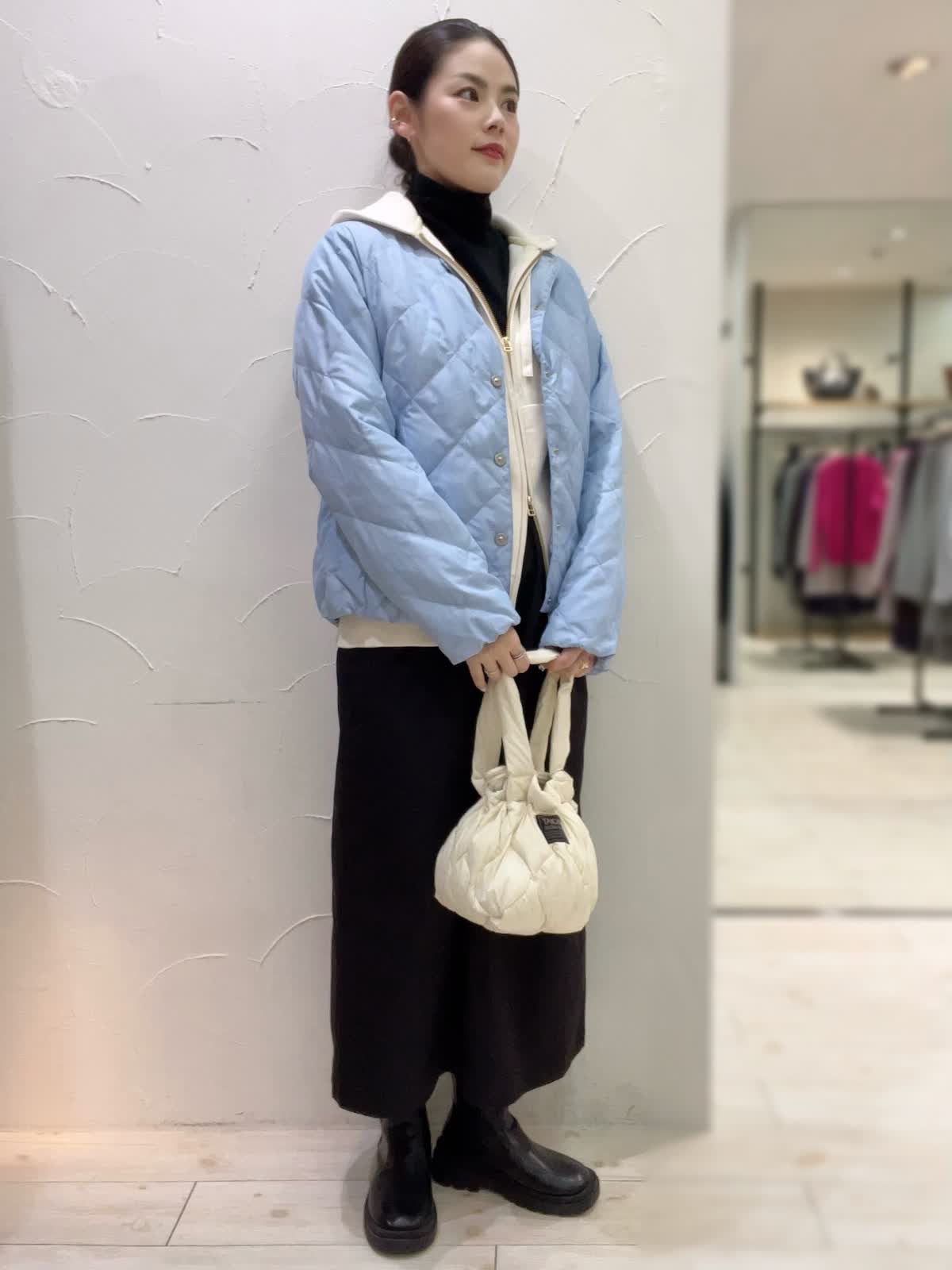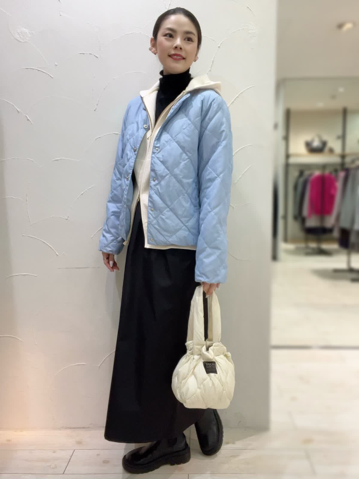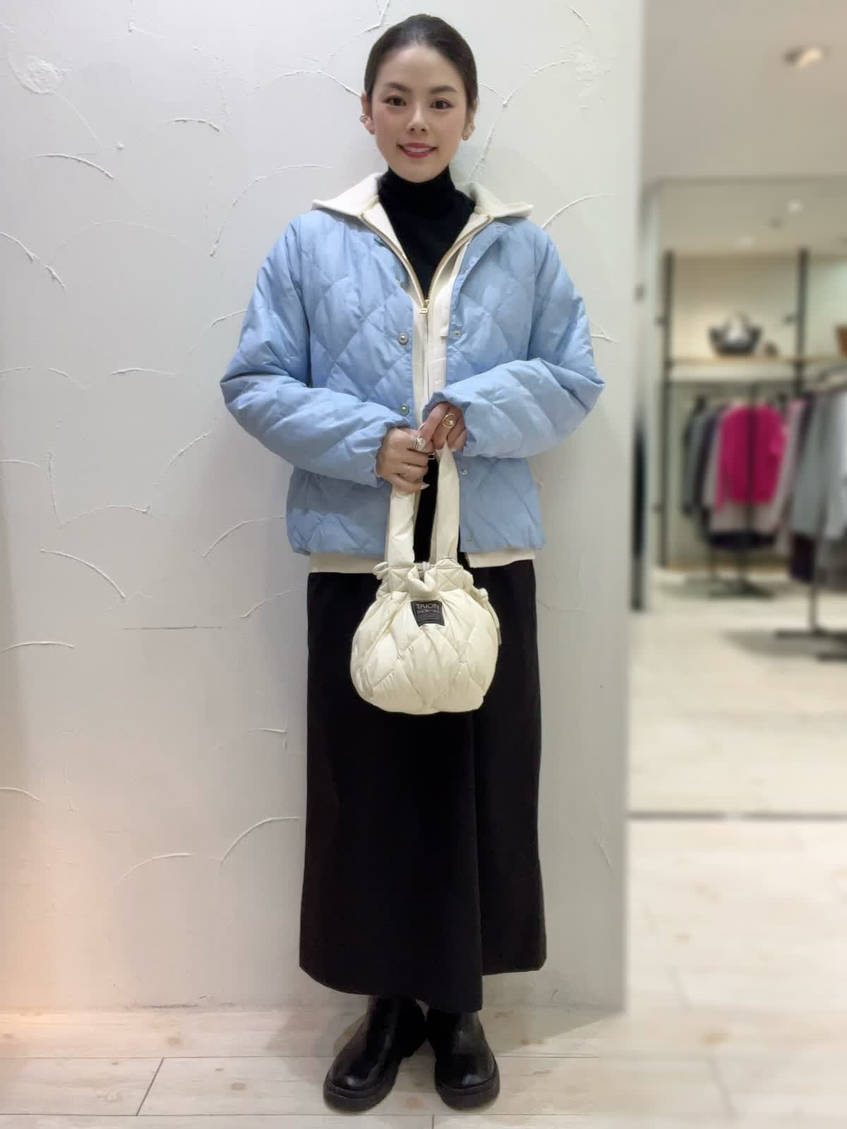 冬のお出かけカジュアルコーデ。サックスブルーがとても綺麗なTAIONコラボダウン。薄手で軽いデザインながらもしっかりと暖かい冬のアウターです。ジャケット感覚でお召しいただけるスッキリとした丈感もポイント。インナーにパーカーを合わせてカジュアルな雰囲気に仕上げました。