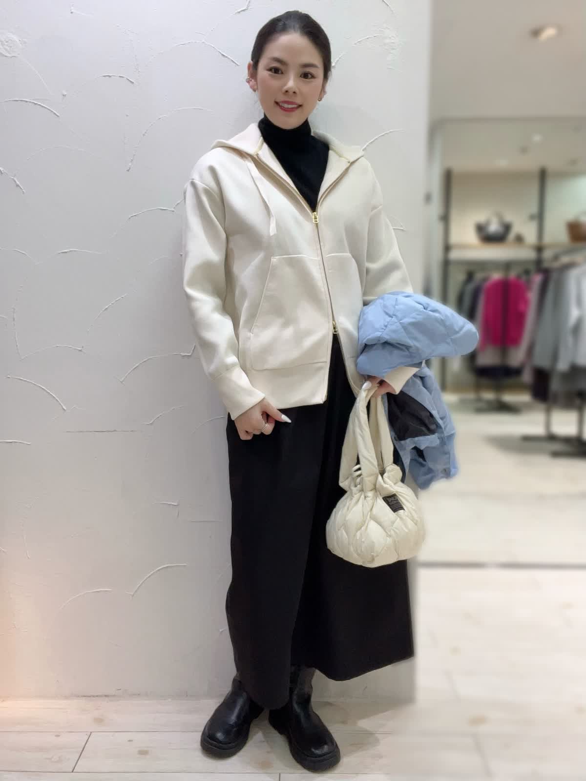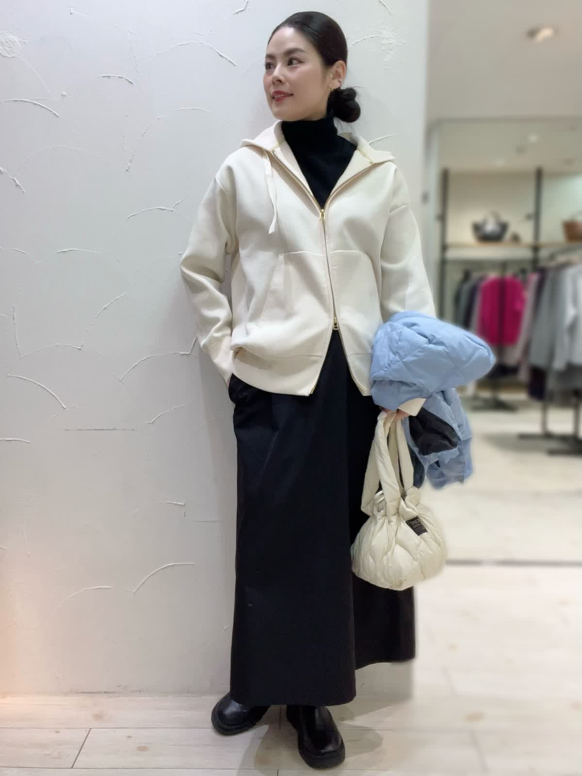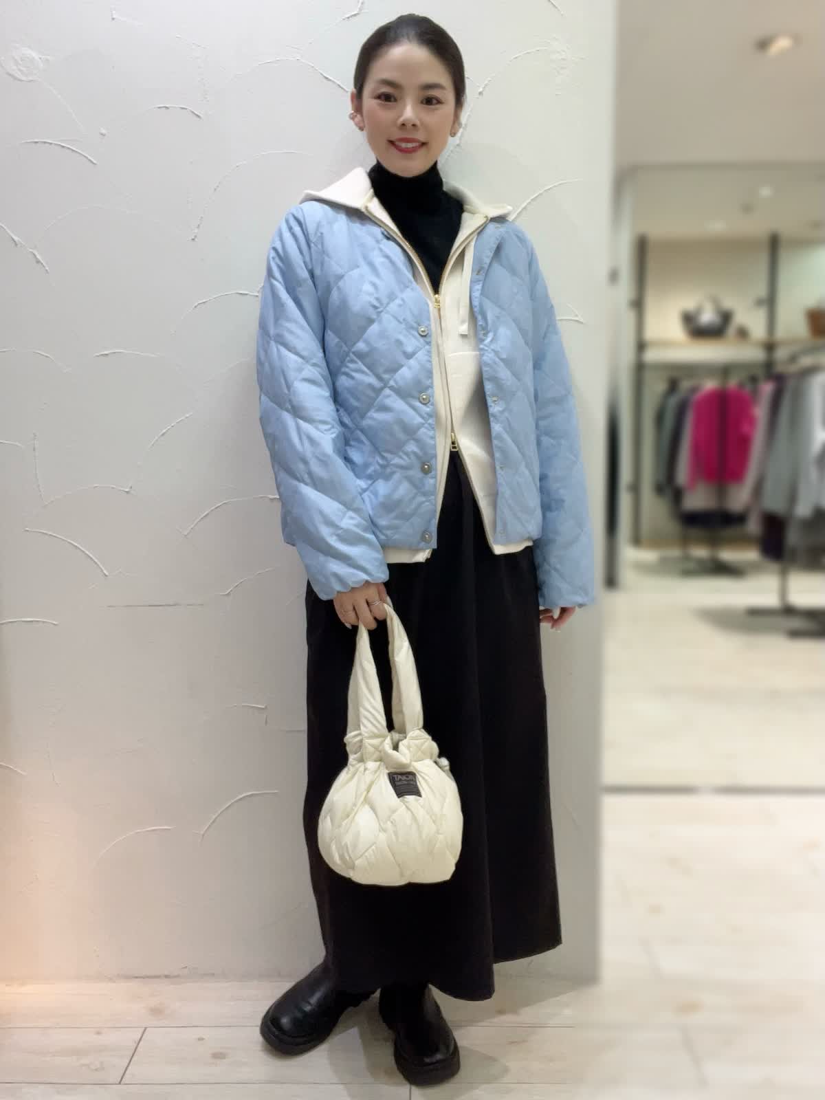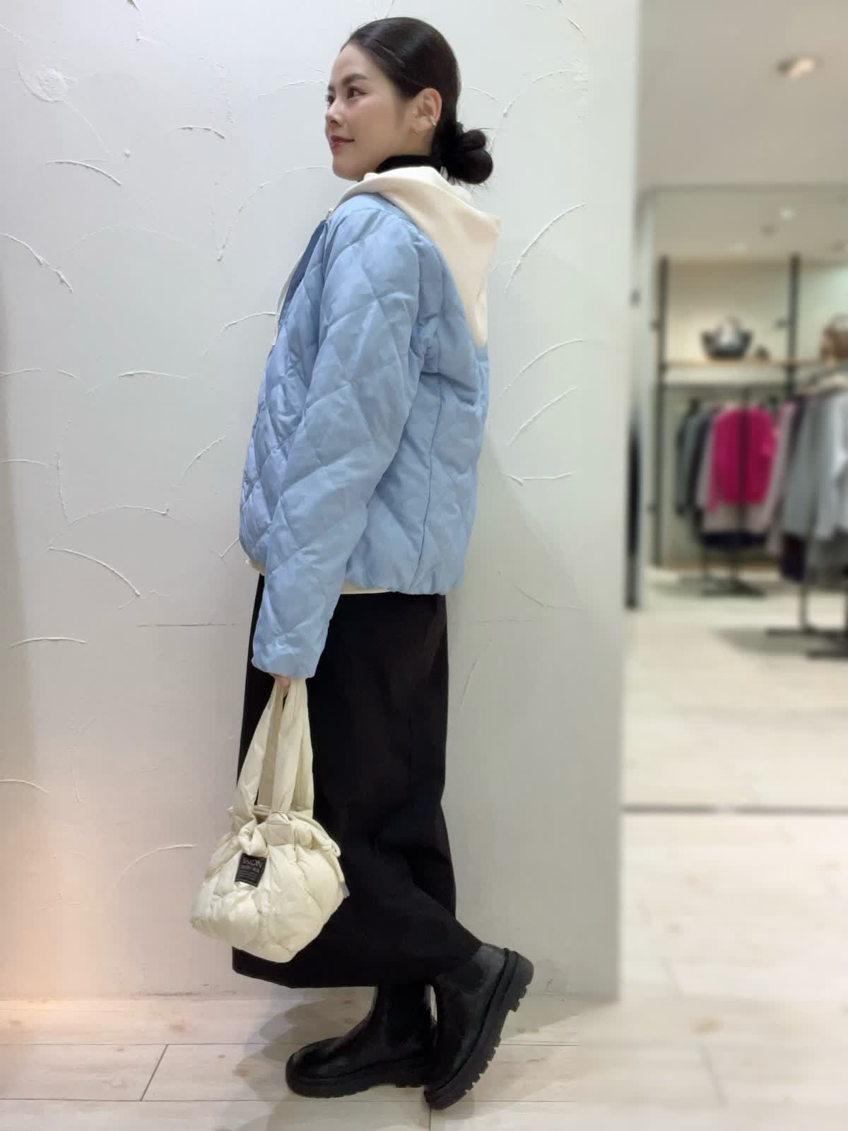 冬のお出かけカジュアルコーデ。サックスブルーがとても綺麗なTAIONコラボダウン。薄手で軽いデザインながらもしっかりと暖かい冬のアウターです。ジャケット感覚でお召しいただけるスッキリとした丈感もポイント。インナーにパーカーを合わせてカジュアルな雰囲気に仕上げました。