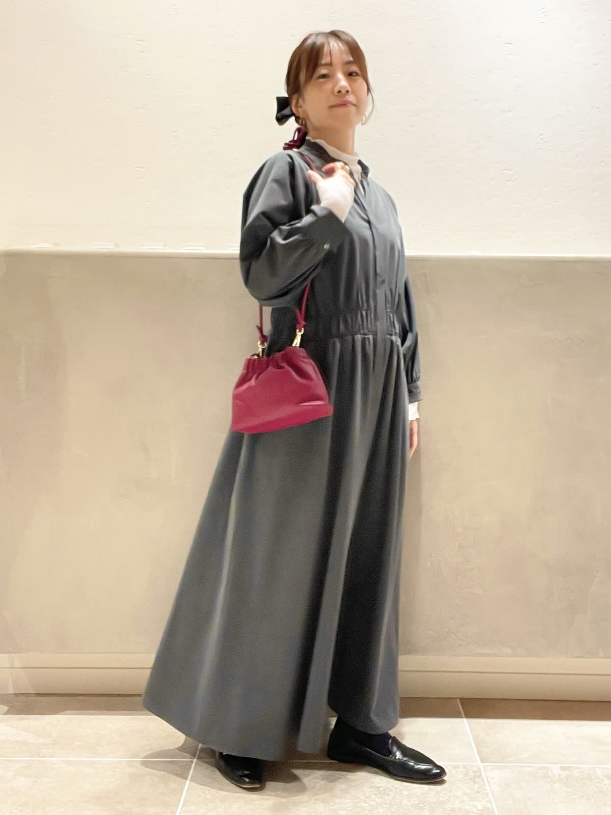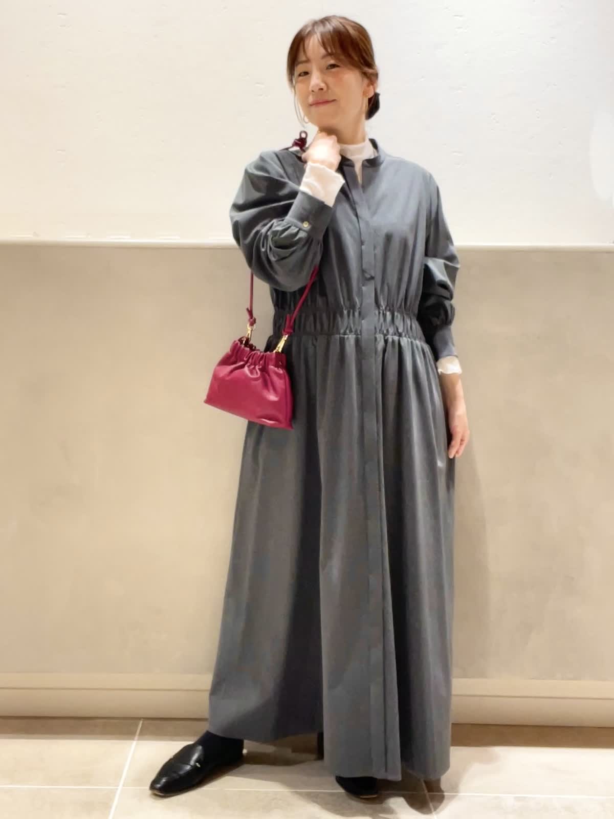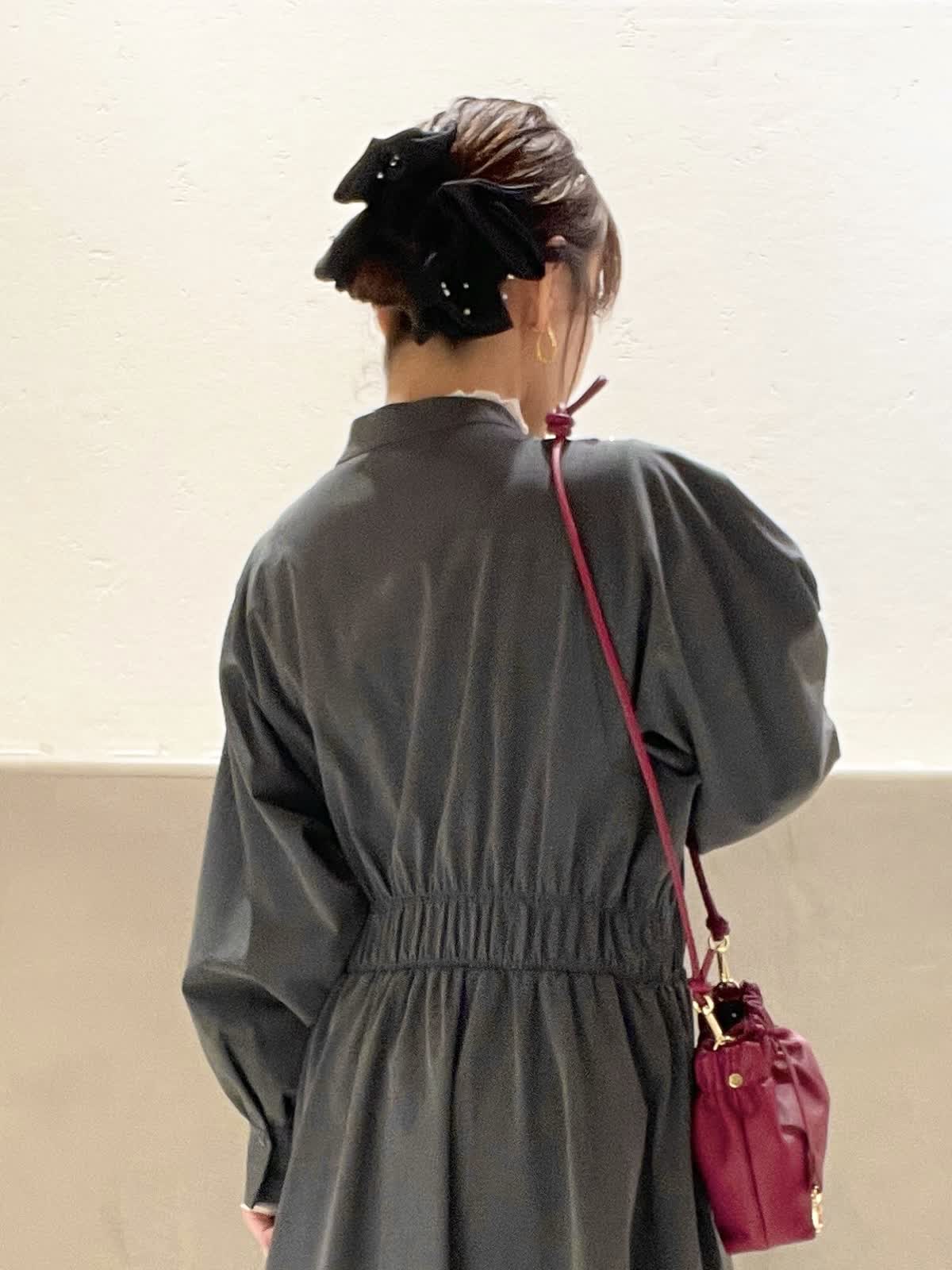 【着用アイテム:カラー/サイズ】 ワンピース:チャコールグレー/9号 カットソー:オフホワイト/9号 バッグ:ワイン ヘアクリップ:ソノタ 秋冬のお出かけに大活躍のチャコールグレーのワンピースに、インナーにシアー素材の白をプラスして、脱ほっこり。INNUEのバッグは華奢なショルダーとギャザーが可愛い。パールを施したTRESSのヘアクリップで華やかを出しました。