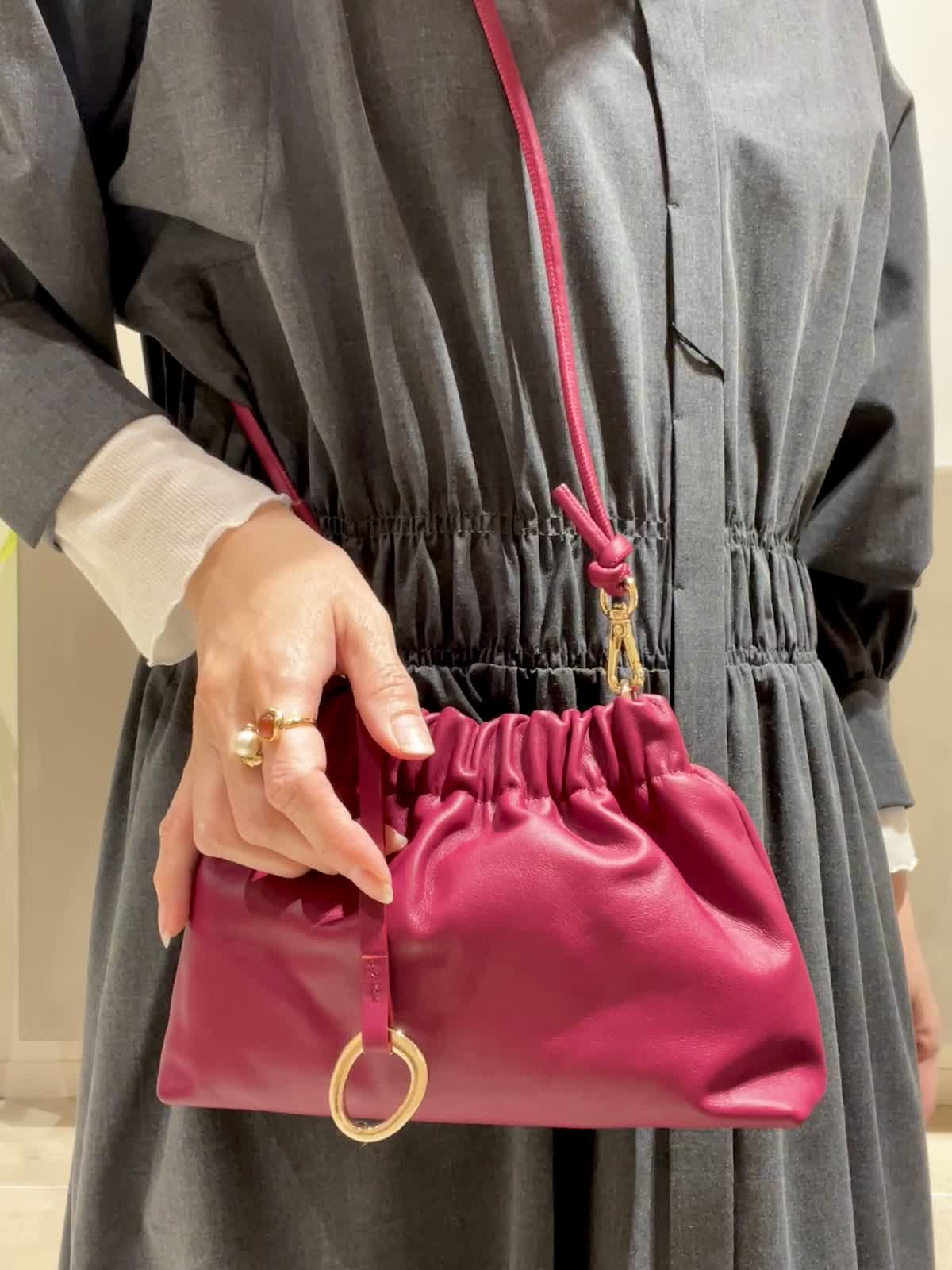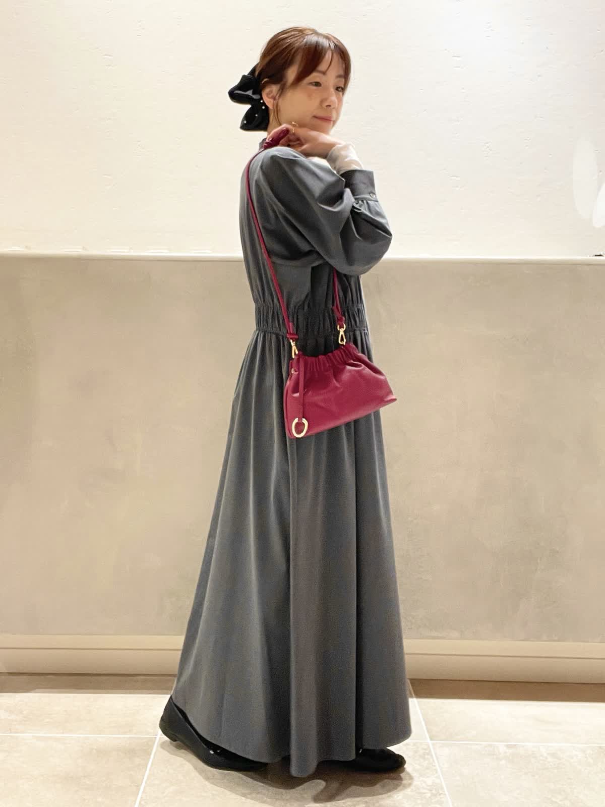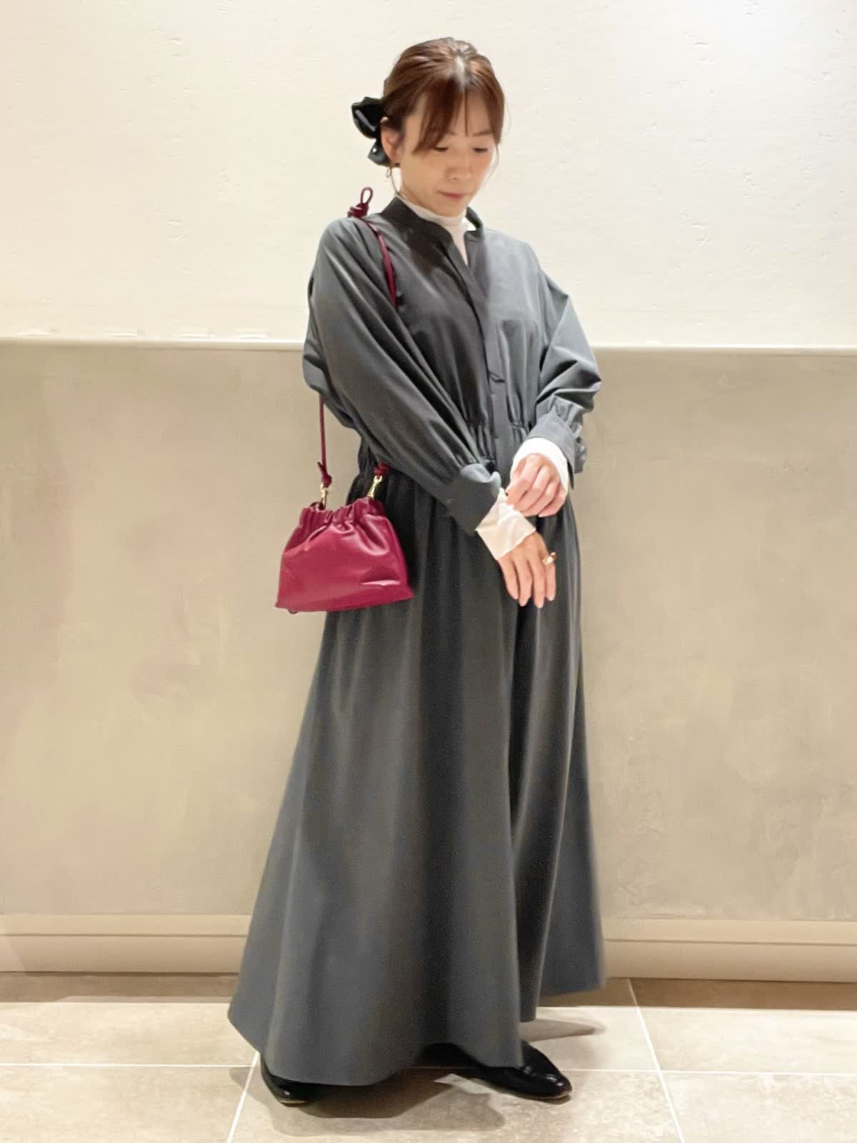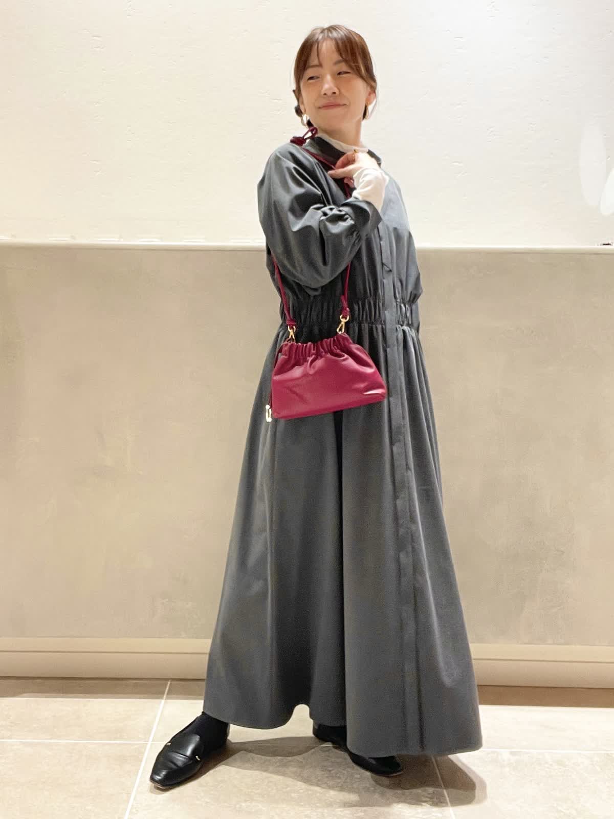 【着用アイテム:カラー/サイズ】 ワンピース:チャコールグレー/9号 カットソー:オフホワイト/9号 バッグ:ワイン ヘアクリップ:ソノタ 秋冬のお出かけに大活躍のチャコールグレーのワンピースに、インナーにシアー素材の白をプラスして、脱ほっこり。INNUEのバッグは華奢なショルダーとギャザーが可愛い。パールを施したTRESSのヘアクリップで華やかを出しました。