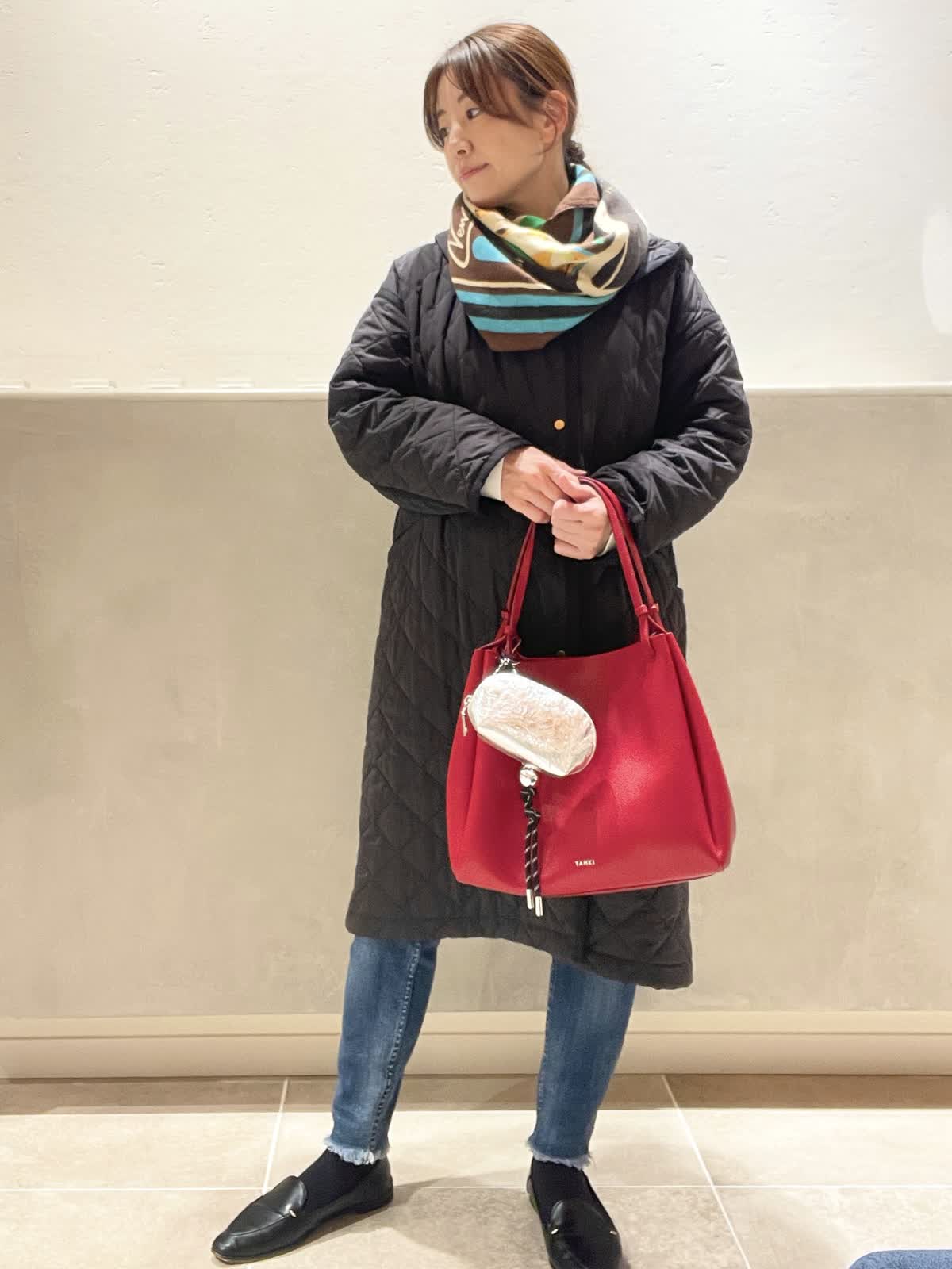 【着用アイテム:カラー】 バッグ:レッド ポーチ:シルバー ボールチャーム:シルバー ストール:ブラウン 冬のアウタースタイルに、YAHKIの赤のバッグを合わせました。タブレットや折りたたみ傘などの荷物がたっぷり入って軽く、ハンドルは長めなのでアウターを着ても持ちやすいです。チャームにもなるミニポーチは、ボールチャームと合わせてシルバーにして、ちょっぴりクリスマスモードにしてみました。