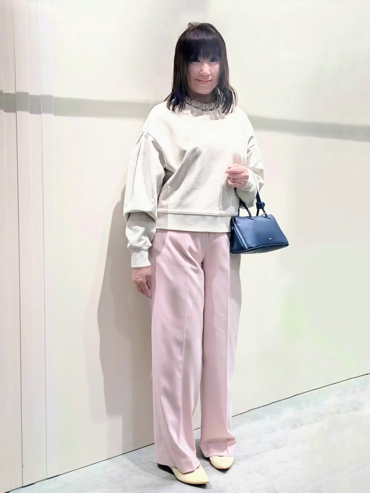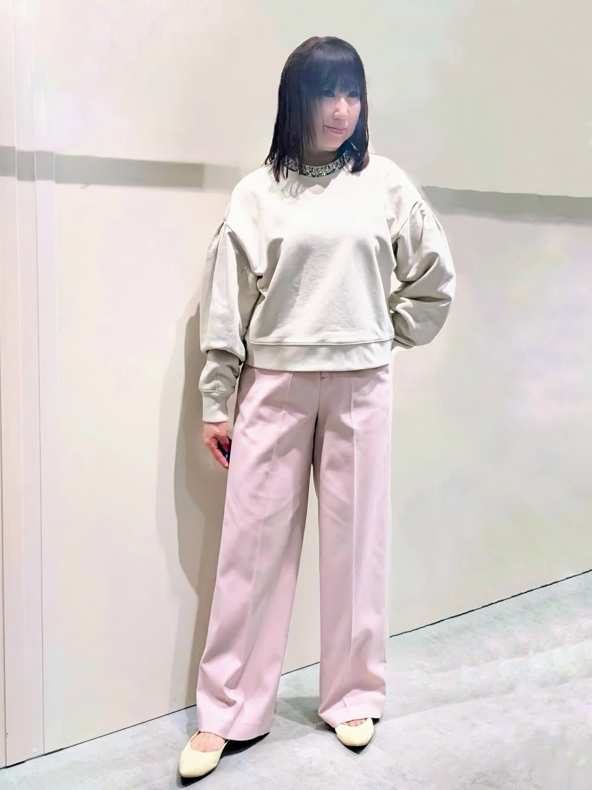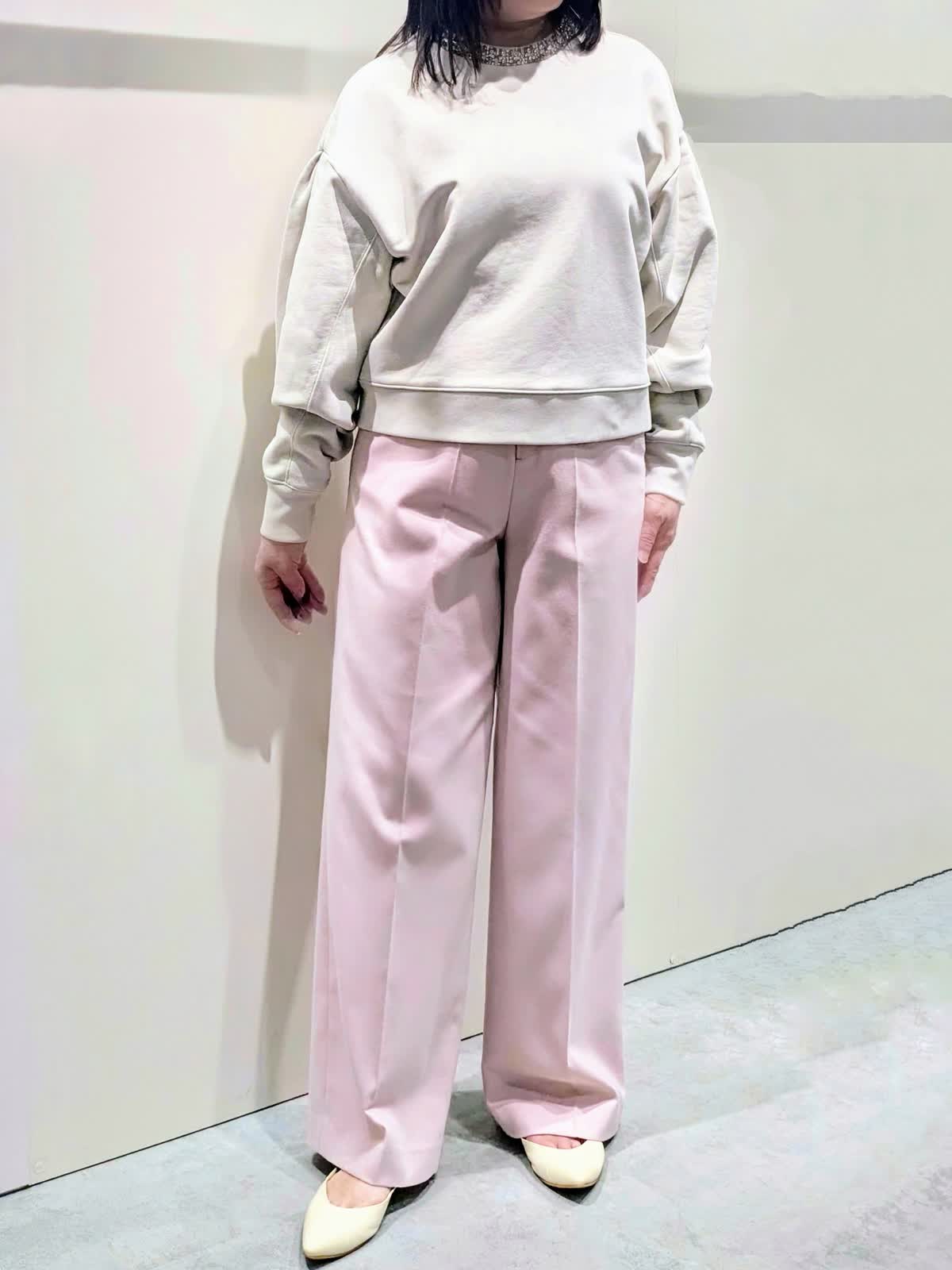 【着用サイズ】Pコート、プルオーバー:フリー パンツ:9号【着用カラー】Pコート:オフホワイト プルオーバー:グレーベージュ パンツ:ピンク パステルお出掛けコーディネート 襟元のビジュー使いが華やかなプルオーバーは、タックとギャザーで立体感を出した袖が女性らしさを演出してくれます。やや短めの丈感がスッキリ可愛く見せてくれ、ワイドシルエットでラフな着心地です。センタープレスのワイドシルエットパンツは、きちんと感もありつつ後ろゴム仕様でストレスフリーな穿き心地です。リラックス感のあるゆったりとしたサイズで、インナーを選ばず羽織って頂けます。