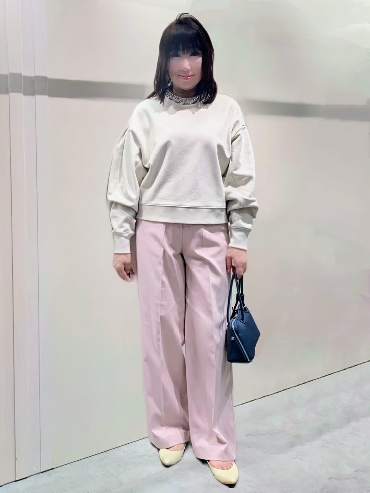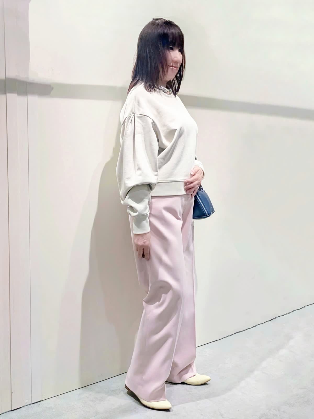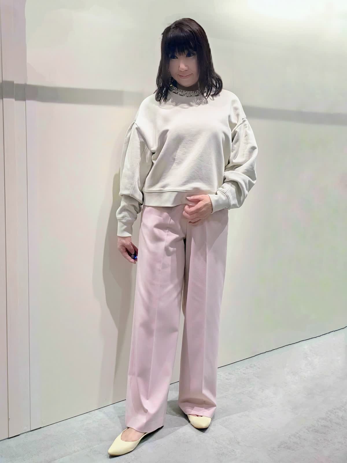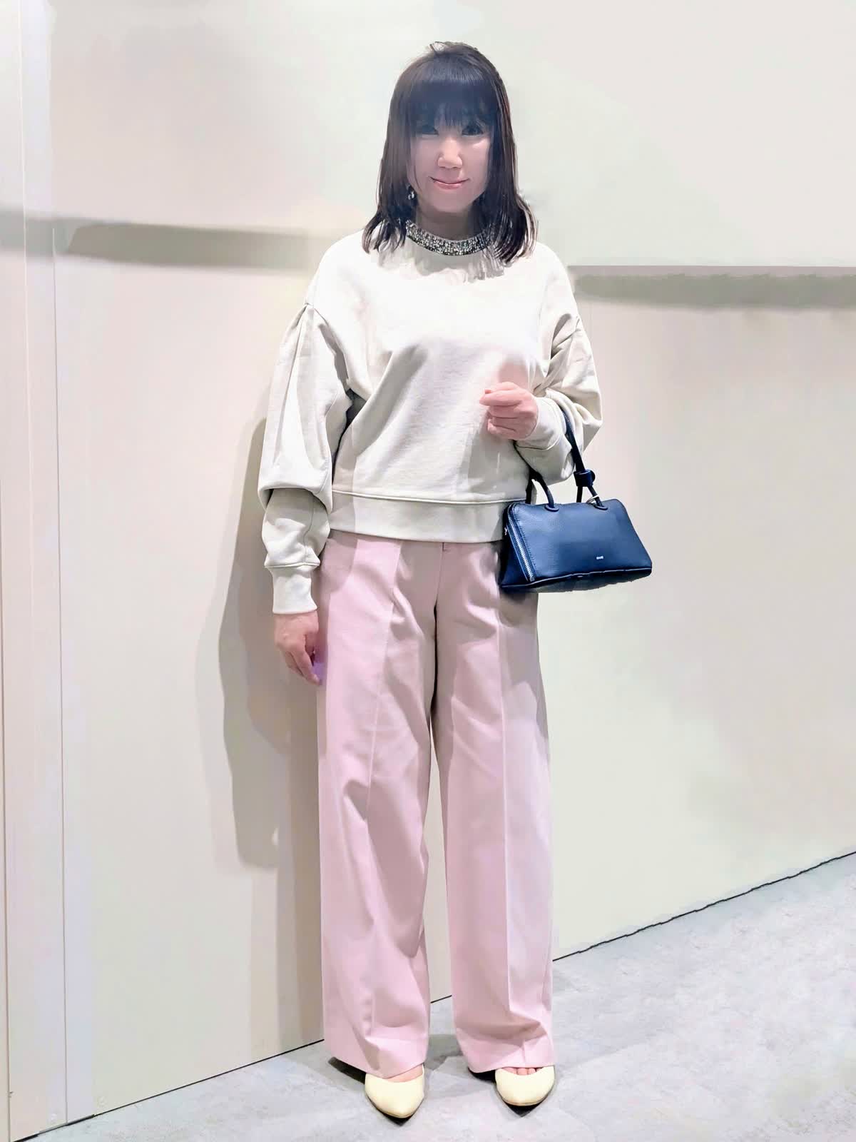 【着用サイズ】Pコート、プルオーバー:フリー パンツ:9号【着用カラー】Pコート:オフホワイト プルオーバー:グレーベージュ パンツ:ピンク パステルお出掛けコーディネート 襟元のビジュー使いが華やかなプルオーバーは、タックとギャザーで立体感を出した袖が女性らしさを演出してくれます。やや短めの丈感がスッキリ可愛く見せてくれ、ワイドシルエットでラフな着心地です。センタープレスのワイドシルエットパンツは、きちんと感もありつつ後ろゴム仕様でストレスフリーな穿き心地です。リラックス感のあるゆったりとしたサイズで、インナーを選ばず羽織って頂けます。