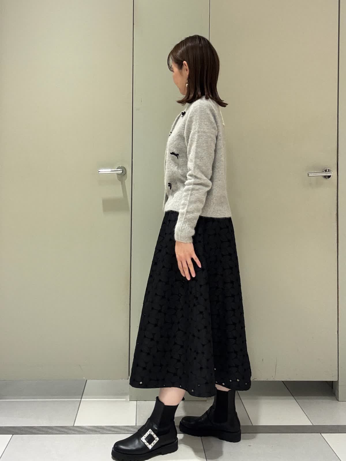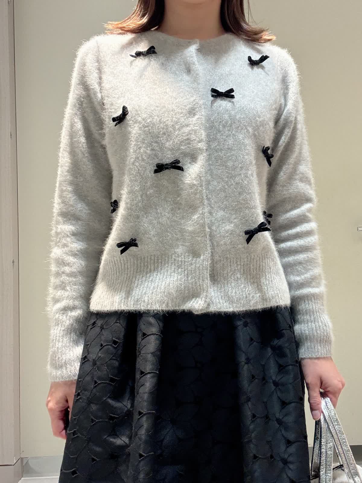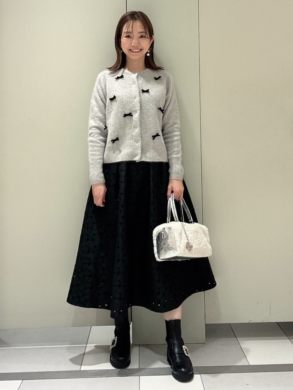 【着用サイズ/カラー】カーディガン:9号/グレー スカート:9号/ブラック 冬に着たいコーディネート フォックスニットにベロアリボンが可愛いカーディガンにレースのスカートを合わせました。 サイズはどちらともいつものサイズで大丈夫です。