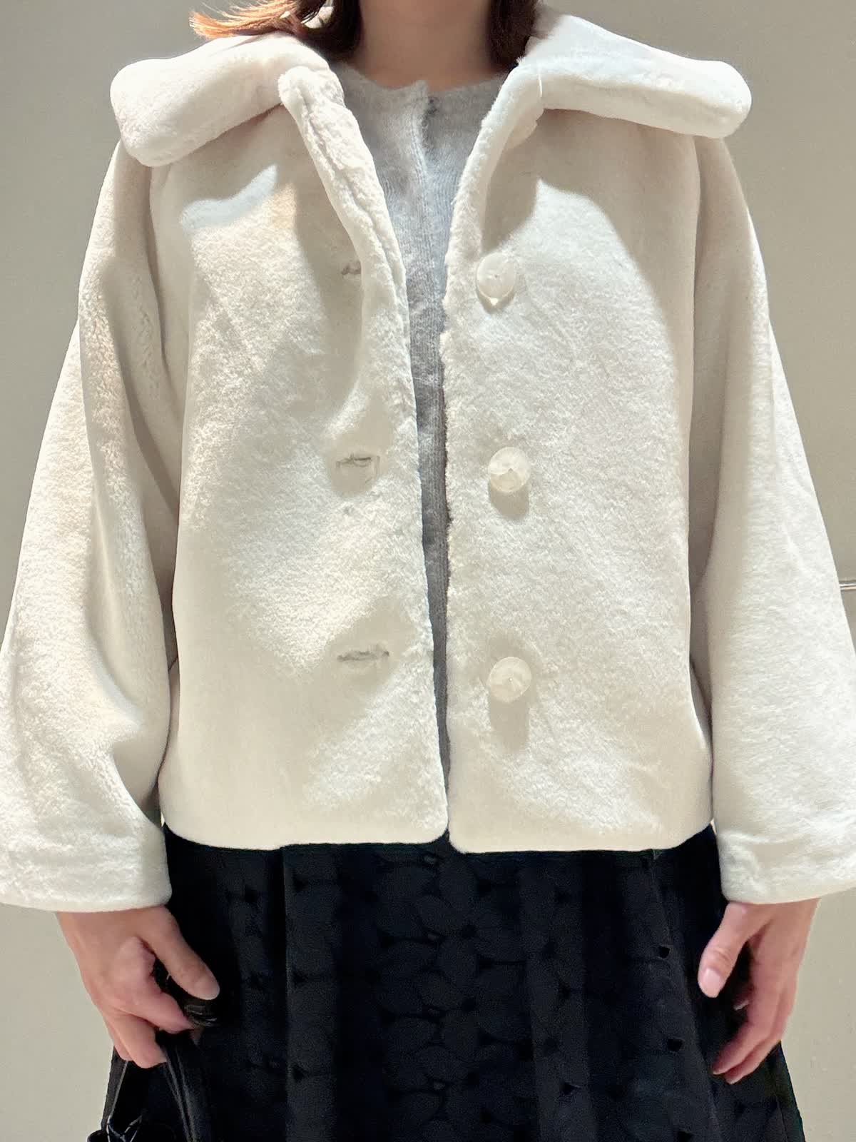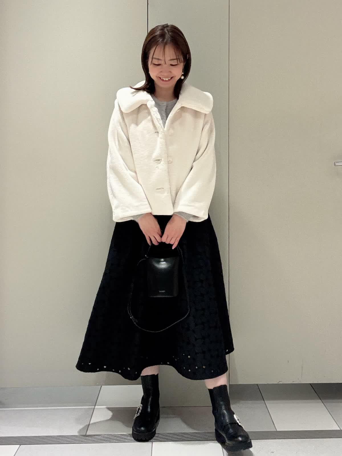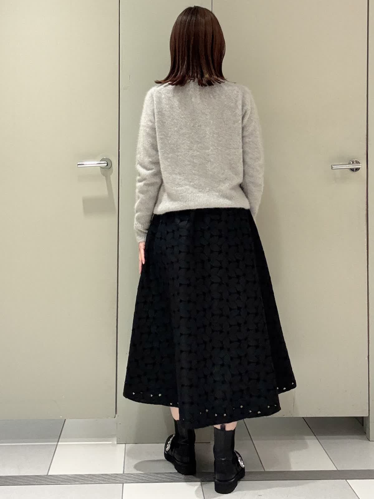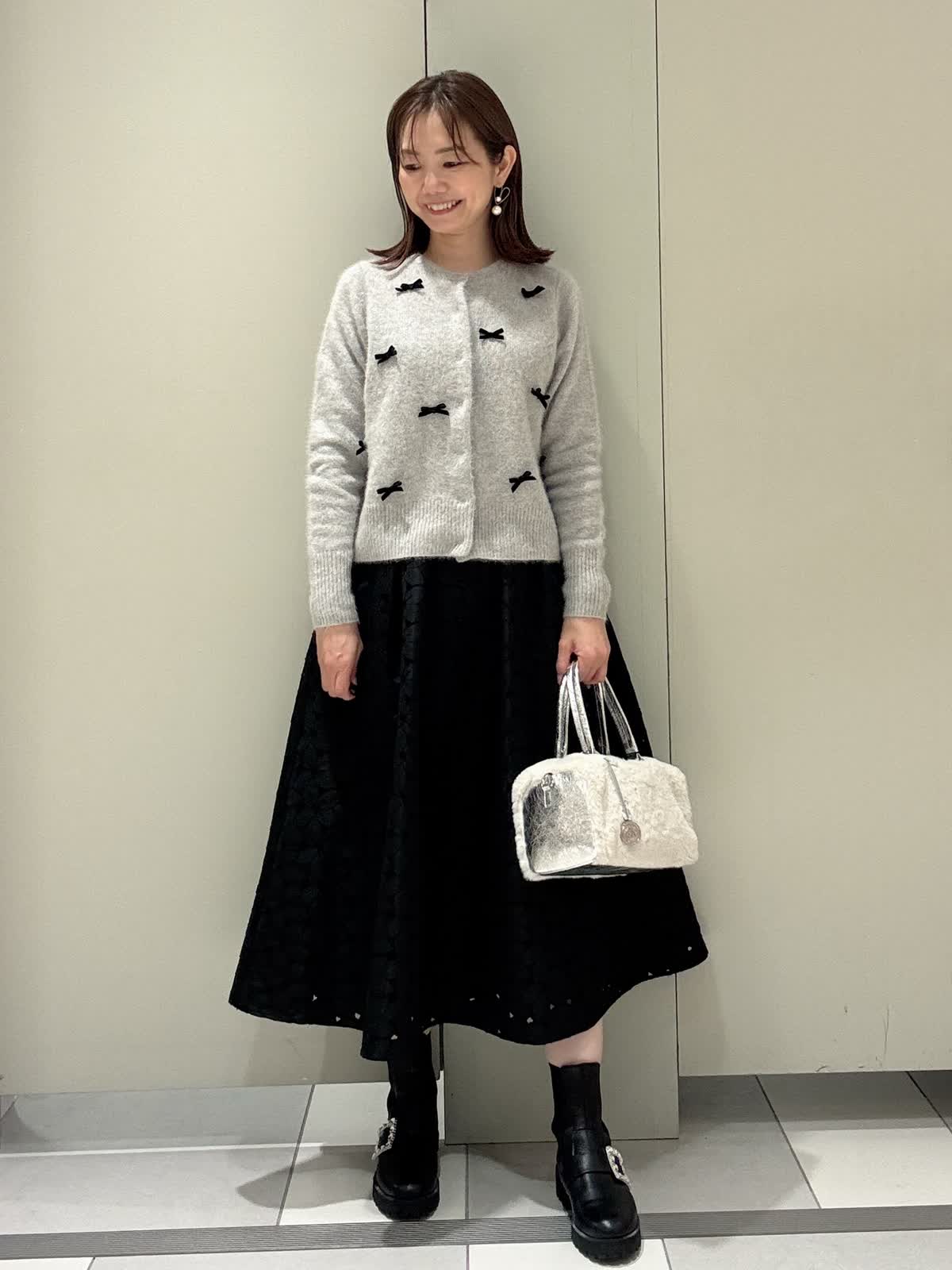 【着用サイズ/カラー】カーディガン:9号/グレー スカート:9号/ブラック 冬に着たいコーディネート フォックスニットにベロアリボンが可愛いカーディガンにレースのスカートを合わせました。 サイズはどちらともいつものサイズで大丈夫です。