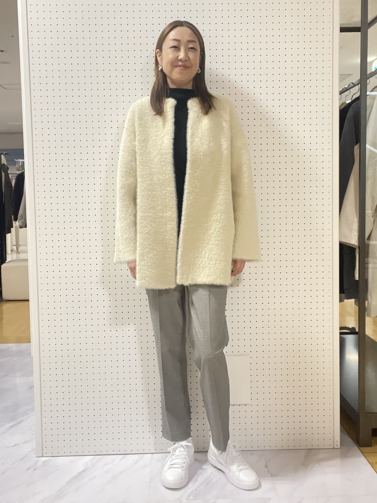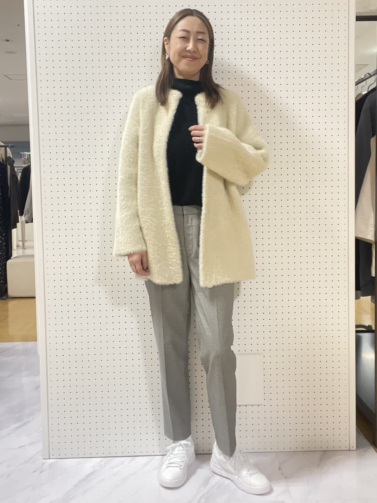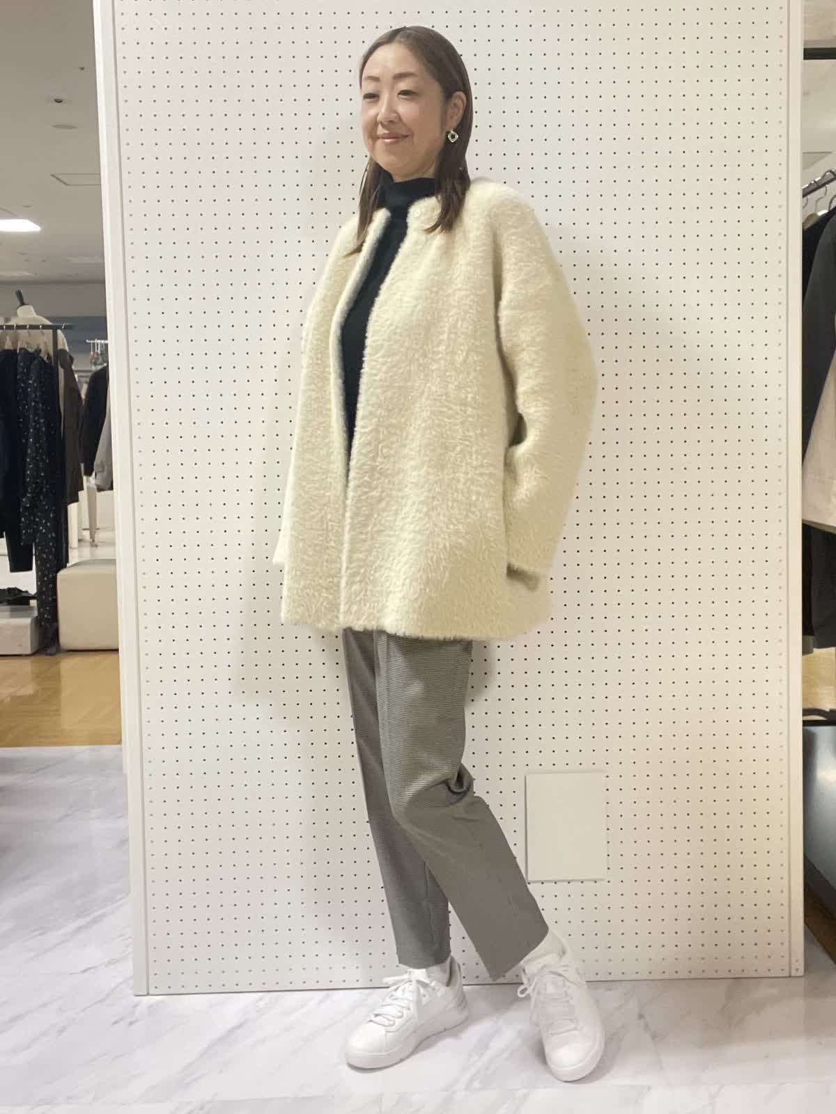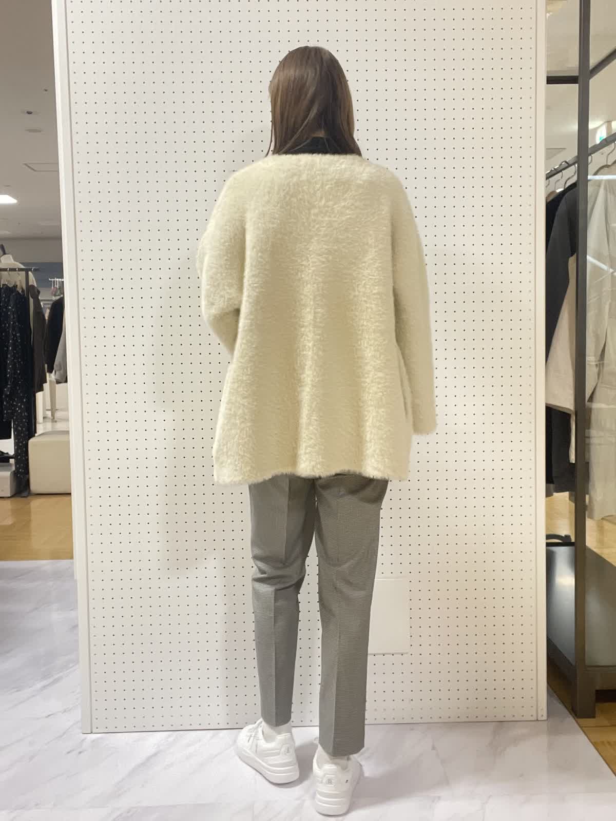 【着用サイズ】コーディガン:フリーニット、パンツ共に9号【着用カラー】コーディガン:アイボリー ニット:ブラック パンツ:チドリ 綺麗めカジュアルスタイル ヒップまですっぽりかくれる、たっぷりとしたシルエットでこなれ感を演出。スポーティラインにも羽織るだけで華やかさをプラスできる優れもの軽アウター!