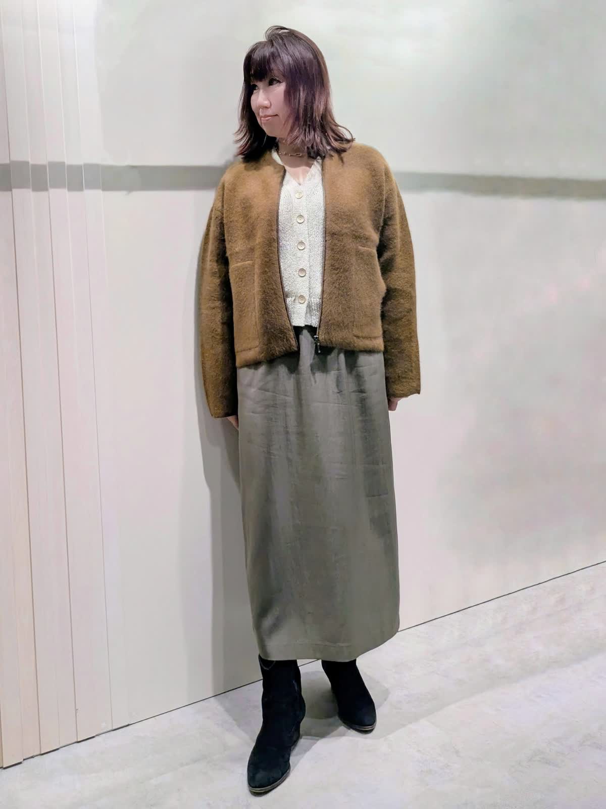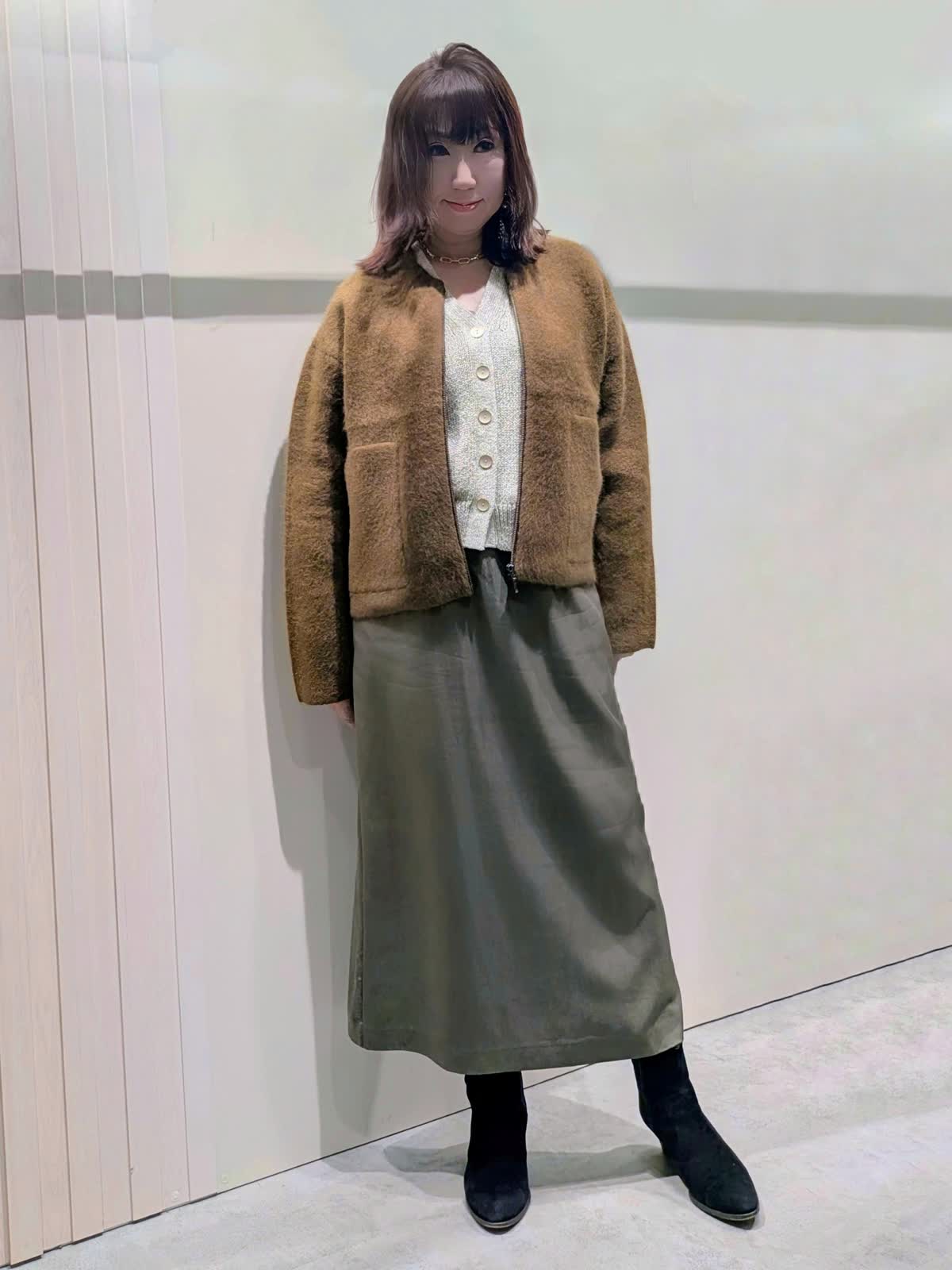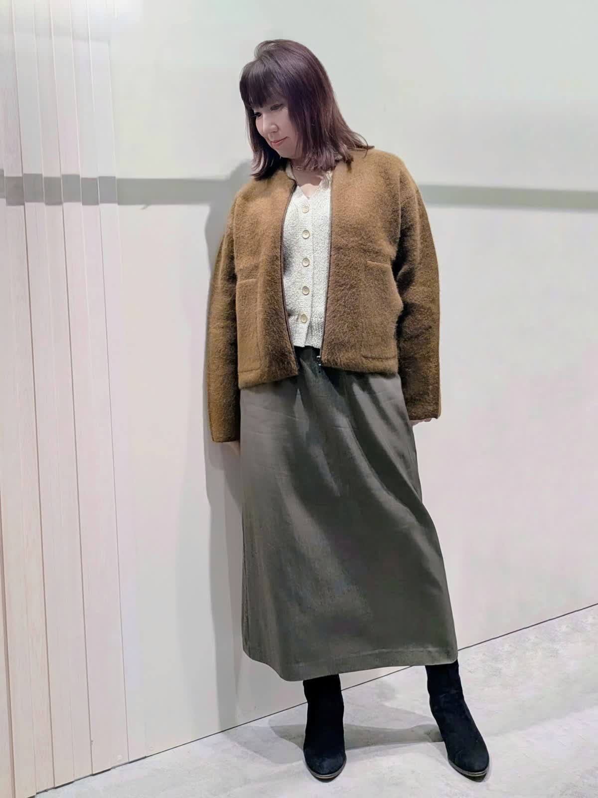 【着用サイズ】ニットブルゾン、カーディガン:フリー スカート:9号【着用カラー】ニットブルゾン:ブラウン カーディガン:アイボリー スカート:カーキ 冬のお出掛けコーディネート 軽やかな着心地のニットジャケットは、ムートンの様な温かさで大きすぎず着ぶくれもしにくくです。大き過ぎないサイズ感でコートのインナーにもご利用でき、長いシーズン活用できるアイテムです。繊細なラメがきらめくカーディガンは、程よいゆとりのあるシルエットで、抜け感のある着こなしが楽しめます。メタルボタンもアクセントに…ベルト付きAラインスカートは、すっきり見えで身体のラインを拾いません。ウエスト後ろファスナーゴム仕様で楽にはけて、細ベルトがオールインでもアクセントになります。