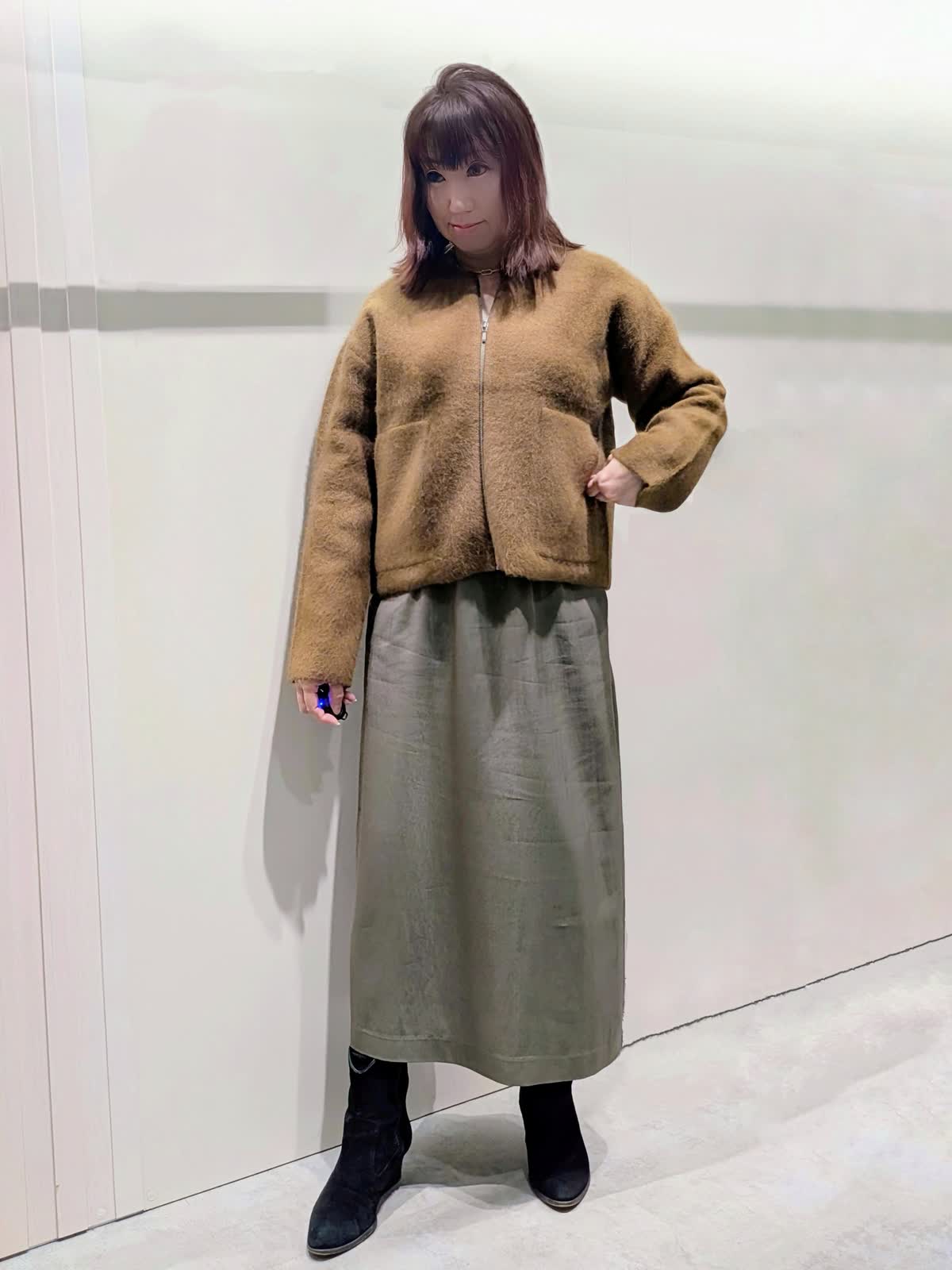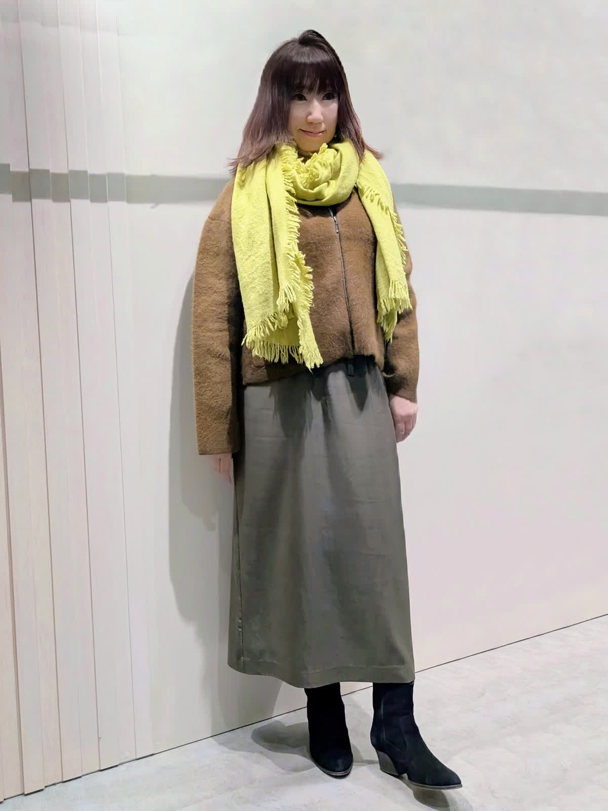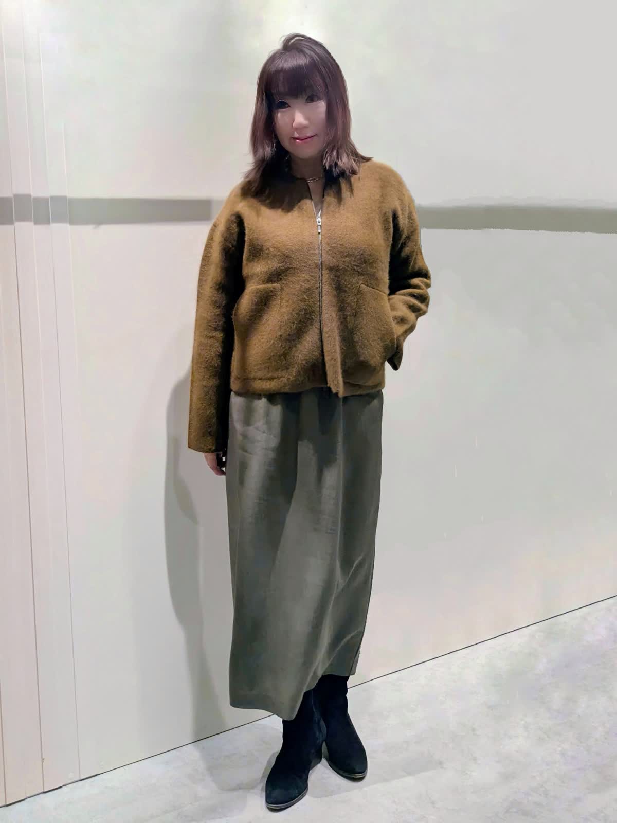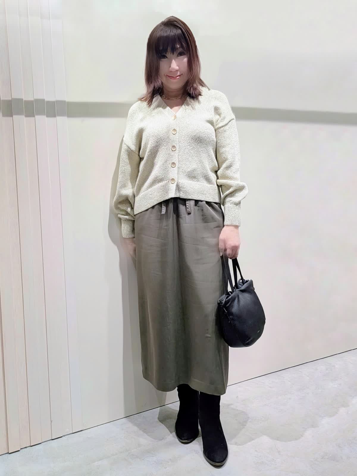 【着用サイズ】ニットブルゾン、カーディガン:フリー スカート:9号【着用カラー】ニットブルゾン:ブラウン カーディガン:アイボリー スカート:カーキ 冬のお出掛けコーディネート 軽やかな着心地のニットジャケットは、ムートンの様な温かさで大きすぎず着ぶくれもしにくくです。大き過ぎないサイズ感でコートのインナーにもご利用でき、長いシーズン活用できるアイテムです。繊細なラメがきらめくカーディガンは、程よいゆとりのあるシルエットで、抜け感のある着こなしが楽しめます。メタルボタンもアクセントに…ベルト付きAラインスカートは、すっきり見えで身体のラインを拾いません。ウエスト後ろファスナーゴム仕様で楽にはけて、細ベルトがオールインでもアクセントになります。