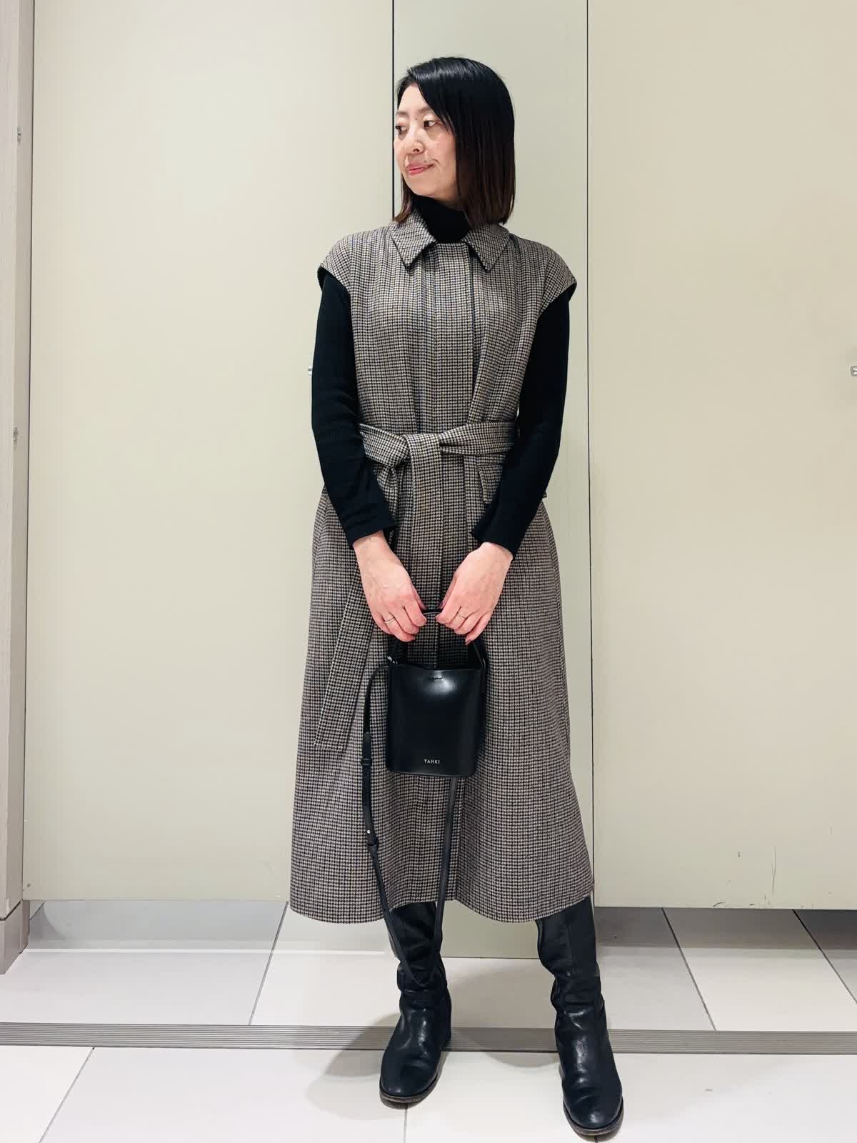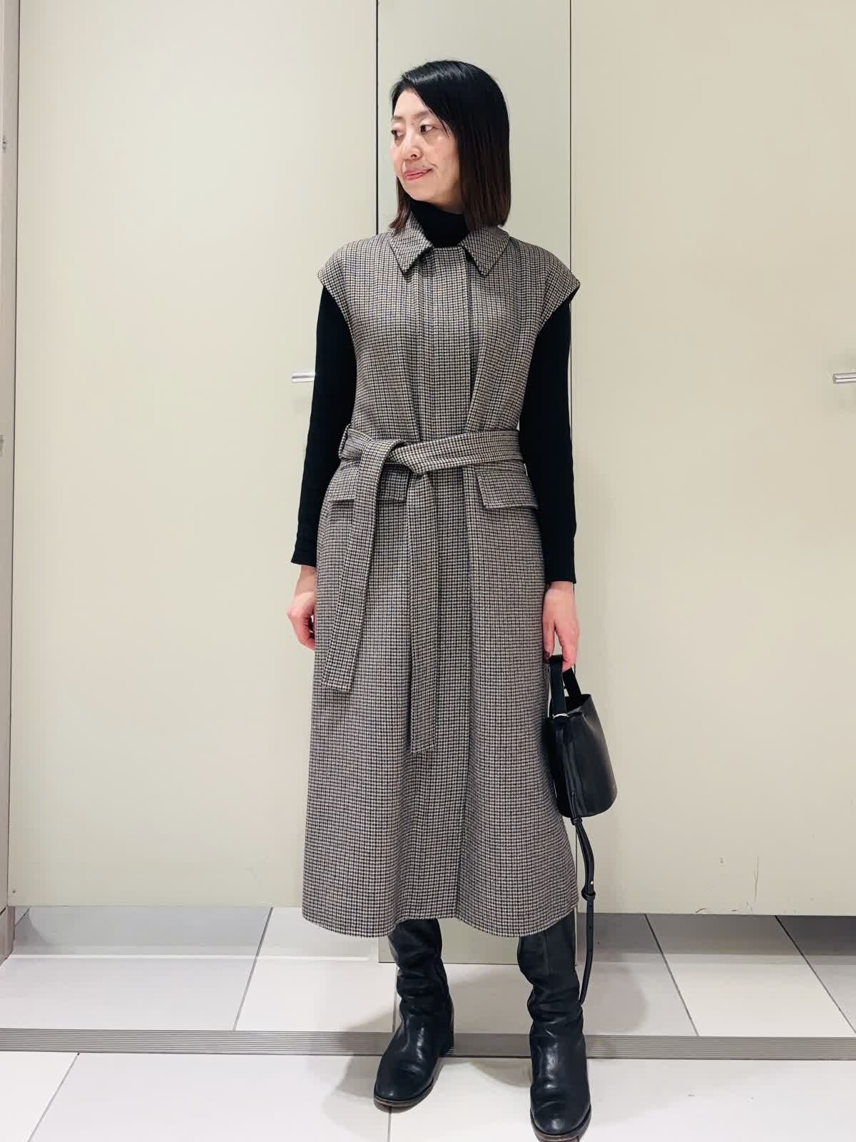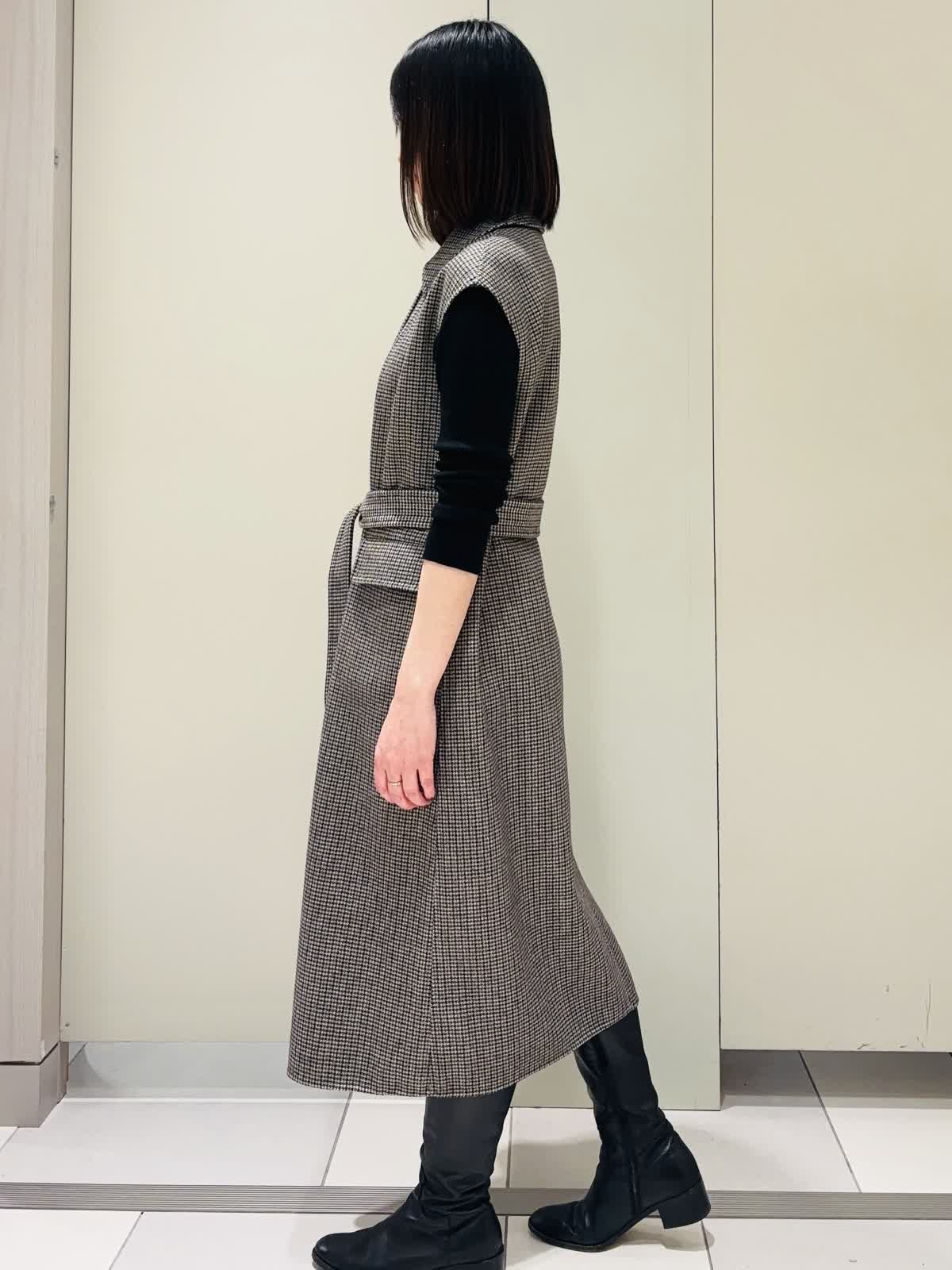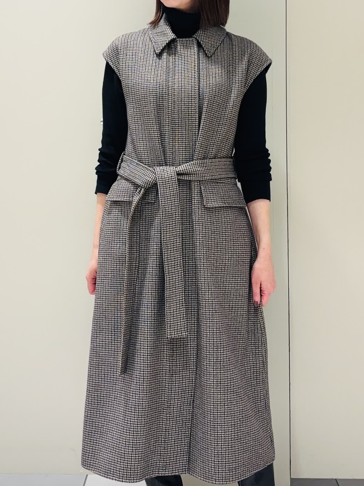 【着用サイズ】ジレ:7号 ニット:9号 【着用カラー】ジレ:柄小 ニット:ブラック ダブルフェイス生地のロングジレをワンピースとして着てみました。少し厚みのある生地で暖かく、フレンチスリーブとベルトがポイント。 パンツやスカートを合わせてジレとしてタイツやロングブーツを合わせてワンピースとして活躍します。