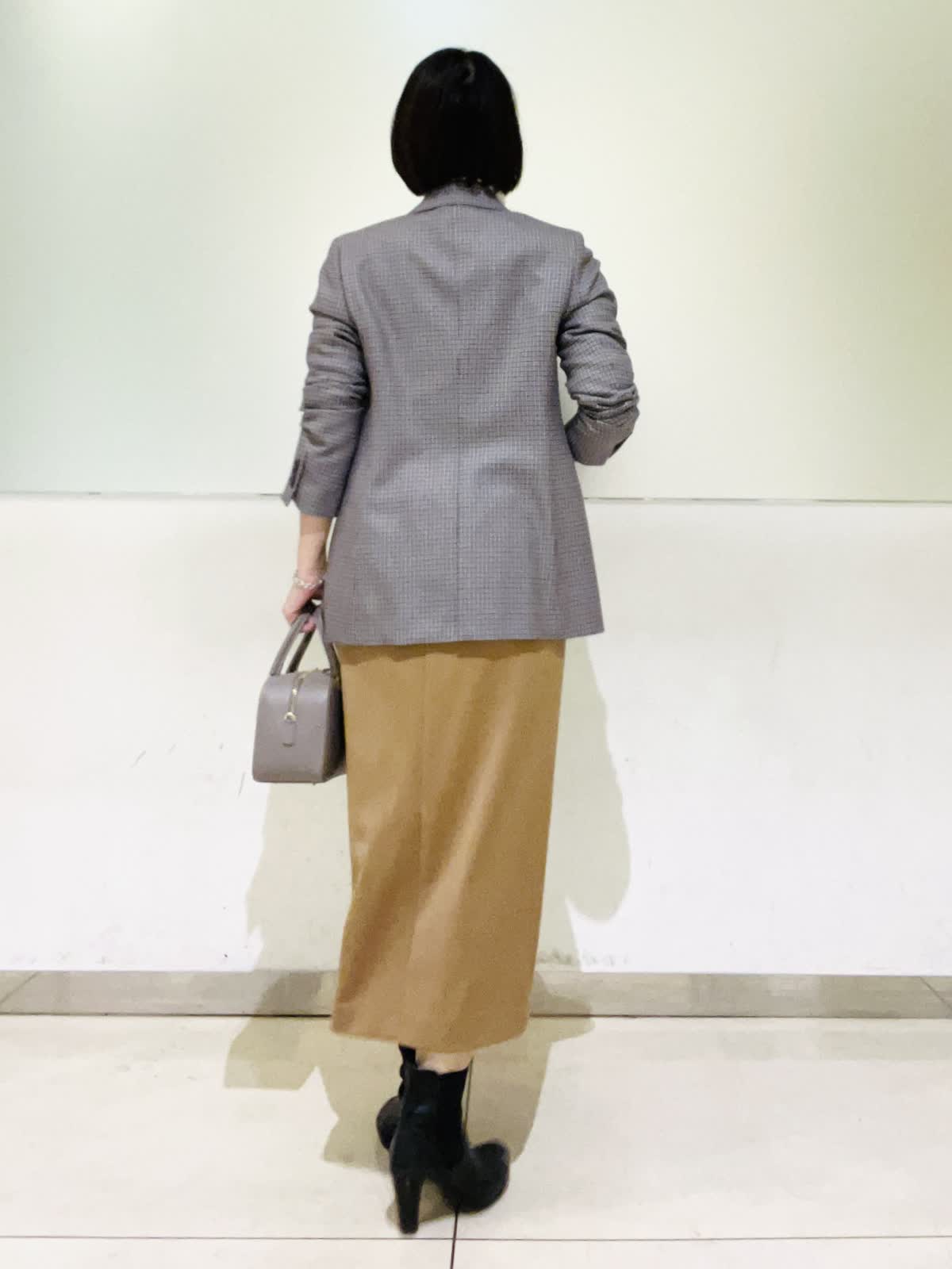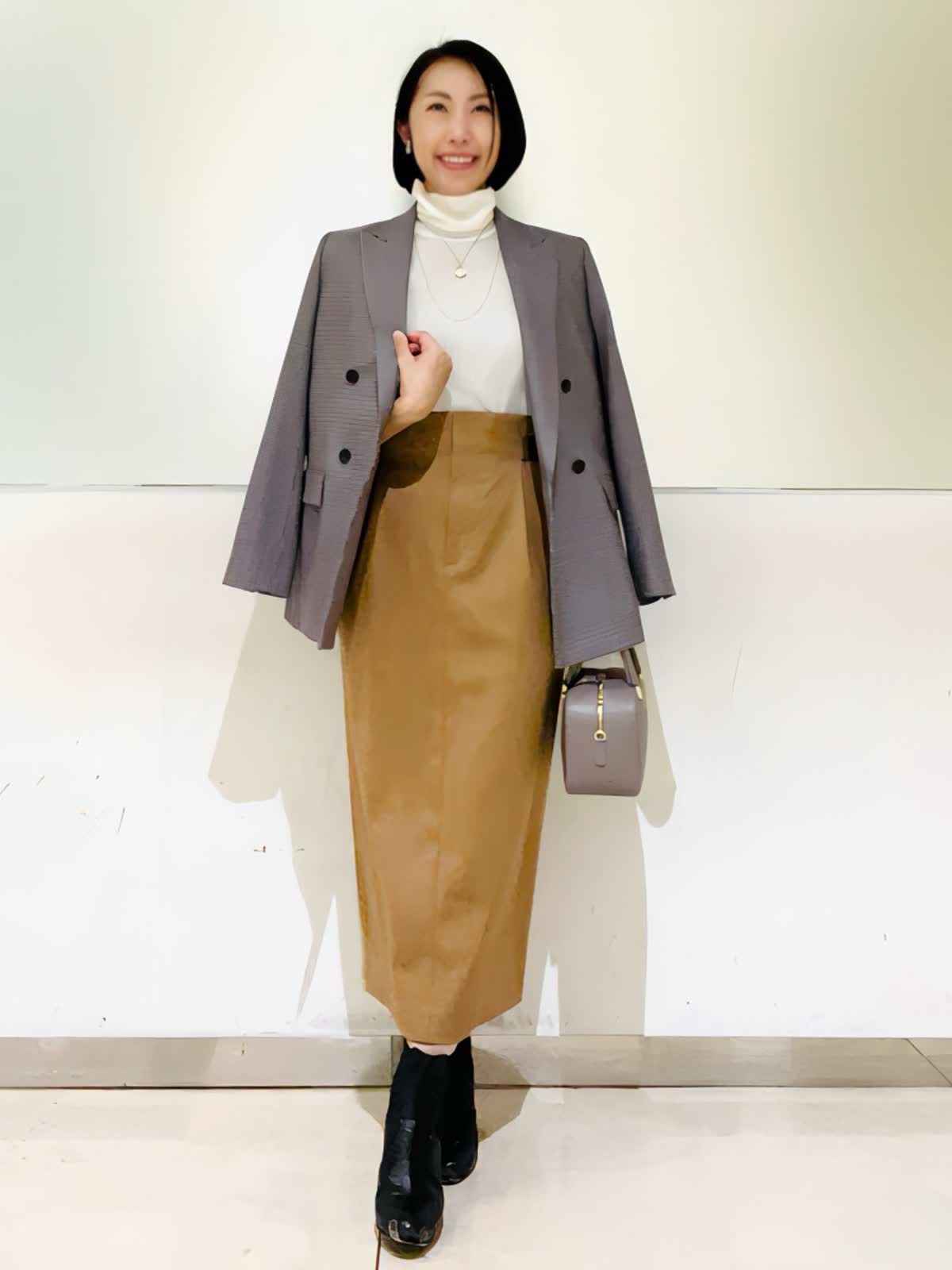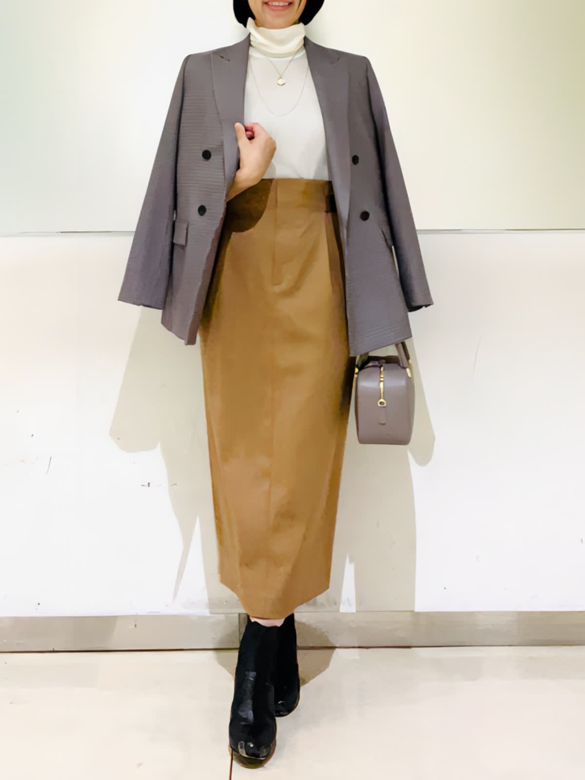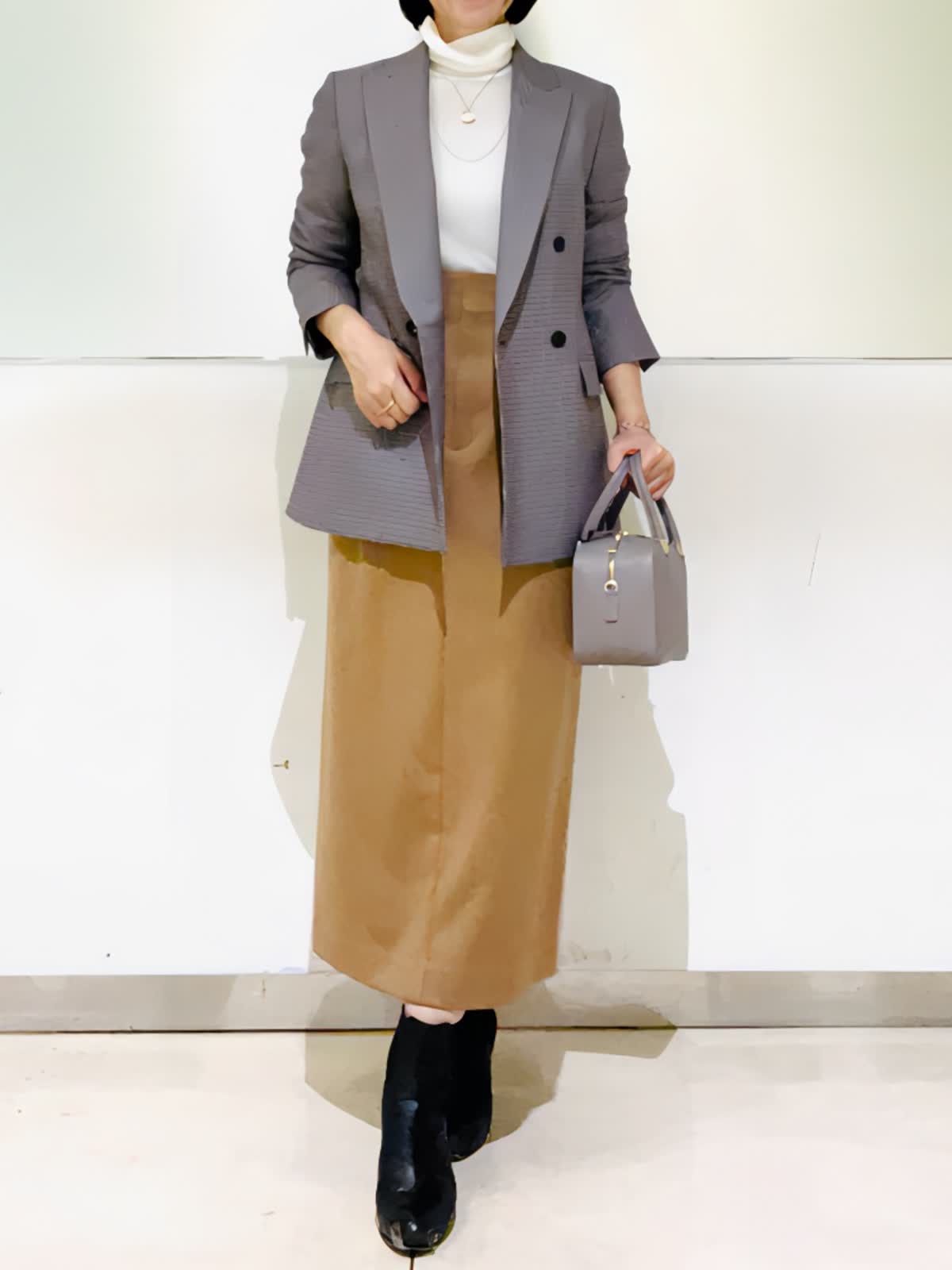 【着用アイテム】すべて9号 【着用カラー】ジャケット:グレンチェック ニット:グレーベージュ スカート:キャメル オフィスカジュアルにも使えるコーディネート。グレンチェックのジャケットは羽織るだけでおしゃれな雰囲気。きちんと感も出るのでオフィスにもおすすめです。合わせたタイトスカートは光沢のあるキャメルが上品な雰囲気。体のラインが出過ぎない絶妙なシルエットです。