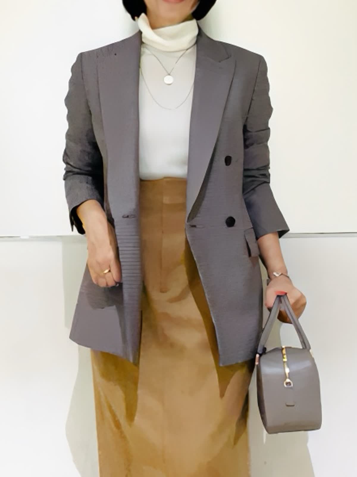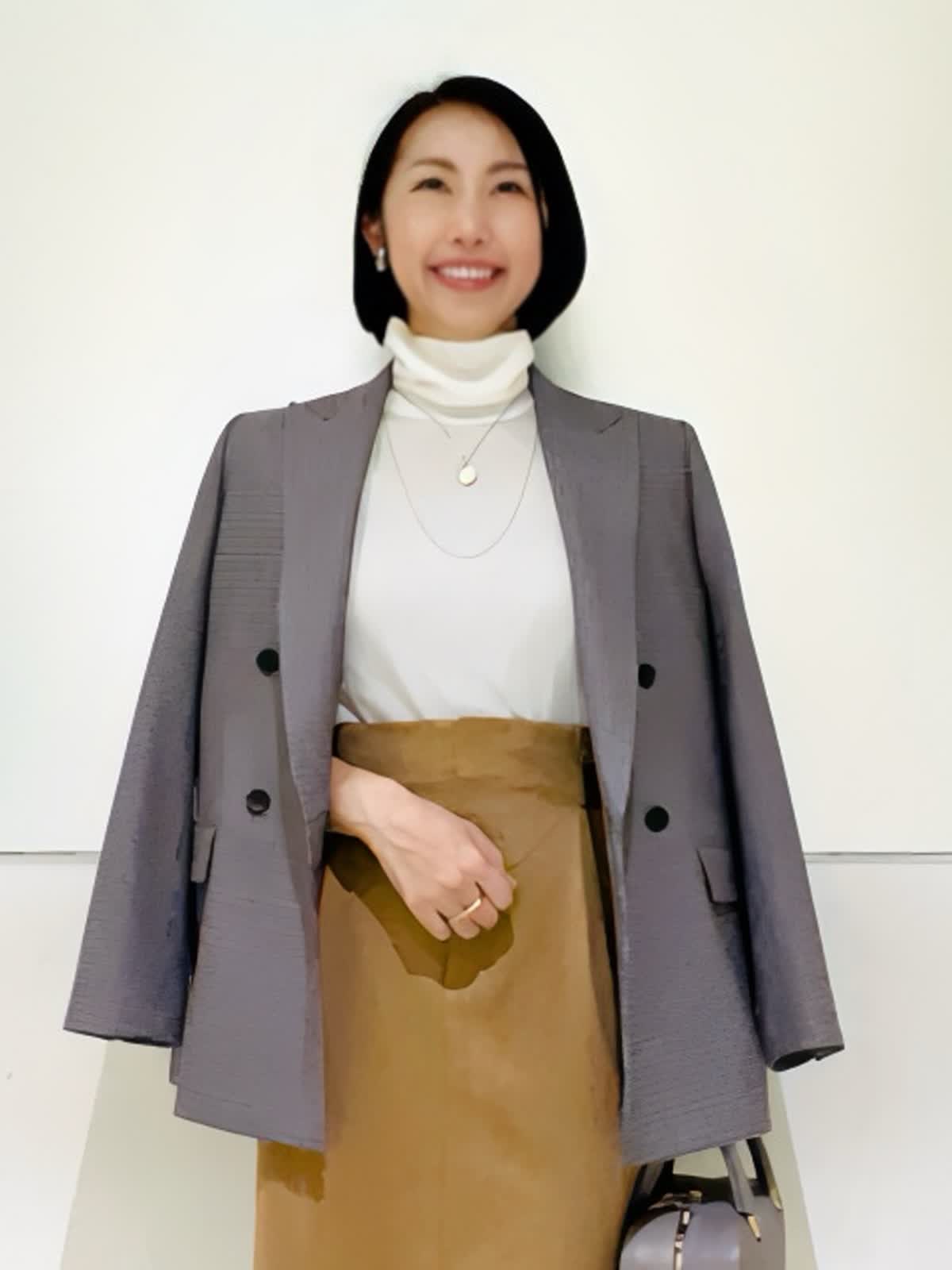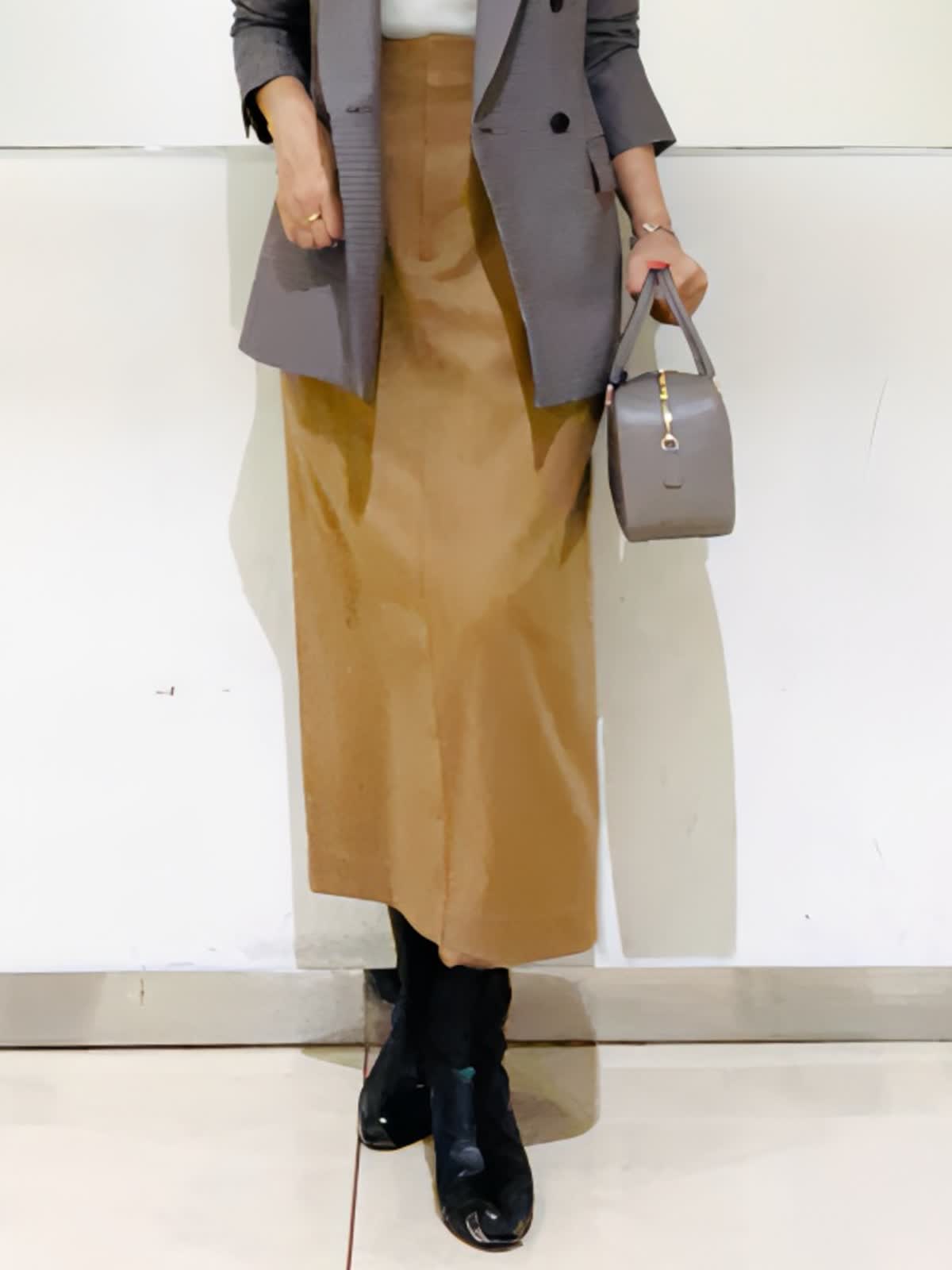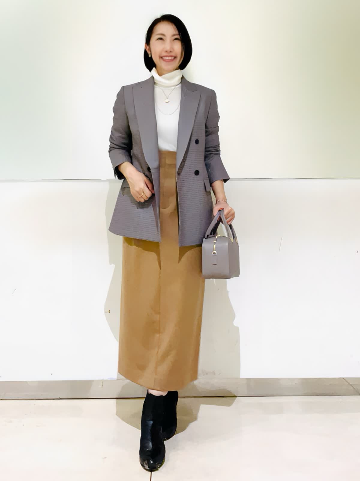 【着用アイテム】すべて9号 【着用カラー】ジャケット:グレンチェック ニット:グレーベージュ スカート:キャメル オフィスカジュアルにも使えるコーディネート。グレンチェックのジャケットは羽織るだけでおしゃれな雰囲気。きちんと感も出るのでオフィスにもおすすめです。合わせたタイトスカートは光沢のあるキャメルが上品な雰囲気。体のラインが出過ぎない絶妙なシルエットです。