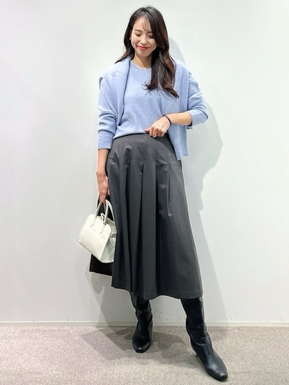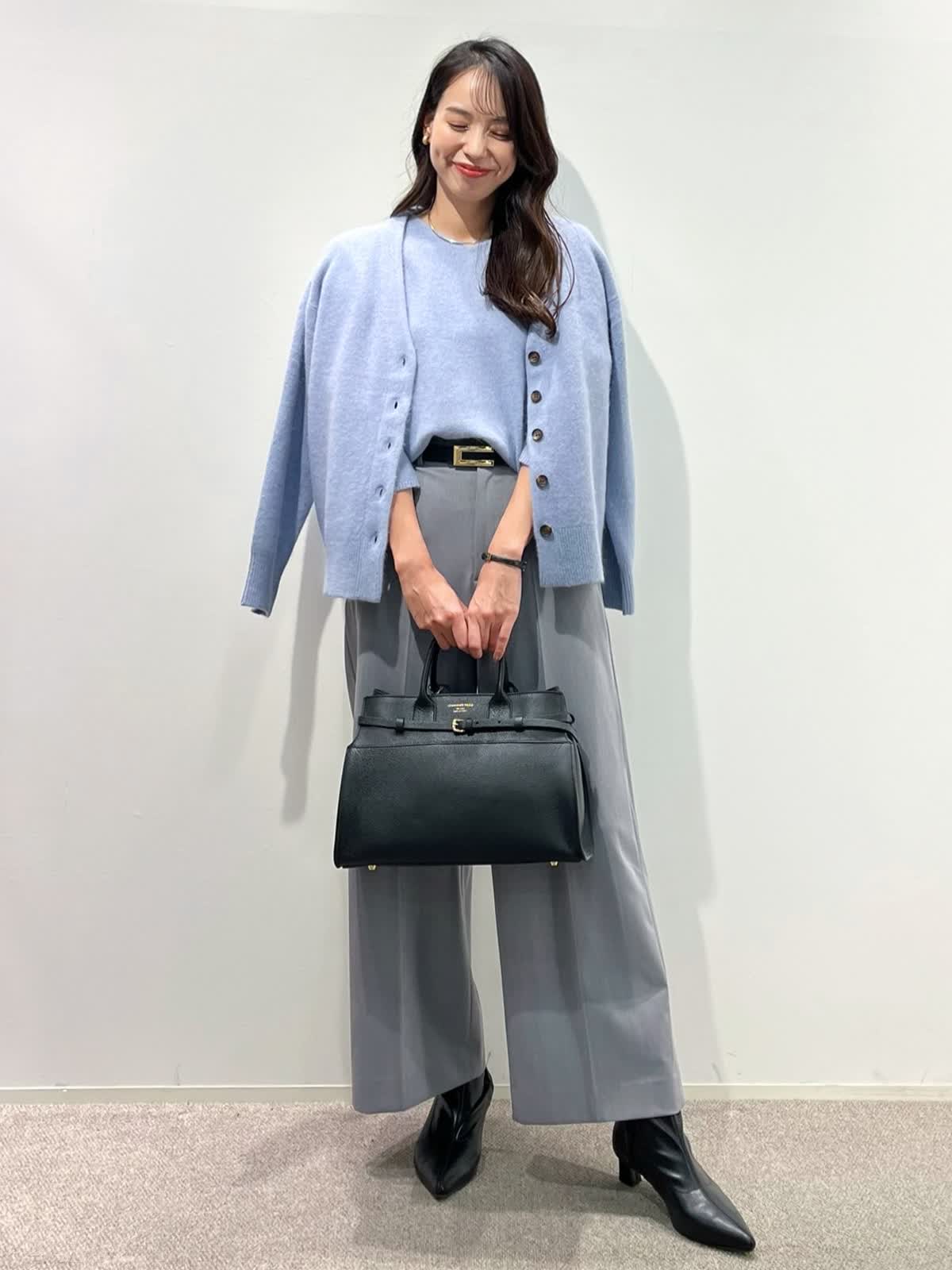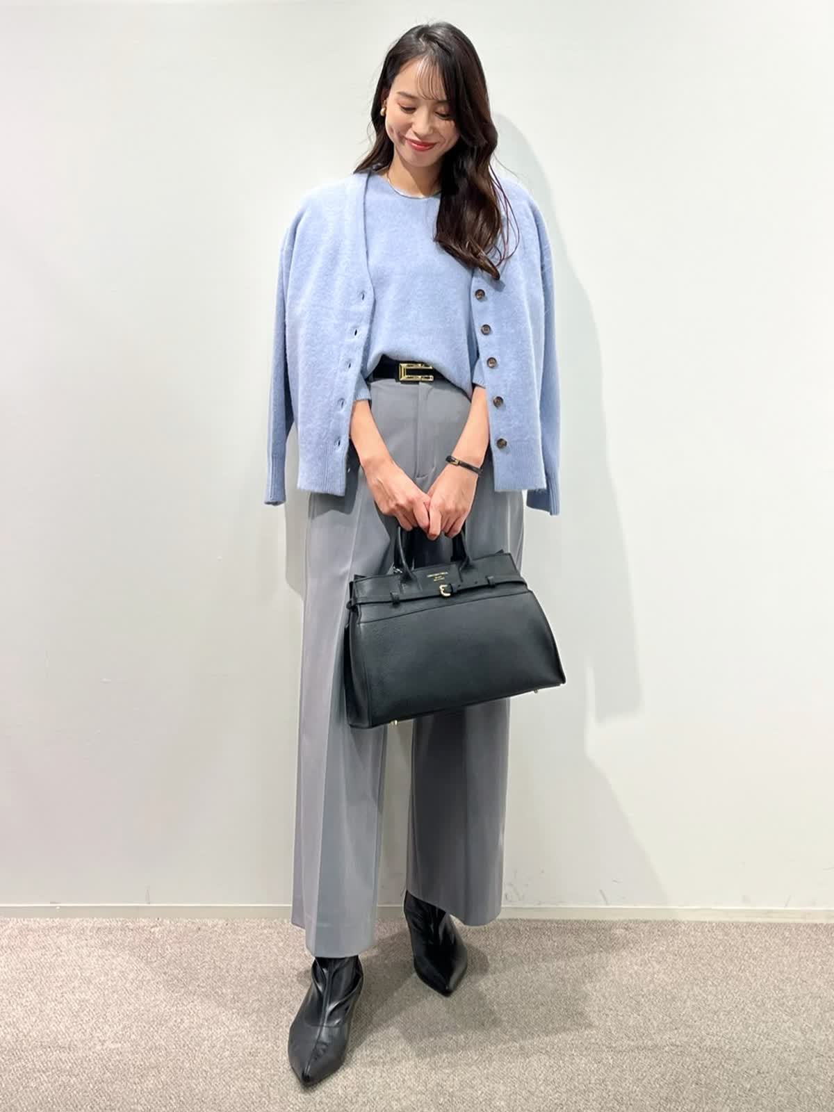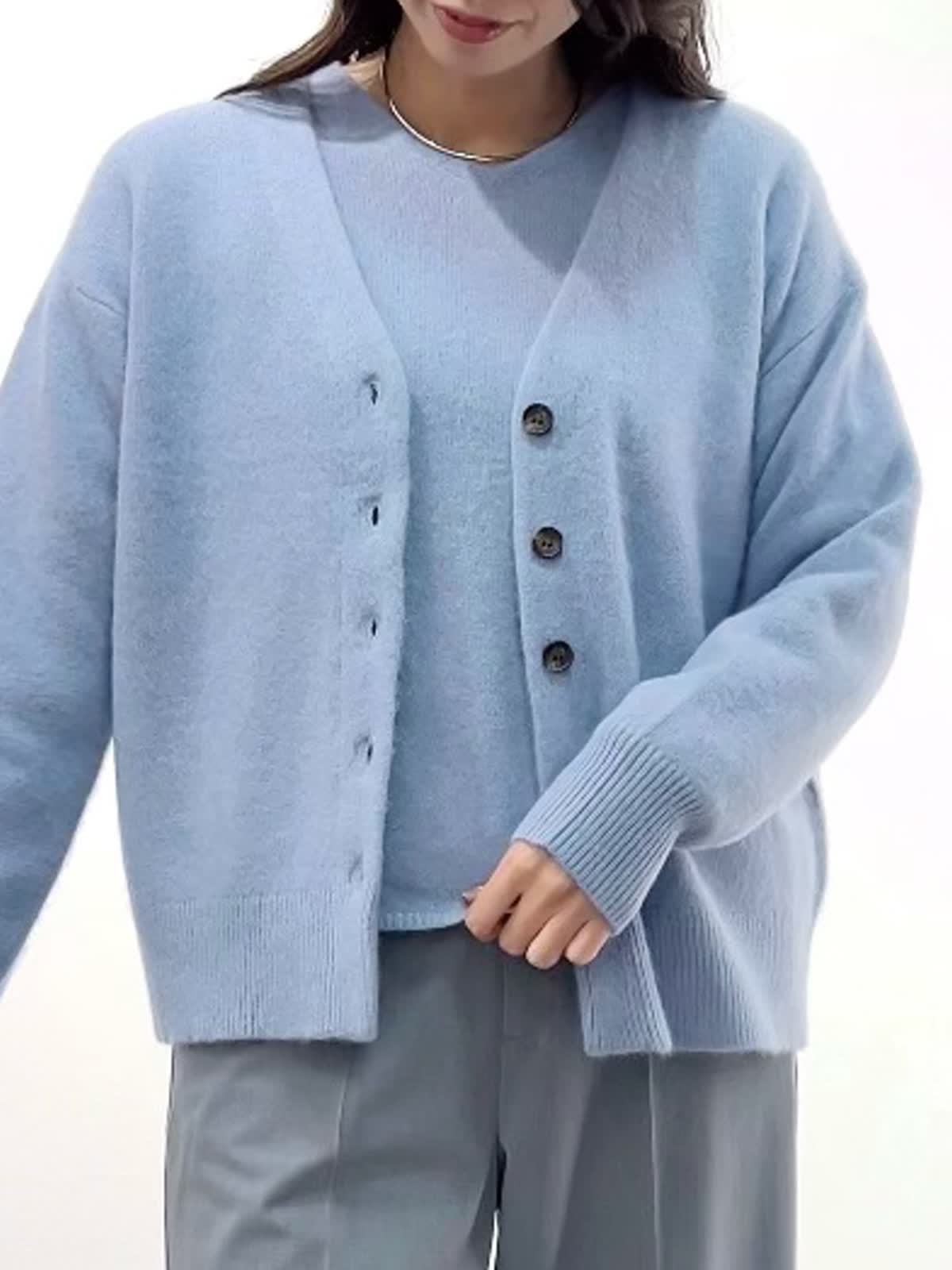 【着用サイズ】カーディガン:9号 ニット:9号 スカート:9号 パンツ:11号 【着用カラー】カーディガン:サックス ニット:サックス スカート:チャコールグレー パンツ:ミディアムグレー 「淡色トーンで魅せる透明感大人のリュクススタイル」 淡いブルー×グレーの配色トーンで柔らかく透明感のあるおすすめスタイル。ふわふわとした質感の上質ラクーンニットは、Vネックニットとカーディガンのアンサンブルがおすすめ。ソフトなタッチと、軽くてあたたかい素材感が、冬のコーデに抜け感を演出してくれるアイテム。ボトムをスカートにしてフェミニンスタイルや、パンツ合わせで大人カジュアルスタイルに。着回し抜群で、通勤やデイリーにも華やかに着こなせます。きれいめカラーで、上品な大人ラグジュアリースタイルが完成。