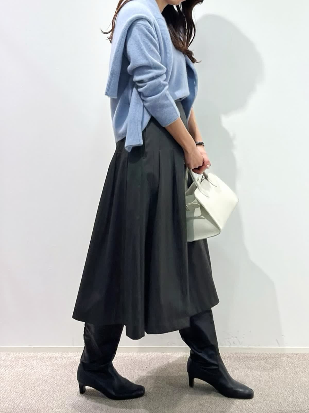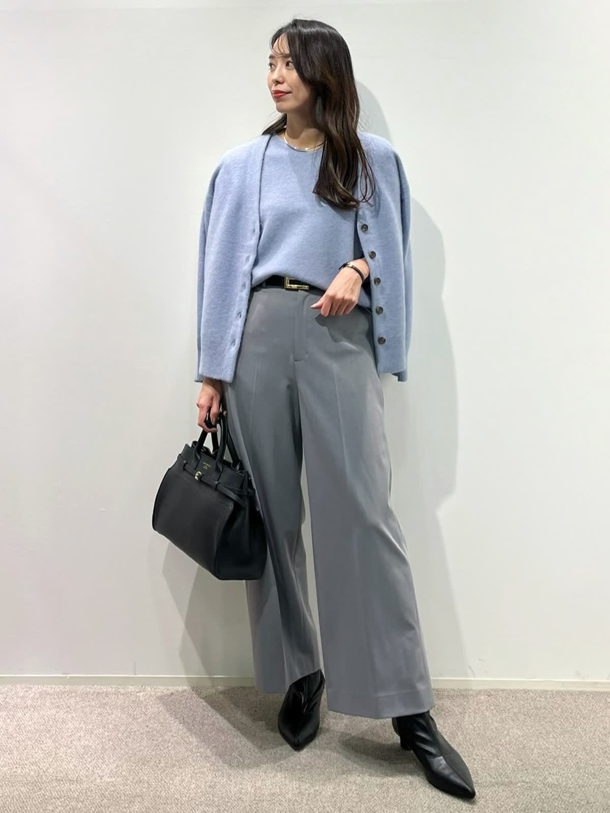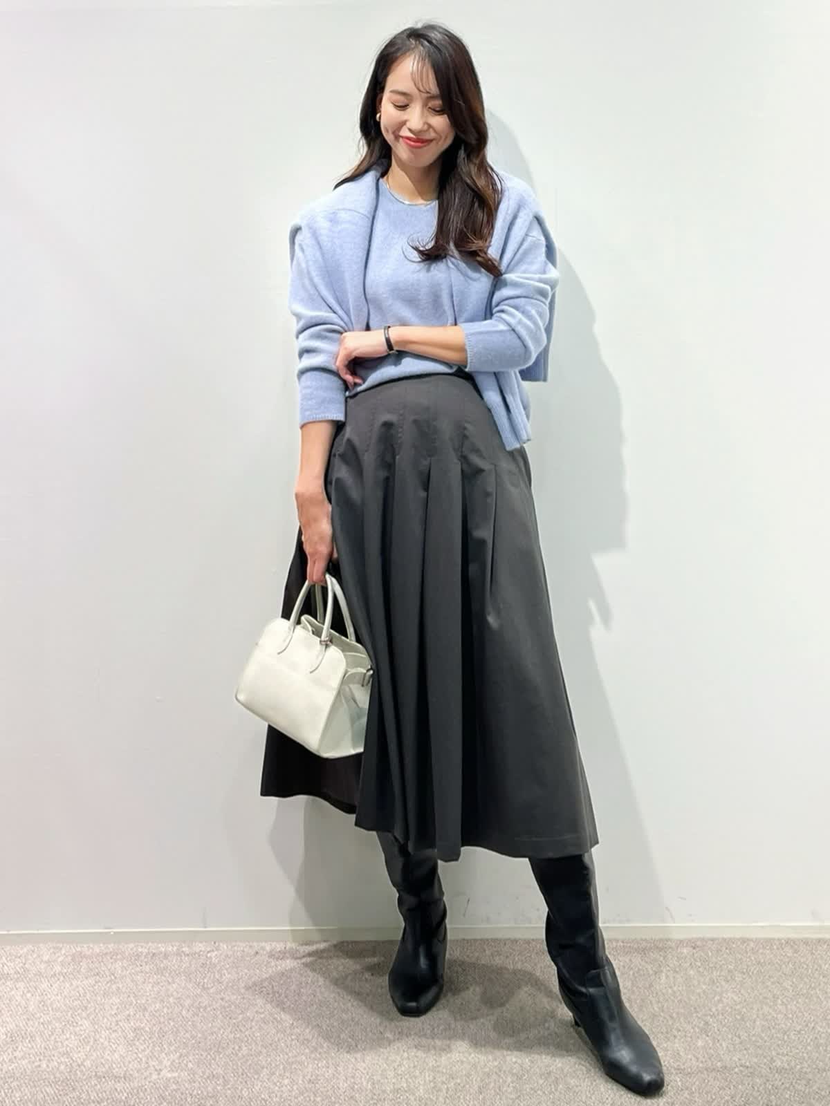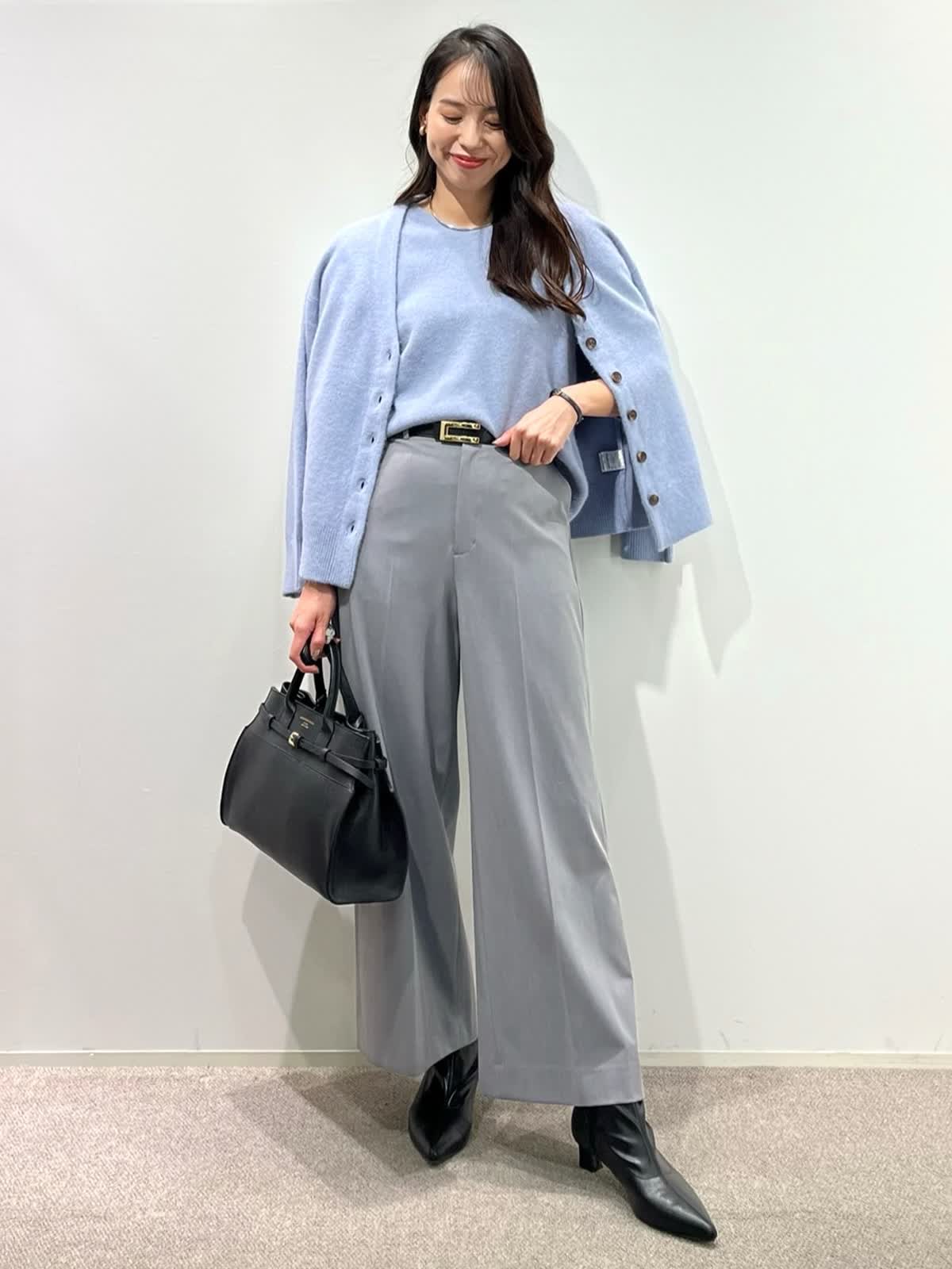 【着用サイズ】カーディガン:9号 ニット:9号 スカート:9号 パンツ:11号 【着用カラー】カーディガン:サックス ニット:サックス スカート:チャコールグレー パンツ:ミディアムグレー 「淡色トーンで魅せる透明感大人のリュクススタイル」 淡いブルー×グレーの配色トーンで柔らかく透明感のあるおすすめスタイル。ふわふわとした質感の上質ラクーンニットは、Vネックニットとカーディガンのアンサンブルがおすすめ。ソフトなタッチと、軽くてあたたかい素材感が、冬のコーデに抜け感を演出してくれるアイテム。ボトムをスカートにしてフェミニンスタイルや、パンツ合わせで大人カジュアルスタイルに。着回し抜群で、通勤やデイリーにも華やかに着こなせます。きれいめカラーで、上品な大人ラグジュアリースタイルが完成。