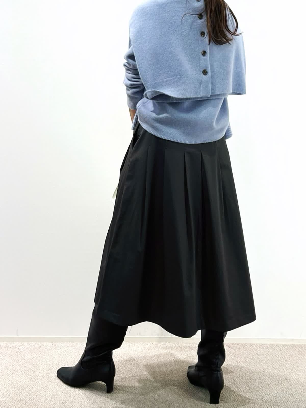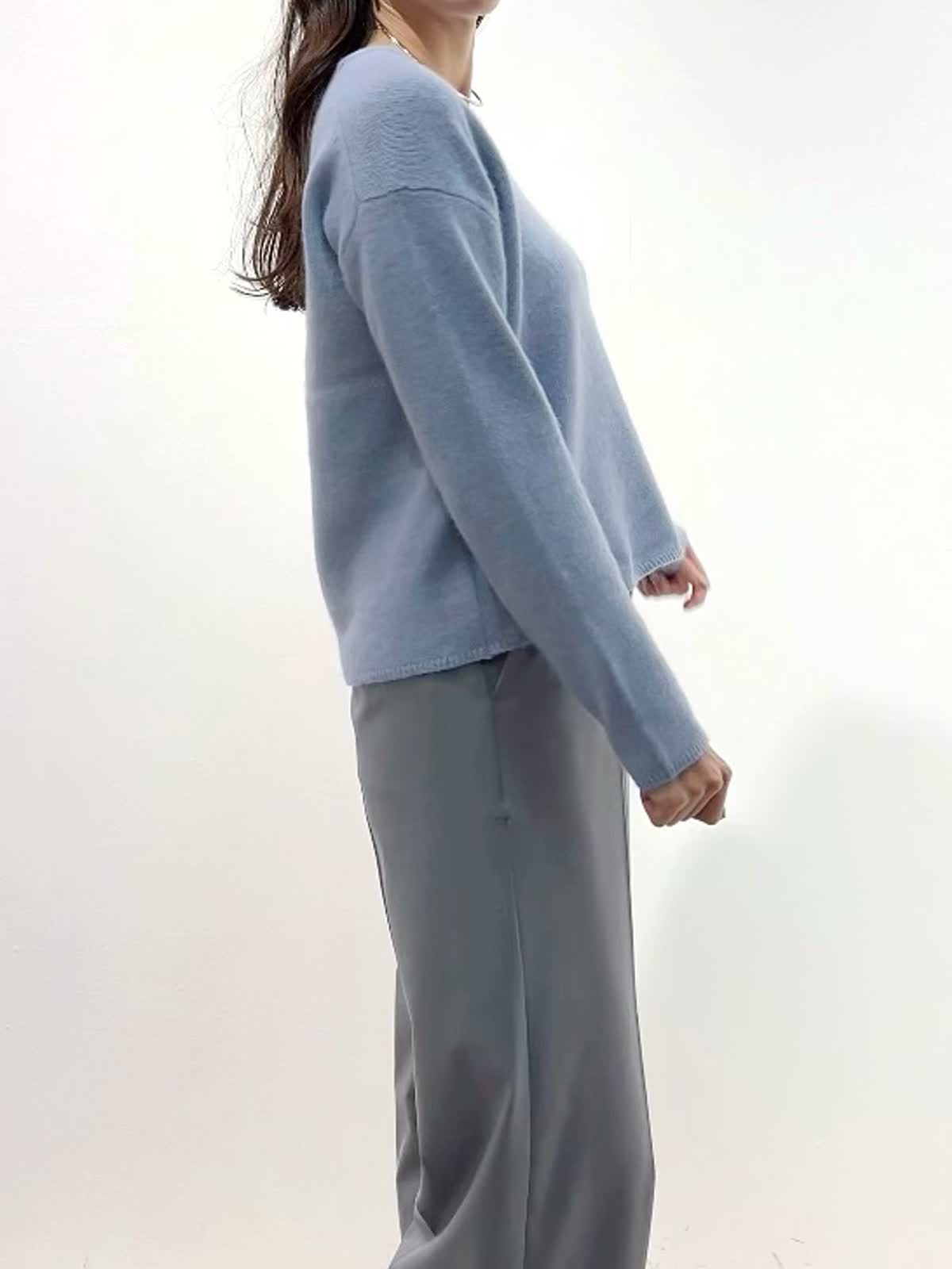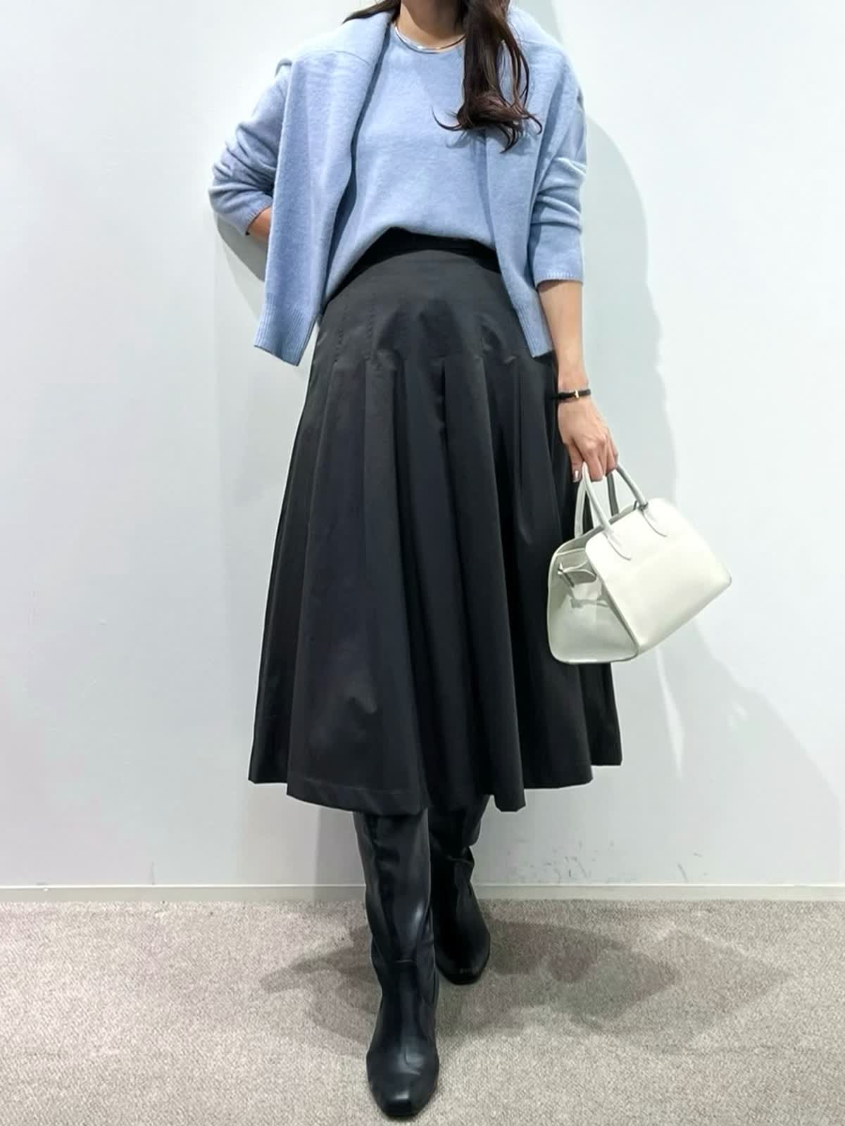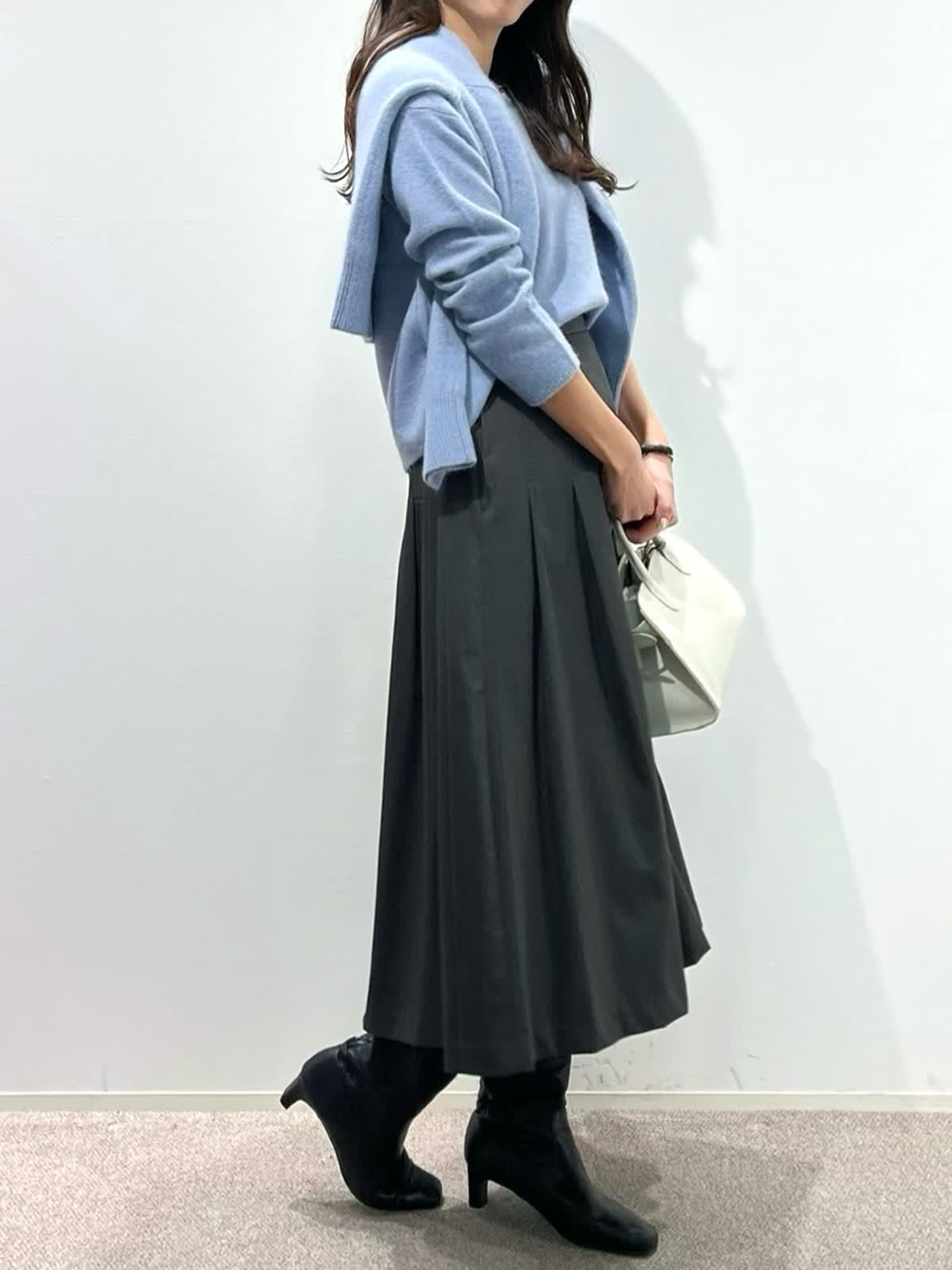 【着用サイズ】カーディガン:9号 ニット:9号 スカート:9号 パンツ:11号 【着用カラー】カーディガン:サックス ニット:サックス スカート:チャコールグレー パンツ:ミディアムグレー 「淡色トーンで魅せる透明感大人のリュクススタイル」 淡いブルー×グレーの配色トーンで柔らかく透明感のあるおすすめスタイル。ふわふわとした質感の上質ラクーンニットは、Vネックニットとカーディガンのアンサンブルがおすすめ。ソフトなタッチと、軽くてあたたかい素材感が、冬のコーデに抜け感を演出してくれるアイテム。ボトムをスカートにしてフェミニンスタイルや、パンツ合わせで大人カジュアルスタイルに。着回し抜群で、通勤やデイリーにも華やかに着こなせます。きれいめカラーで、上品な大人ラグジュアリースタイルが完成。