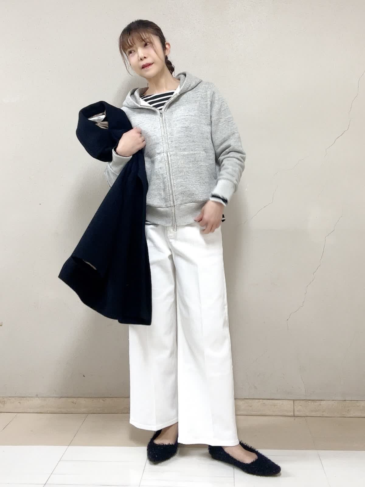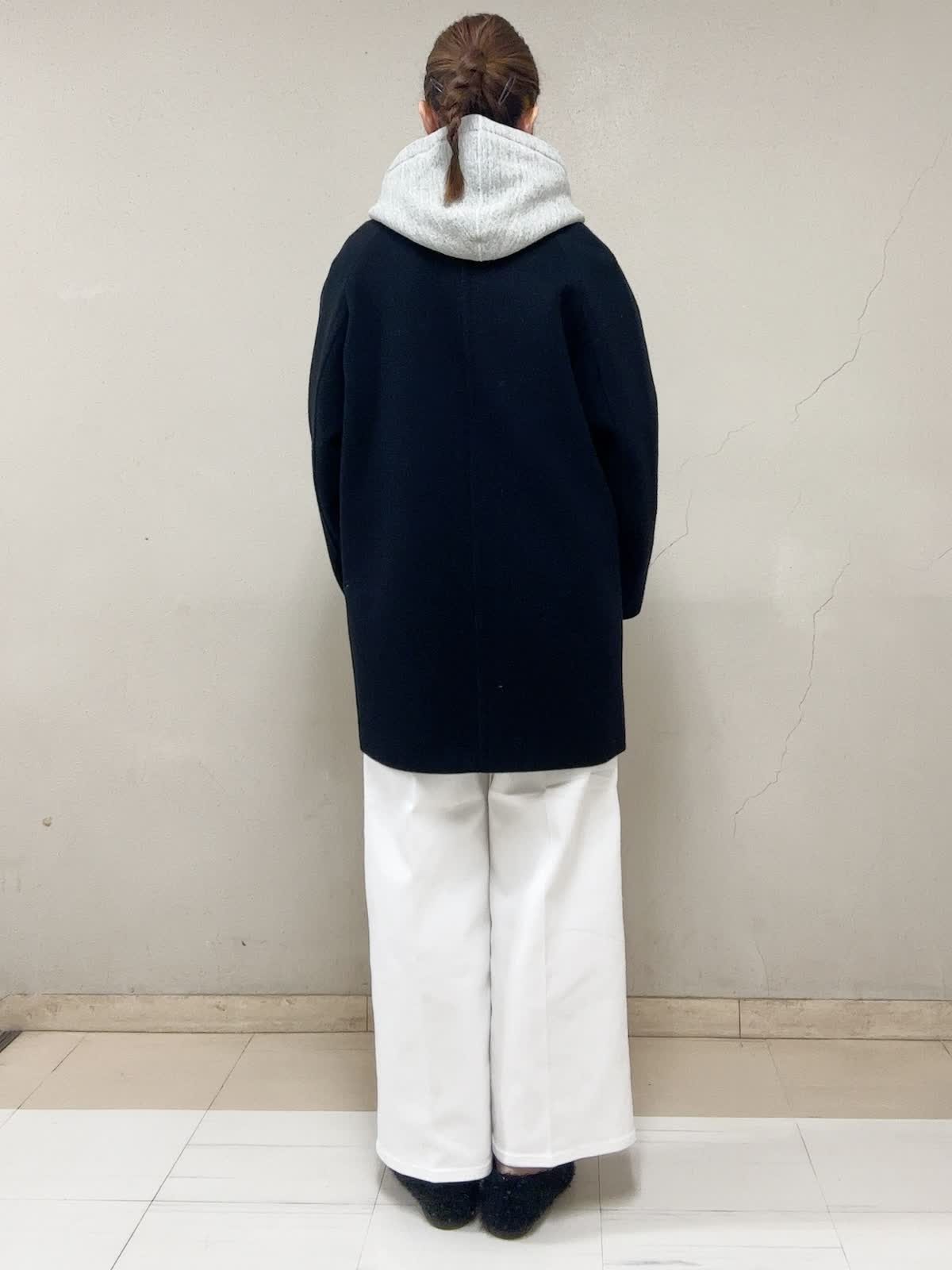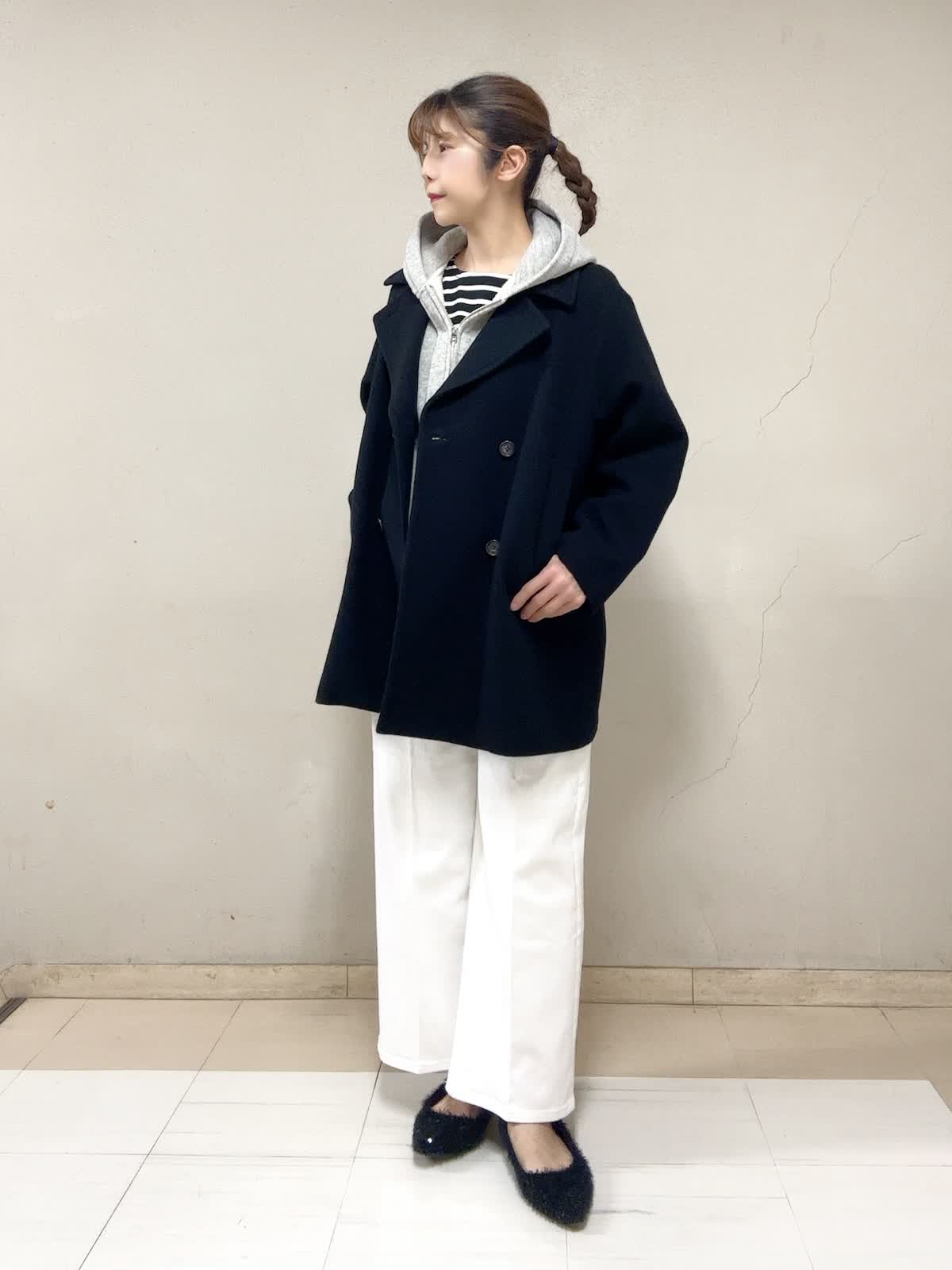 【着用サイズ】Pコート:フリー ジップアップフーディ:9号 ボーダーカットソー:フリー パンツ:9号 【着用カラー】Pコート:ブラック ジップアップフーディ:グレー ボーダーカットソー:ブラック パンツ:ホワイト お出掛けスタイル 着丈がヒップが隠れる安心感と暖かさが良いです。ゆったりサイズで重ね着しても羽織り易い。