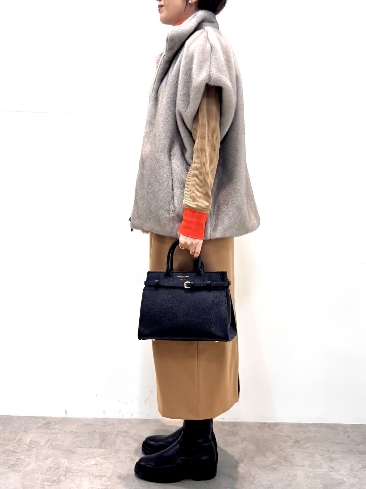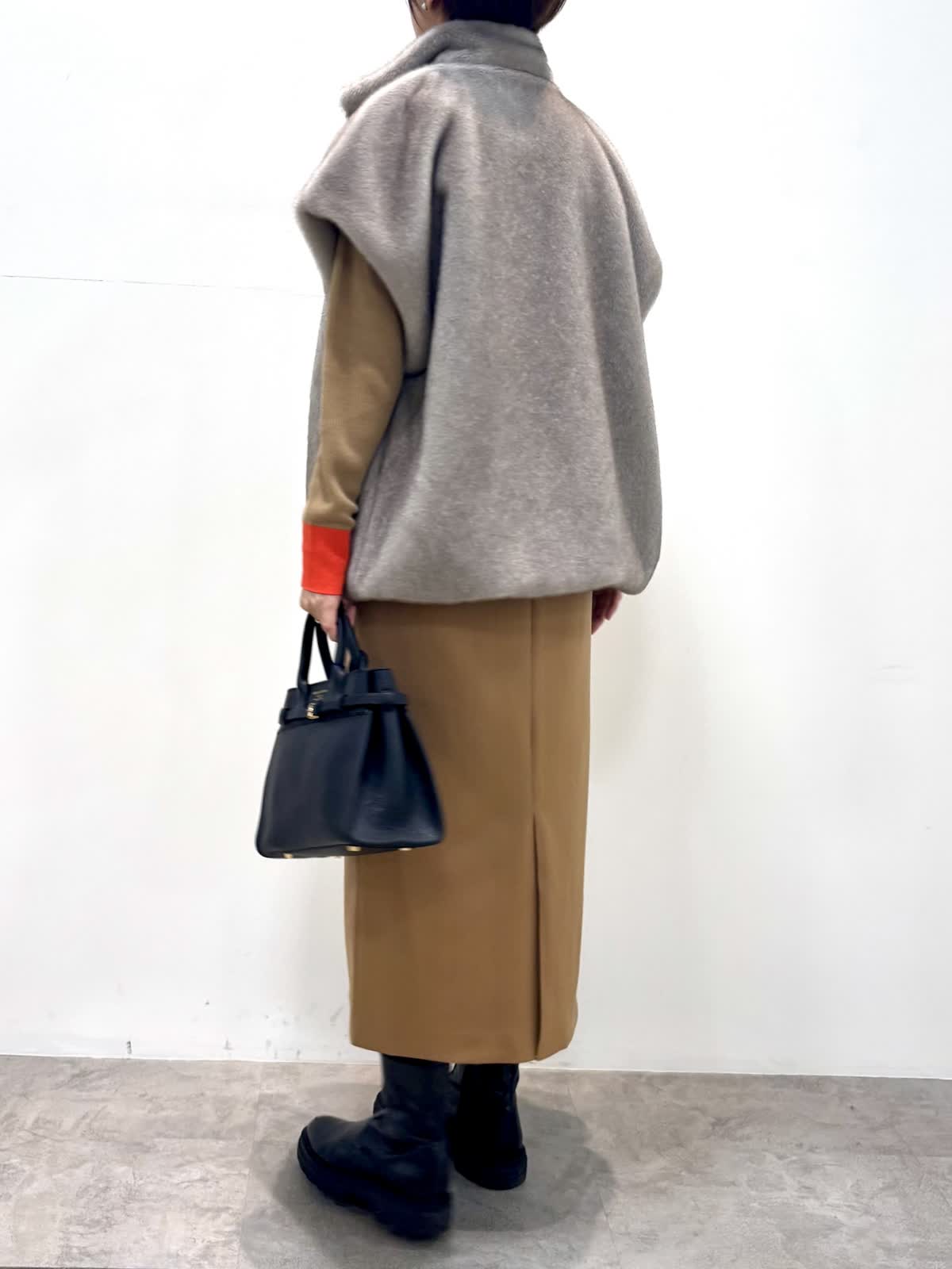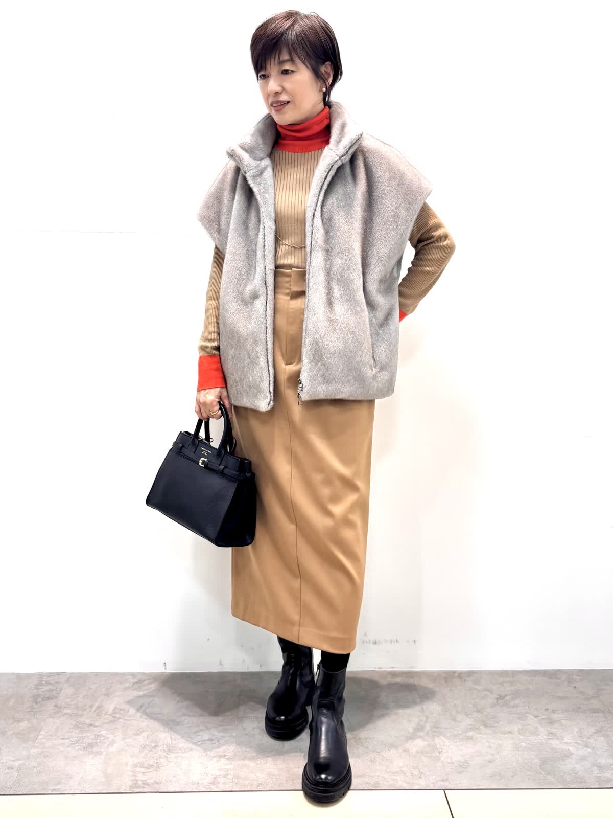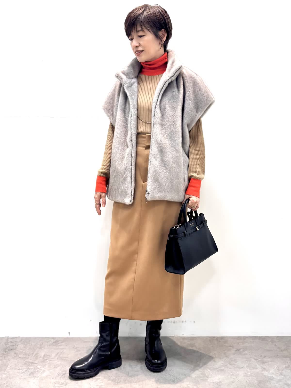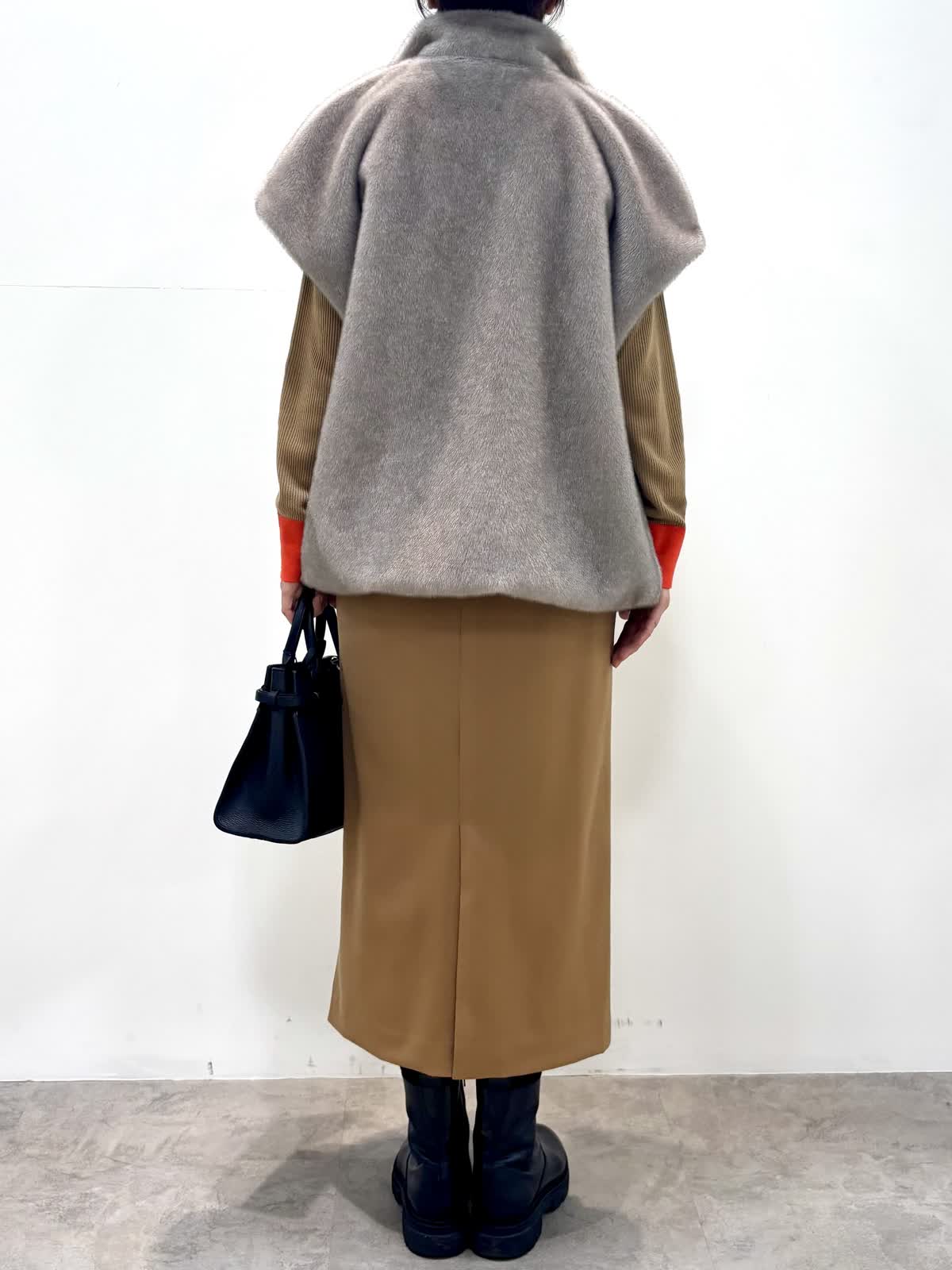 [着用サイズ]エコファーベスト:9号ニット:11号 スカート:9号 [着用カラー]エコファーベスト:グレーベージュ ニット:モカチャ スカート:キャメル 冬のインナーに大活躍のリブニットにミンクのような滑らかな肌触りと艶のジレは軽くてとても暖かいです。縦ラインで、サイドベルト付きスカートはスッキリとしたシルエットで仕事から日常使いにオールマイティです。