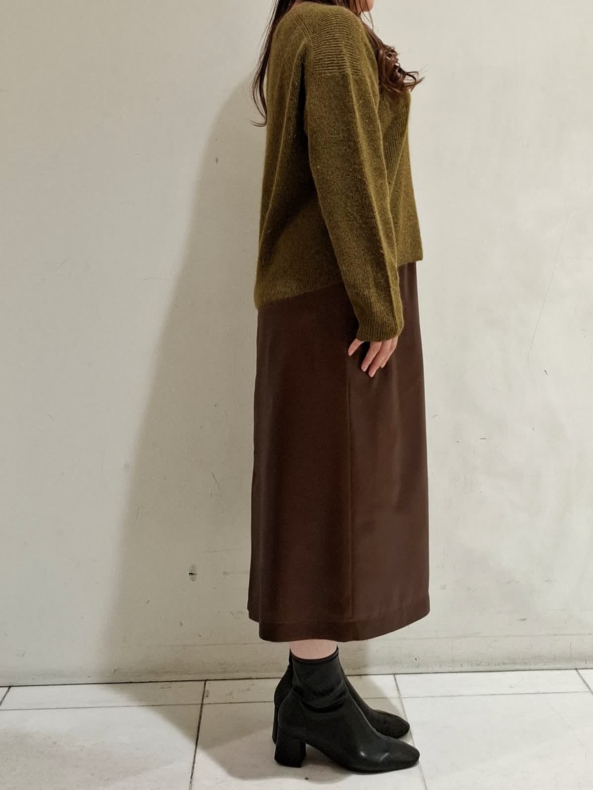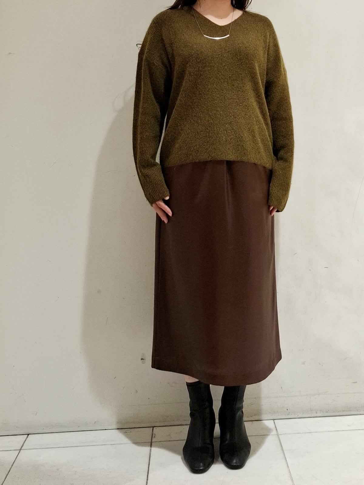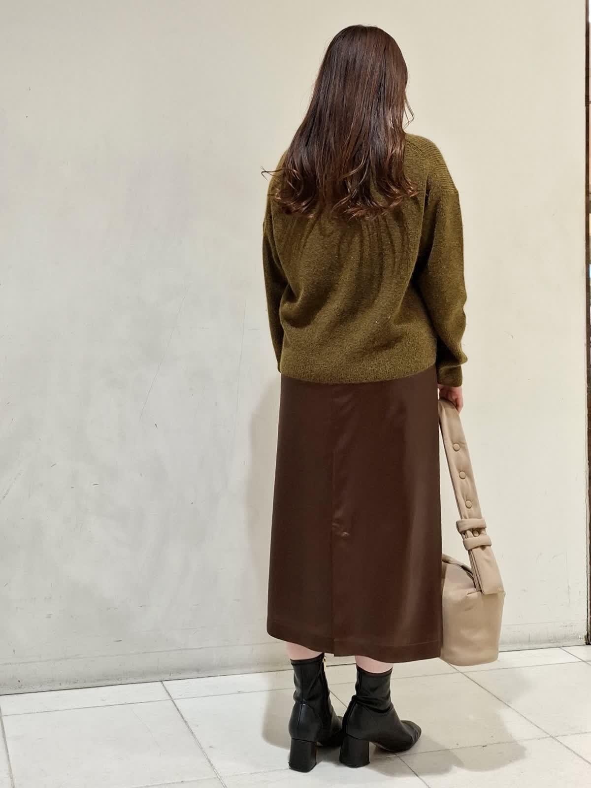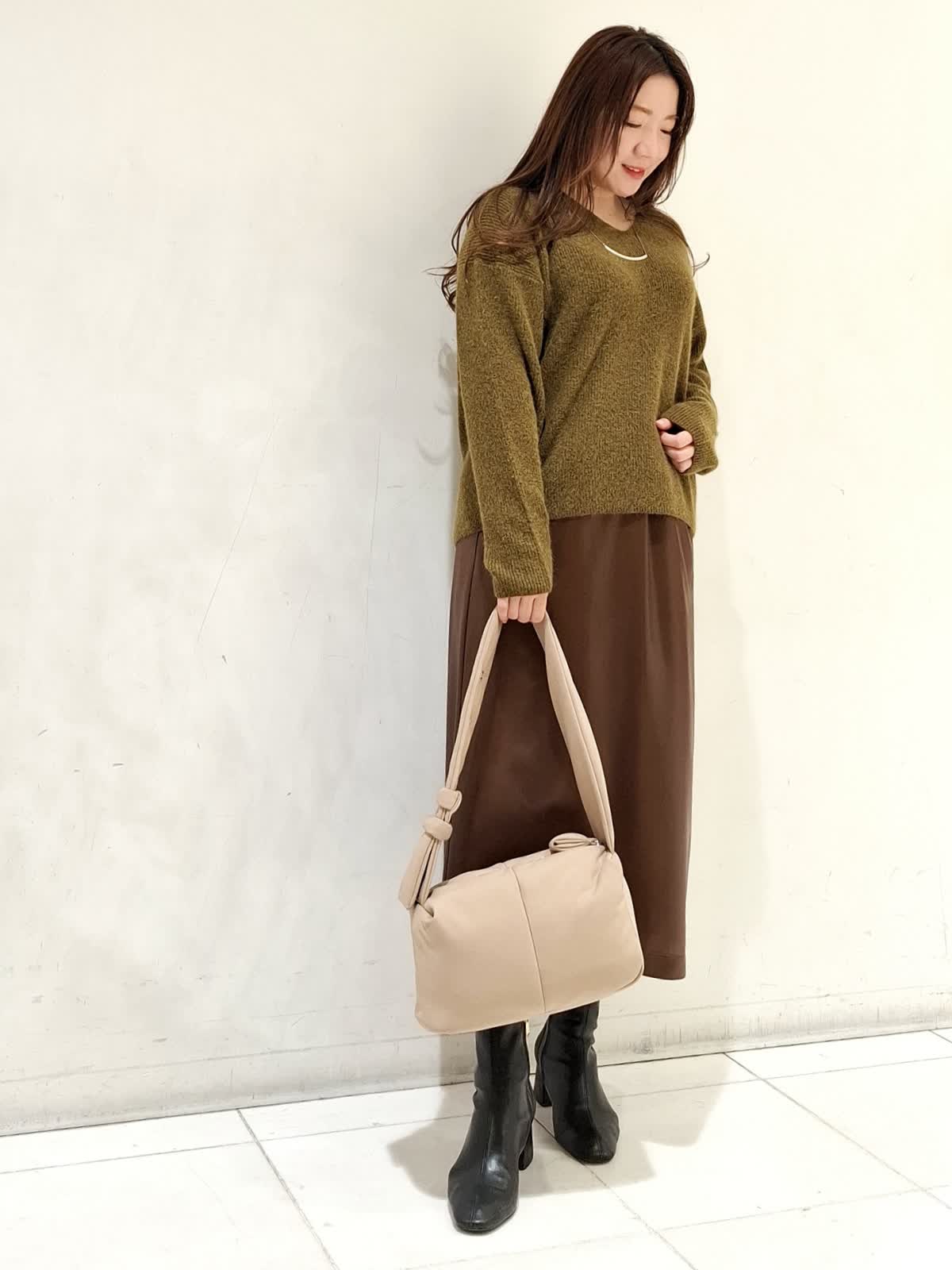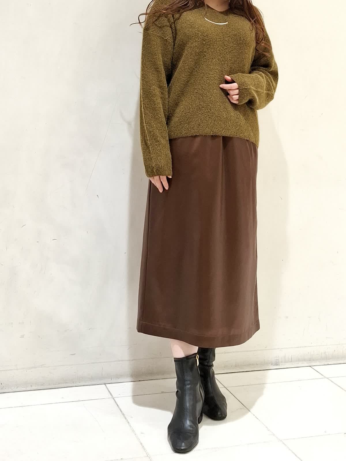 【着用サイズ】ニット:フリーサイズ カーキ スカート:9号サイズ ブラウン バック:フリーサイズ ベージュ アンゴラの入った糸に、ラメとスパーンコールがポイントのニット。柔らかな着心地で、着るだけで華やかな印象になります。スカートは、レザー調のサテン素材で、ゆとりのあるストレートシルエットが身体のラインをひろわず、長さもあるためはきやすいです。