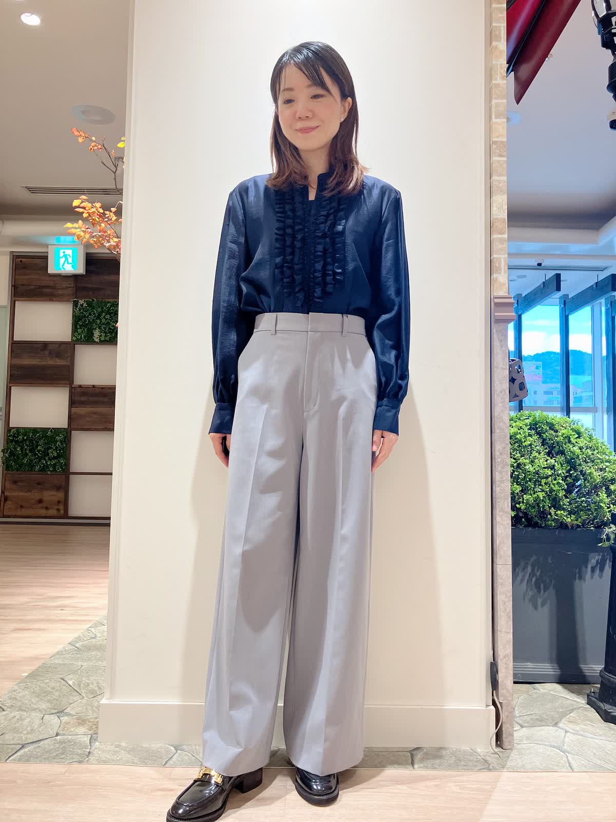 【着用サイズ】ブラウス:9号 パンツ:7号 【着用カラー】ブラウス:ネイビー パンツ:ミディアムグレー コーディネートのテーマは通勤スタイリングです。 フリルブラウスは、ネイビーの抑えたカラーをチョイスして、落ち着いた雰囲気に。グレーのワイドパンツは程よく細身でスッキリ切着られるので、低身長さんにも取り入れやすいです。黒の小物を合わせて通勤にもぴったりのコーディネートです。