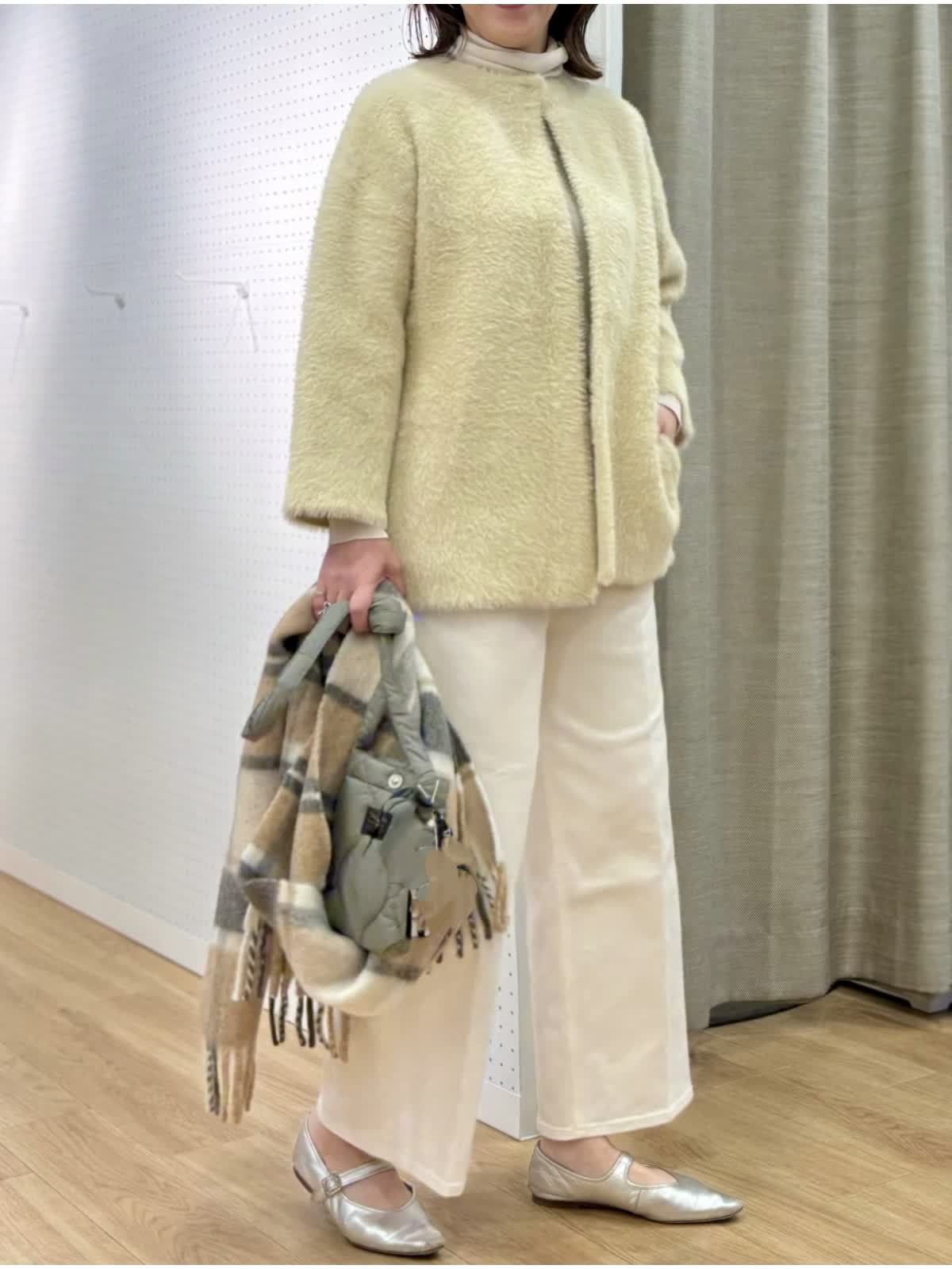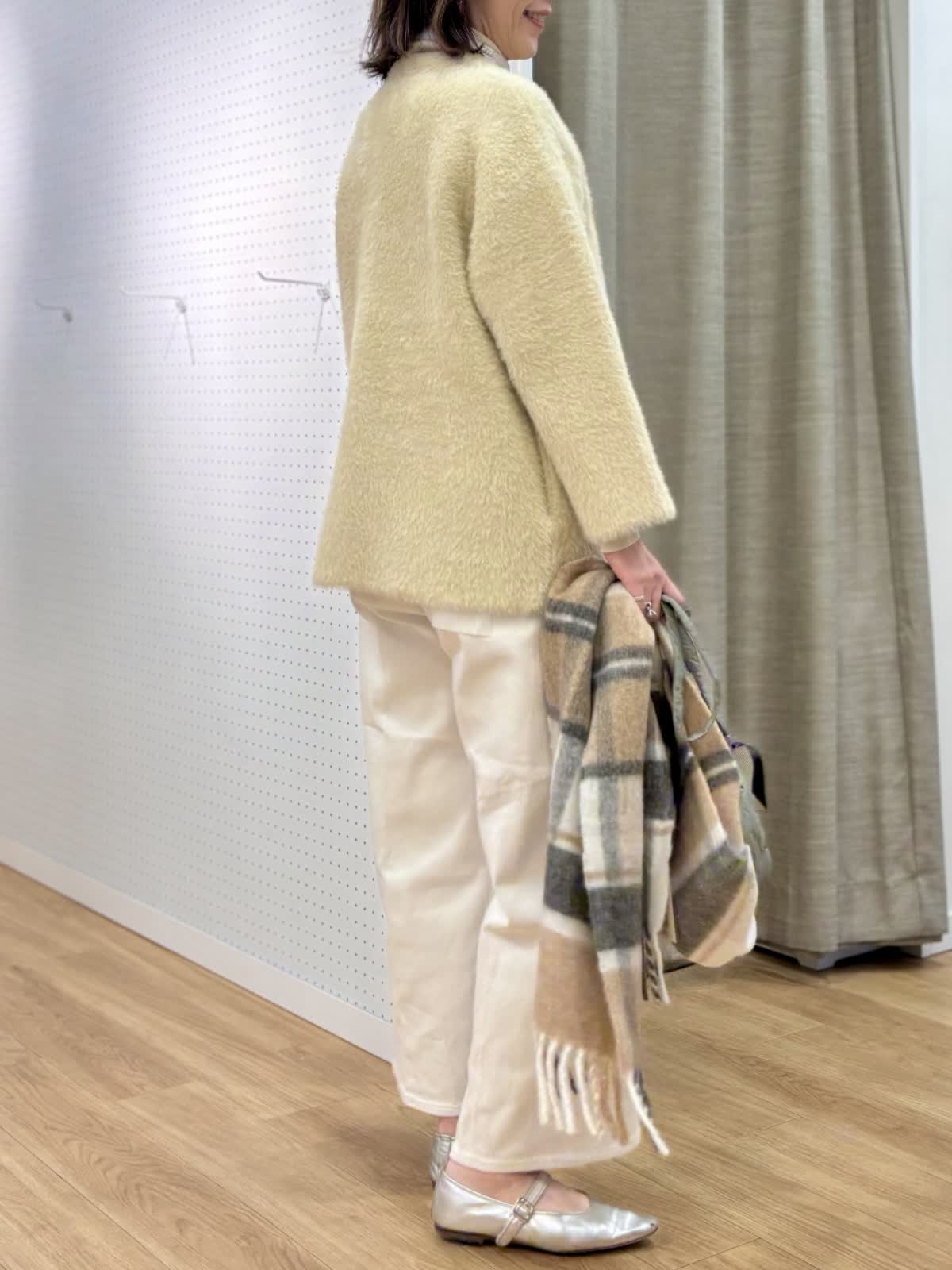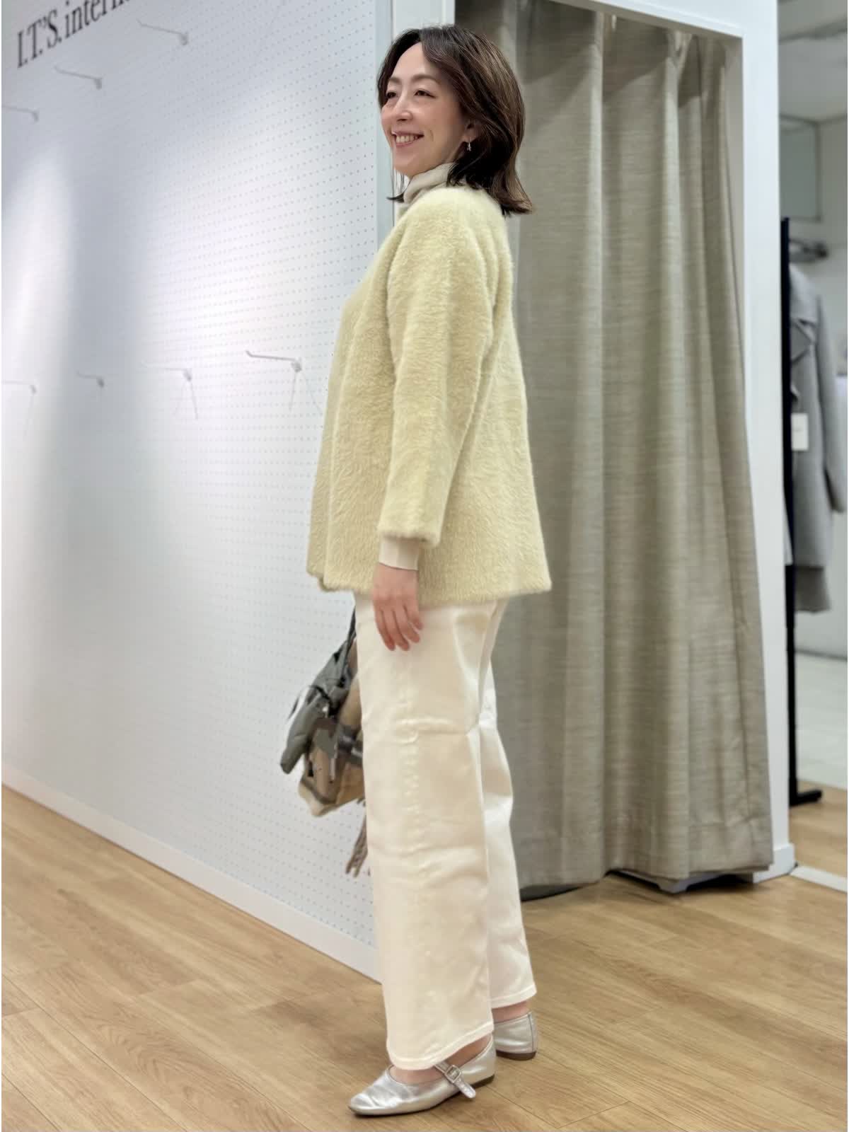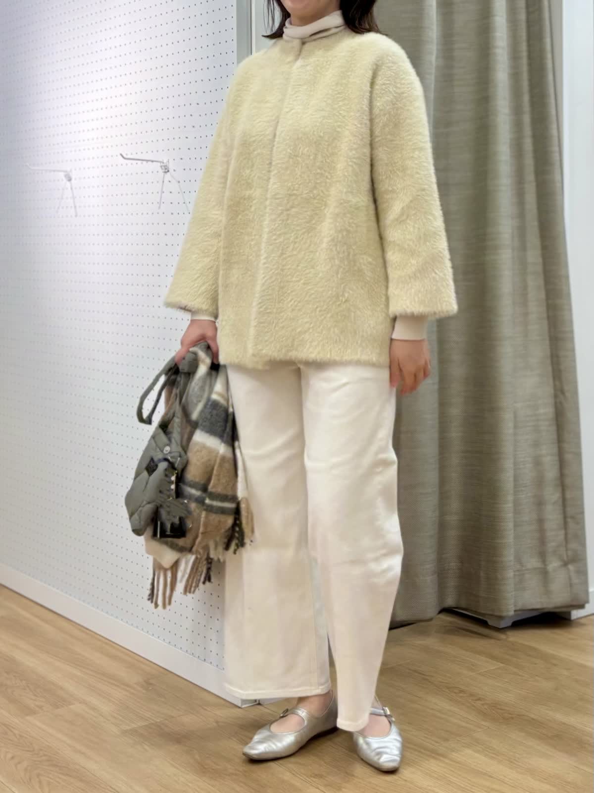 【着用カラー/サイズ】 ブルゾン:アイボリー/フリー ニット:グレーベージュ/9号 パンツ:ホワイト/11号 「白」だけで完成する大人の洗練スタイル。シンプルなのに印象的なスタイリングは異素材の組み合わせがポイント。素材から生まれる凹凸感がワントーンに奥行きが出来て華やかさとエレガンスさも兼ね備えた装いに。ファーブルゾンはヒップ丈で日中の軽い羽織りに最適です。タートルはCuooシリーズでキュプラ混だからムレなく着心地も快適です。
