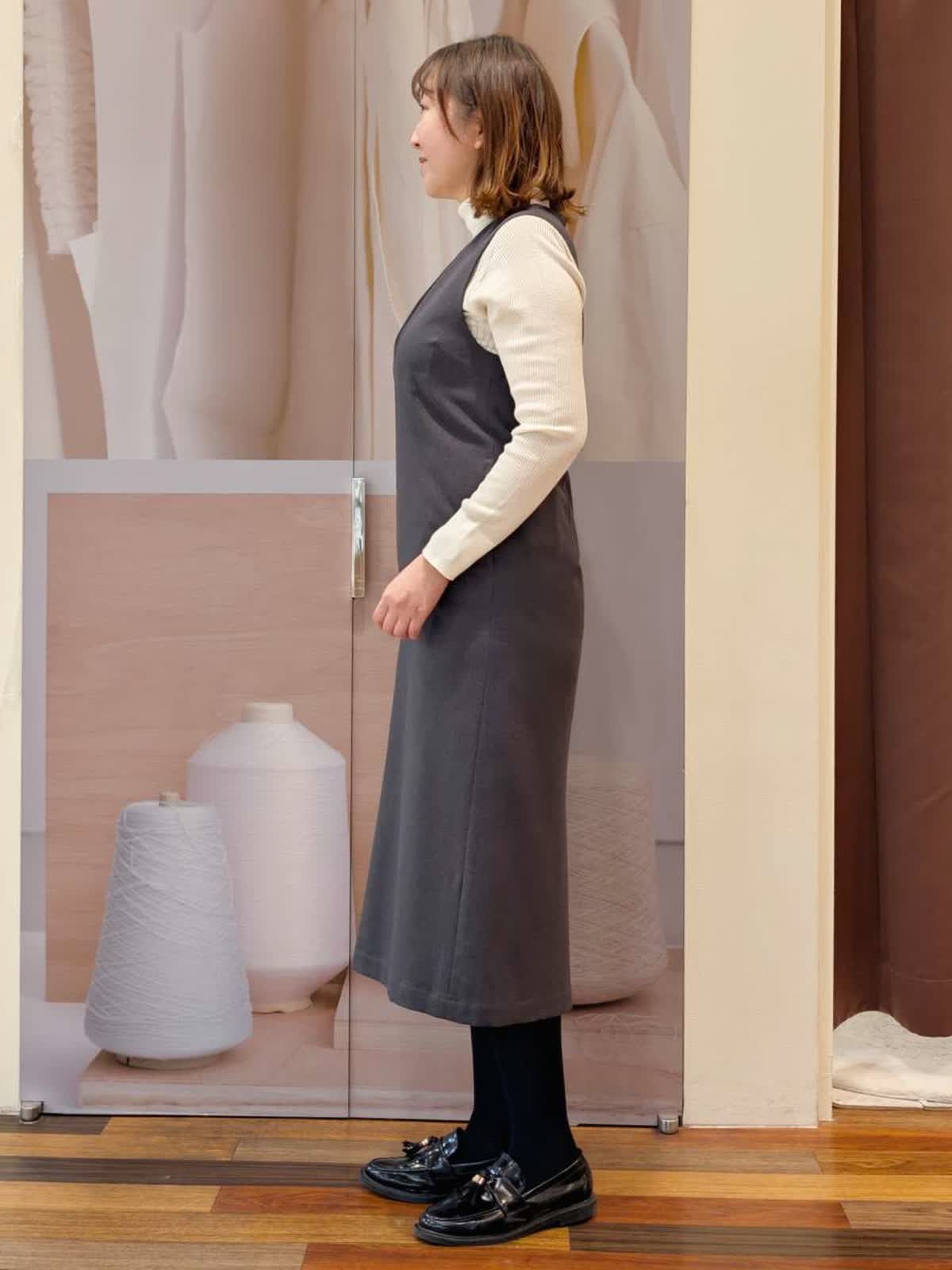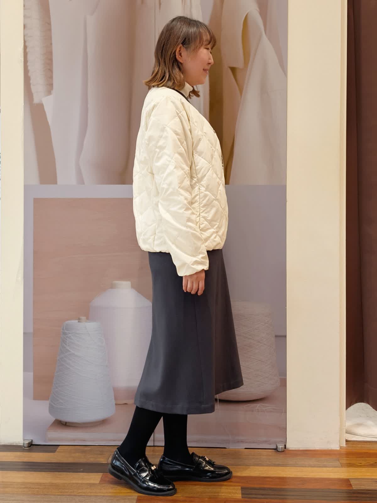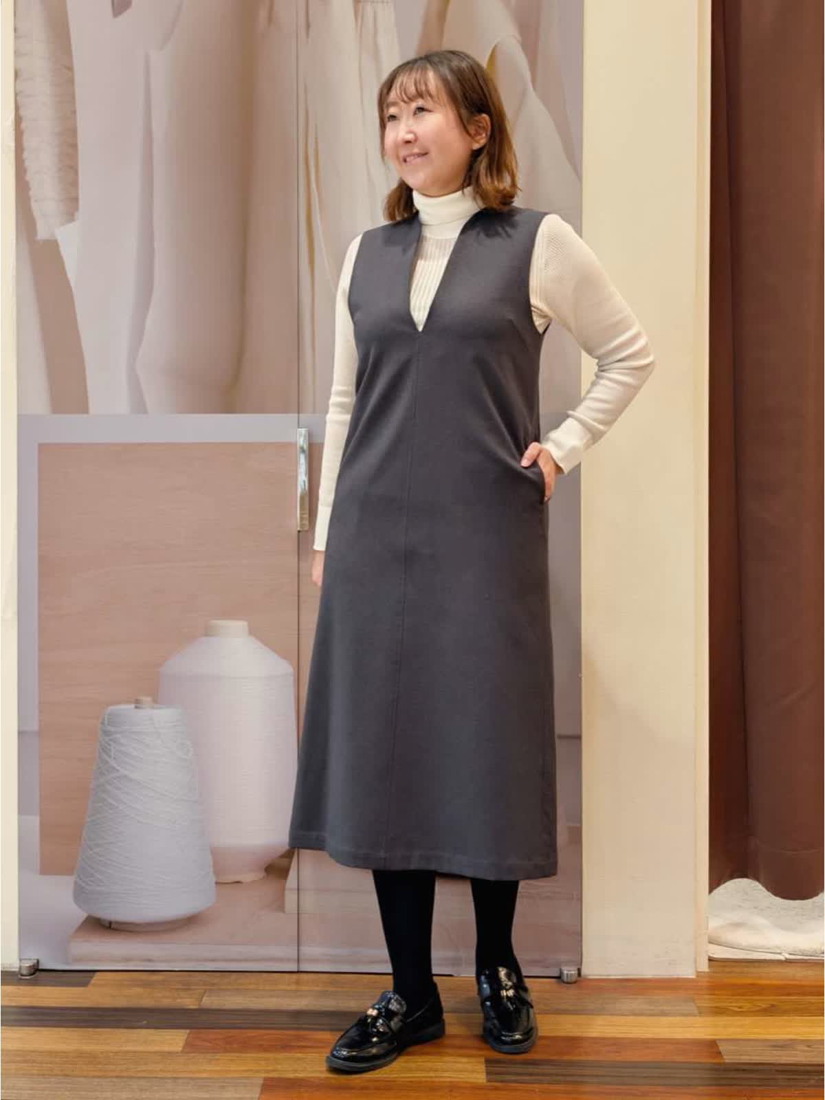 【着用サイズ】ダウン:9号 ワンピース:フリー ニット:11号【着用カラー】ダウン:アイボリー ワンピース:ミディアムグレー ニット:グレーベージュ ランチ会コーディネートです。ワンピースできれいめカジュアルにまとめました。ダウンはTAIONとコラボで毎年人気のデザイン。薄手でも暖かく、着膨れせずスッキリ着られます。真冬はウールコートの中にインナーダウンとしても着ていただけます。ワンピースは広がりを抑えたIラインシルエット。インナーにタートルニットを合わせましたが、ブラウスなどインナーを変えることで印象を変えて様々な着こなしを楽しめます。