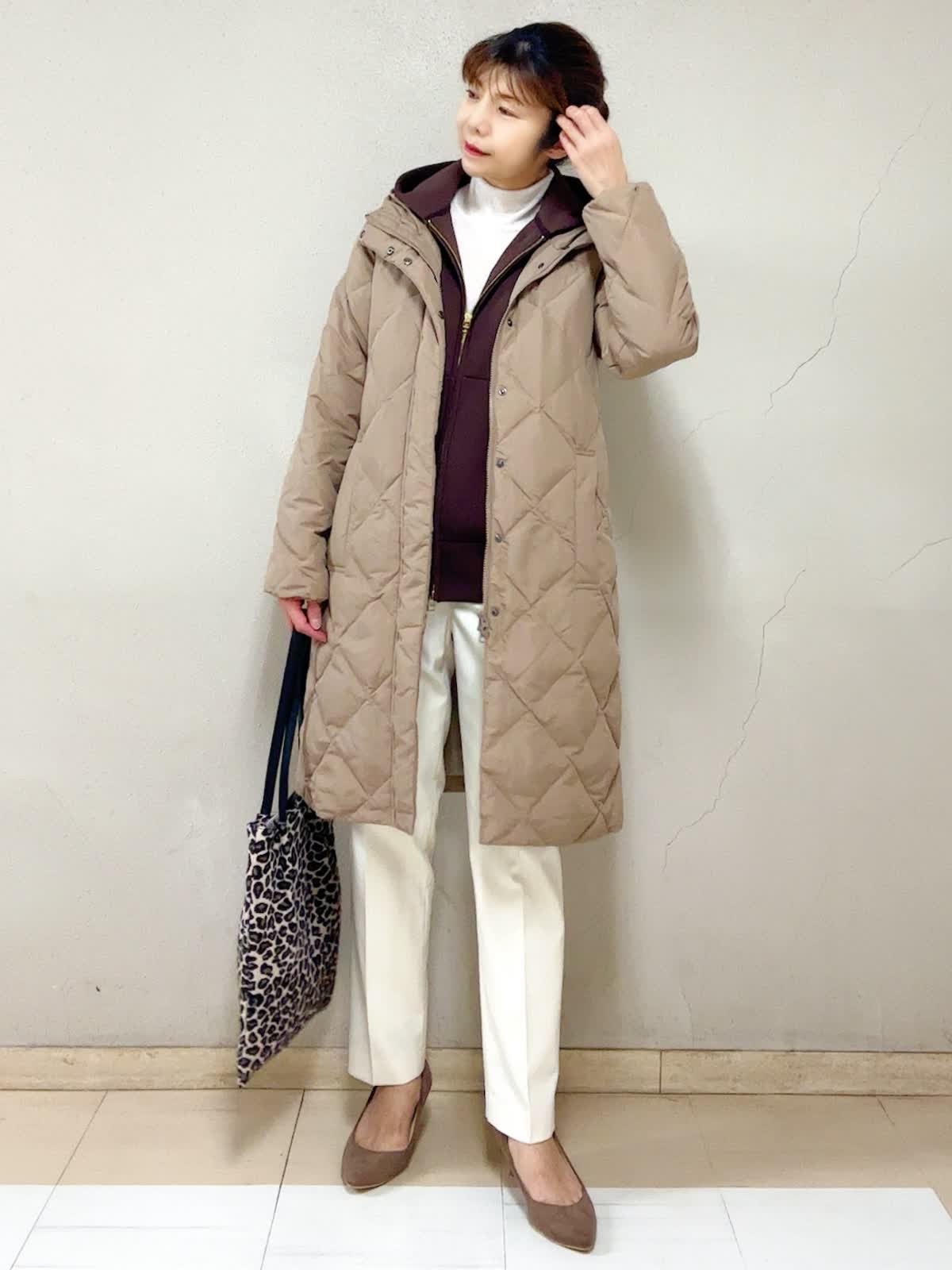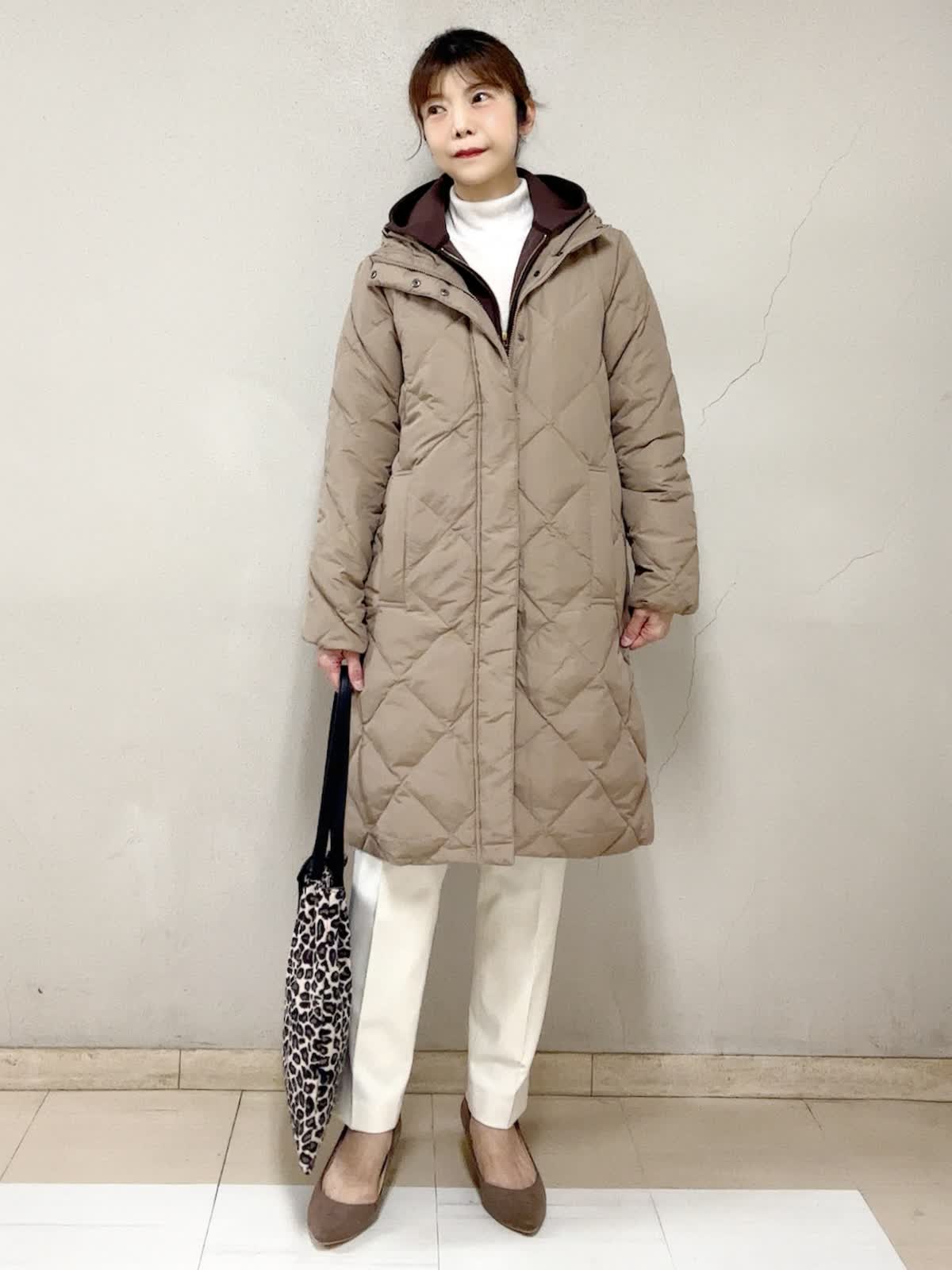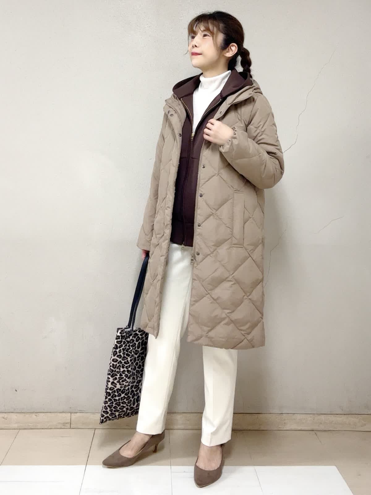 【着用サイズ】ダウンコート:9号 ジップアップフーディ:フリー タートルニット:フリー パンツ:11号 【着用カラー】ダウンコート:キャメル ジップアップフーディ:ブラウン タートルニット:オフホワイト パンツ:オフホワイト お出掛けスタイル 長く時間帯で外に居るお出掛けには,断然着丈も重視。この丈なら、ご旅行先でも安心ですね。人気のブラウン系で。