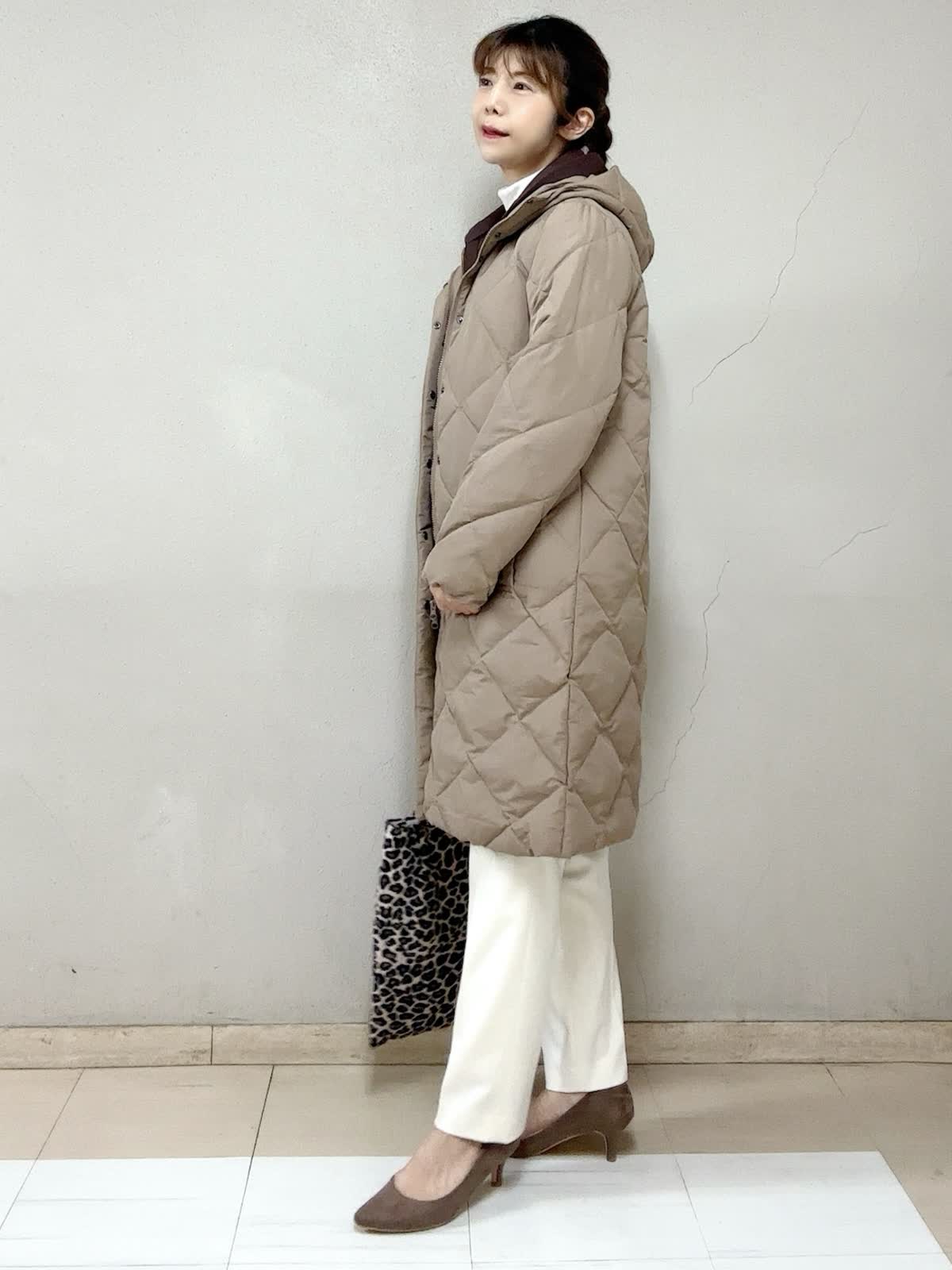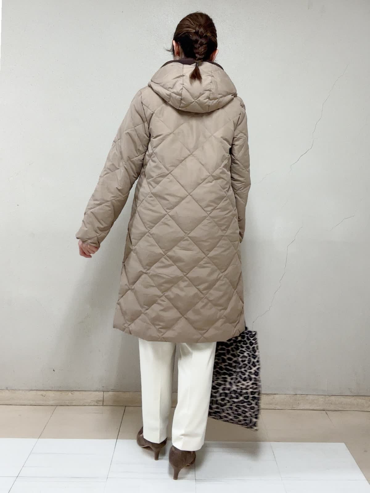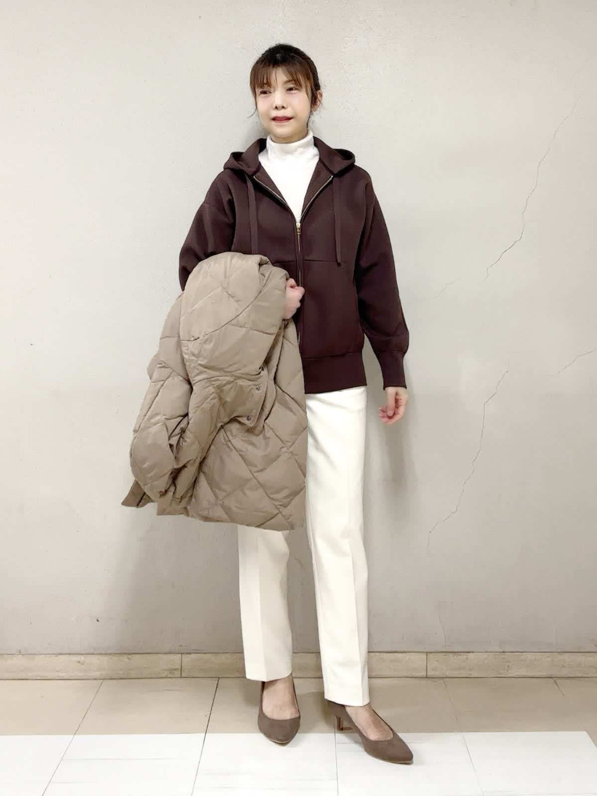 【着用サイズ】ダウンコート:9号 ジップアップフーディ:フリー タートルニット:フリー パンツ:11号 【着用カラー】ダウンコート:キャメル ジップアップフーディ:ブラウン タートルニット:オフホワイト パンツ:オフホワイト お出掛けスタイル 長く時間帯で外に居るお出掛けには,断然着丈も重視。この丈なら、ご旅行先でも安心ですね。人気のブラウン系で。