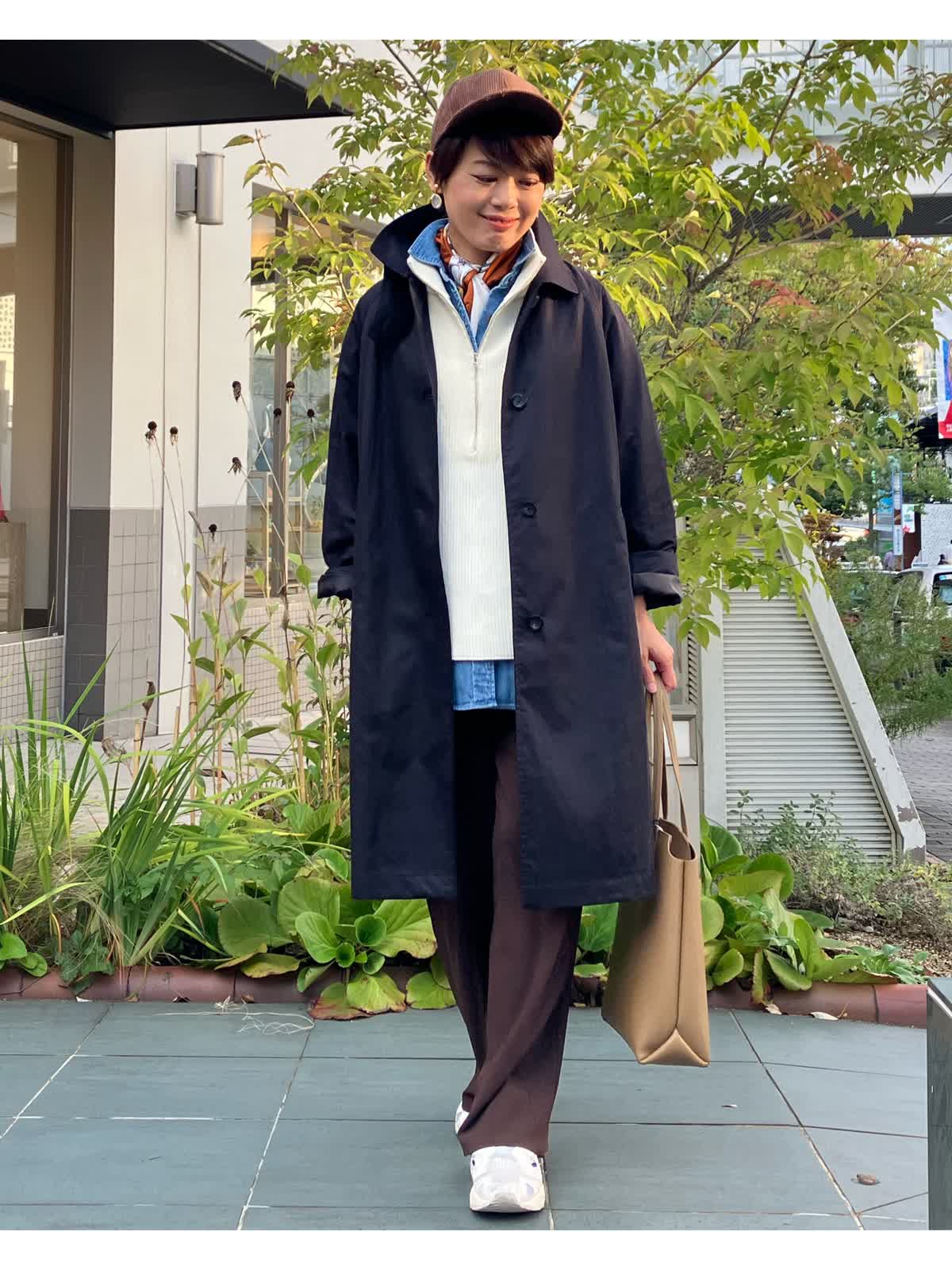 【着用サイズ/カラー】 コート:フリー/ブラック ニット:フリー/オフホワイト シャツ:フリー/ブルー パンツ:フリー/ブラウン 来週また一段と冷え込むって言っています! いよいよコートが必要になってきました。しなやかで軽い 袖周りゆったりでストレスなく羽織れる薄手のコートにインナーを重ね着して寒暖差対策しましょう。