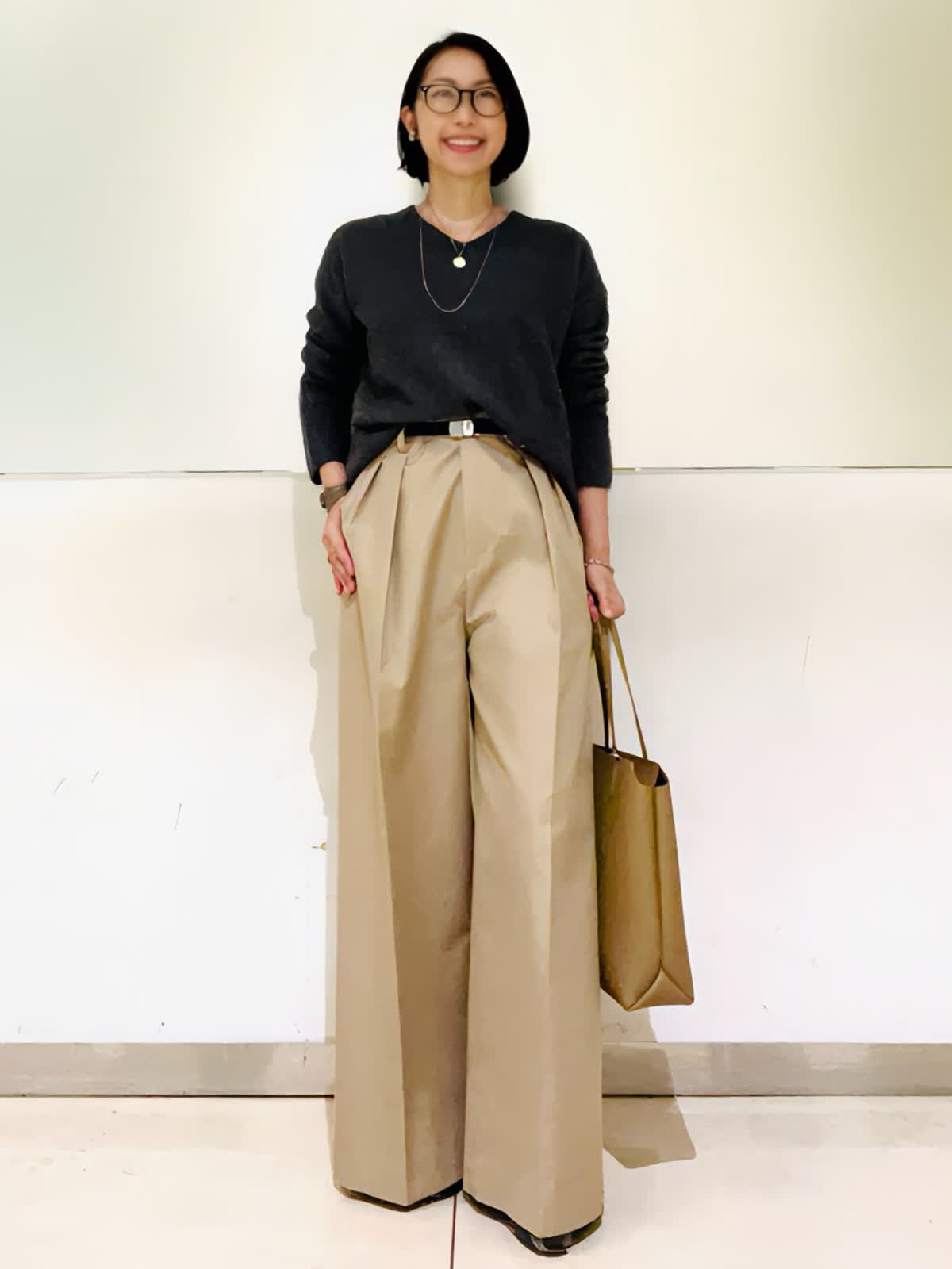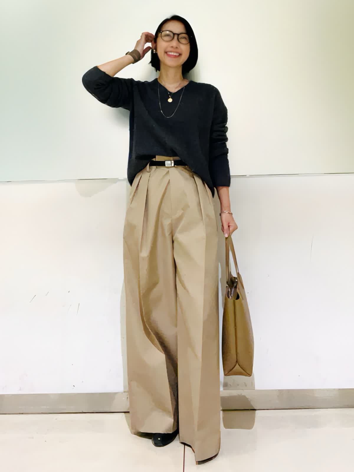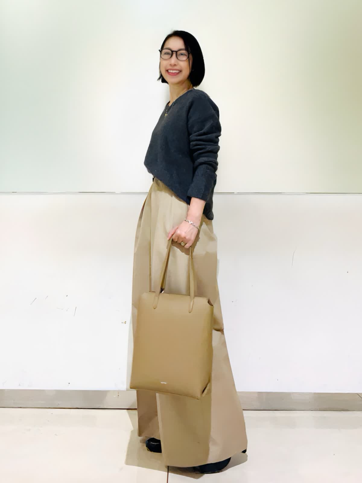 【着用アイテム】すべて9号 【着用カラー】ニット:チャコールグレー パンツ:ベージュ ラクーンのふんわりした毛足が可愛いニット。ざっくりしたシルエットとVネックの開きが抜け感があります。深みのあるチャコールグレーが大人可愛いカラーです。足長効果抜群の三尋木さんコラボパンツのベージュとも相性ぴったりでおすすめの組み合わせです。