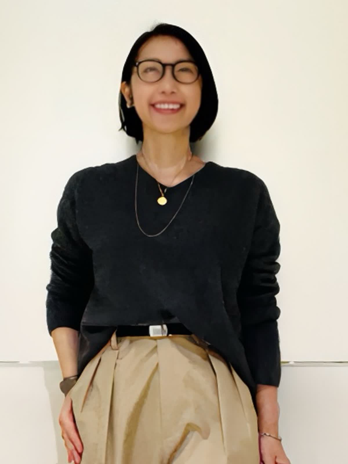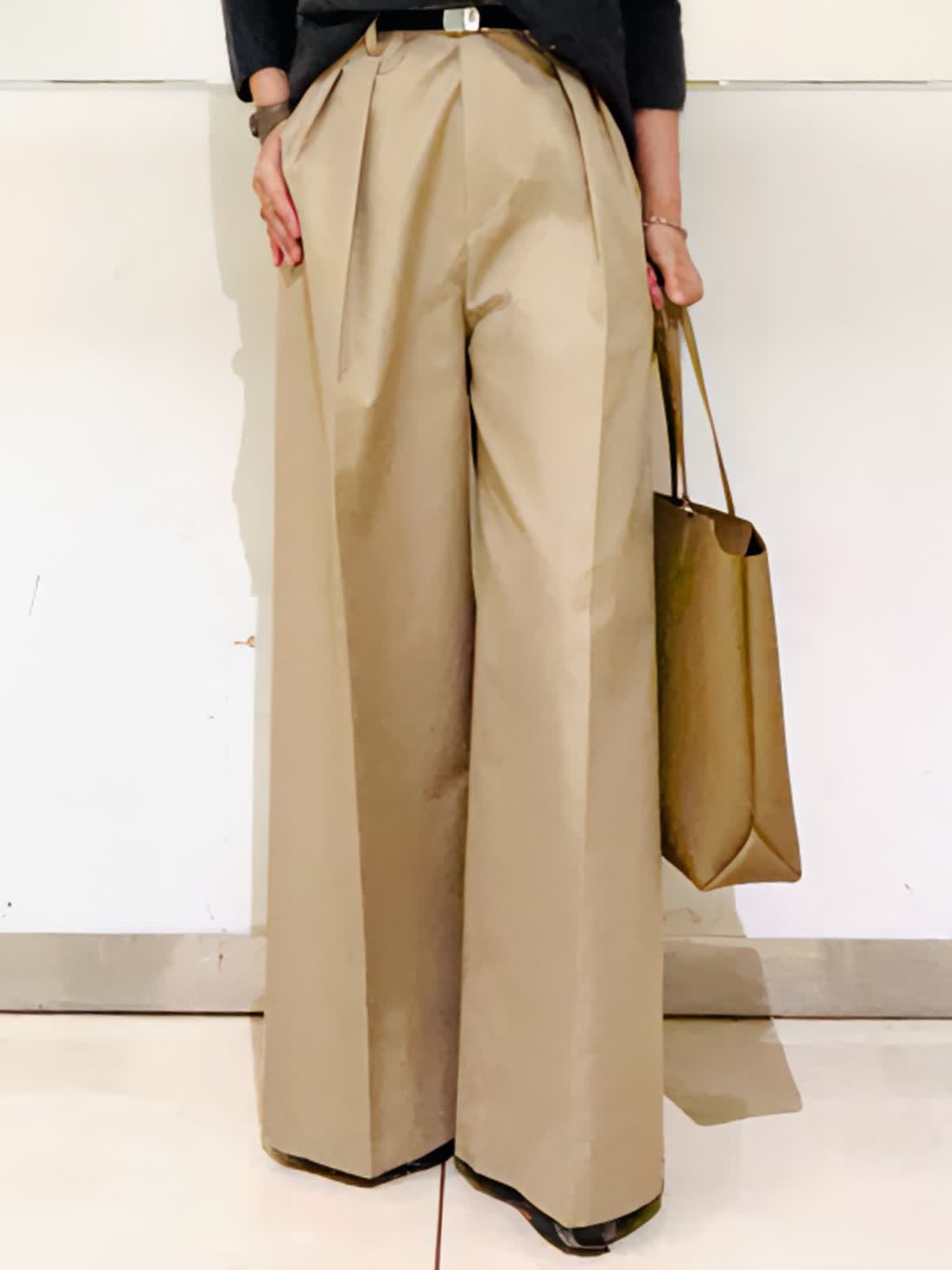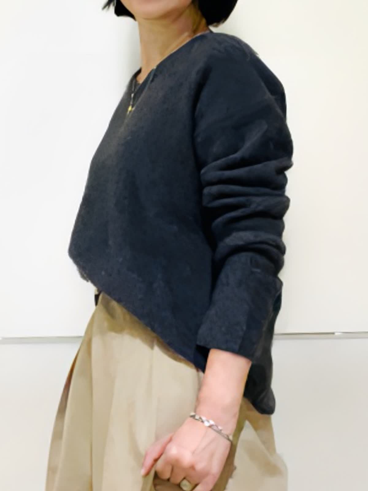【着用アイテム】すべて9号 【着用カラー】ニット:チャコールグレー パンツ:ベージュ ラクーンのふんわりした毛足が可愛いニット。ざっくりしたシルエットとVネックの開きが抜け感があります。深みのあるチャコールグレーが大人可愛いカラーです。足長効果抜群の三尋木さんコラボパンツのベージュとも相性ぴったりでおすすめの組み合わせです。