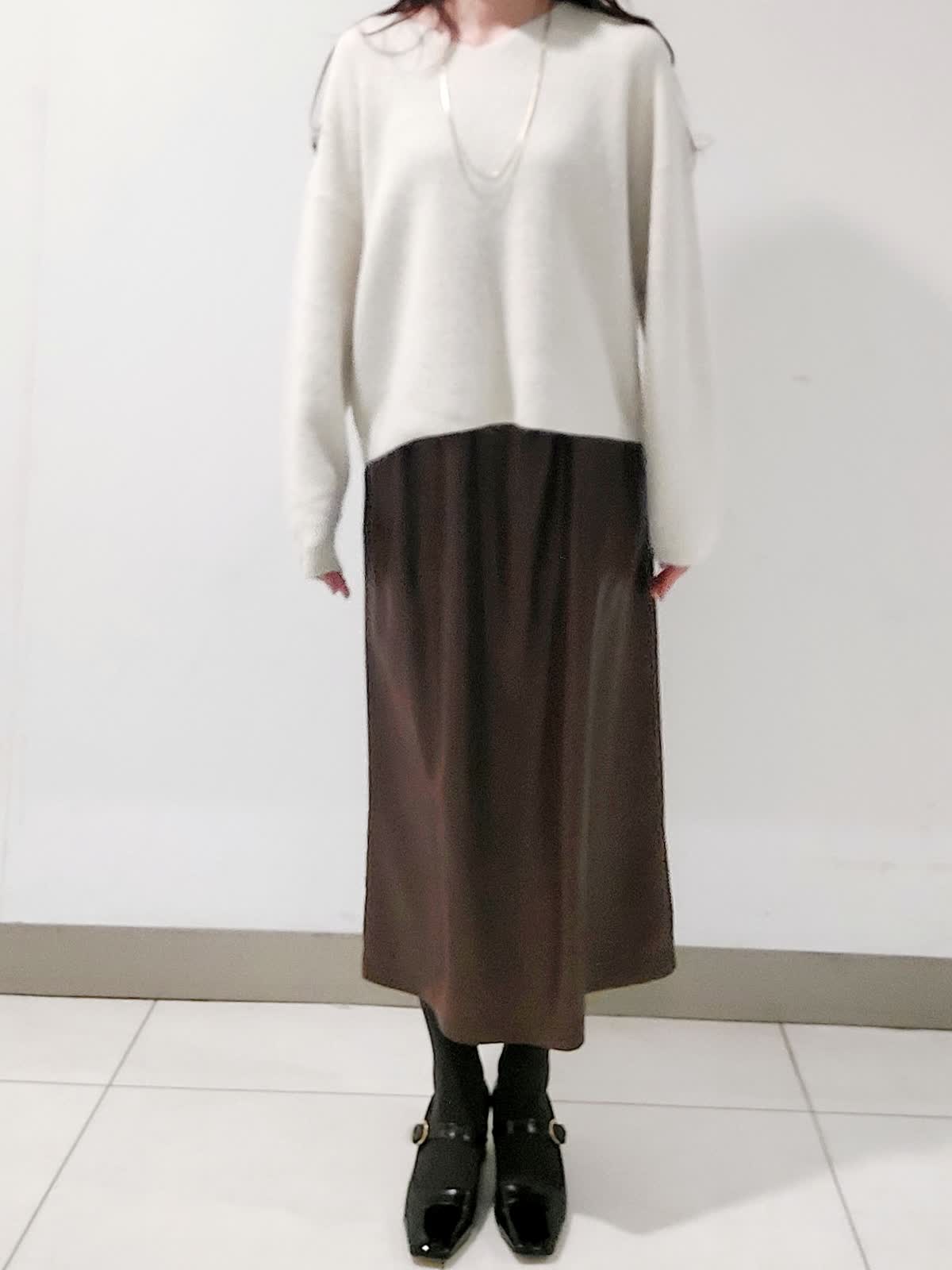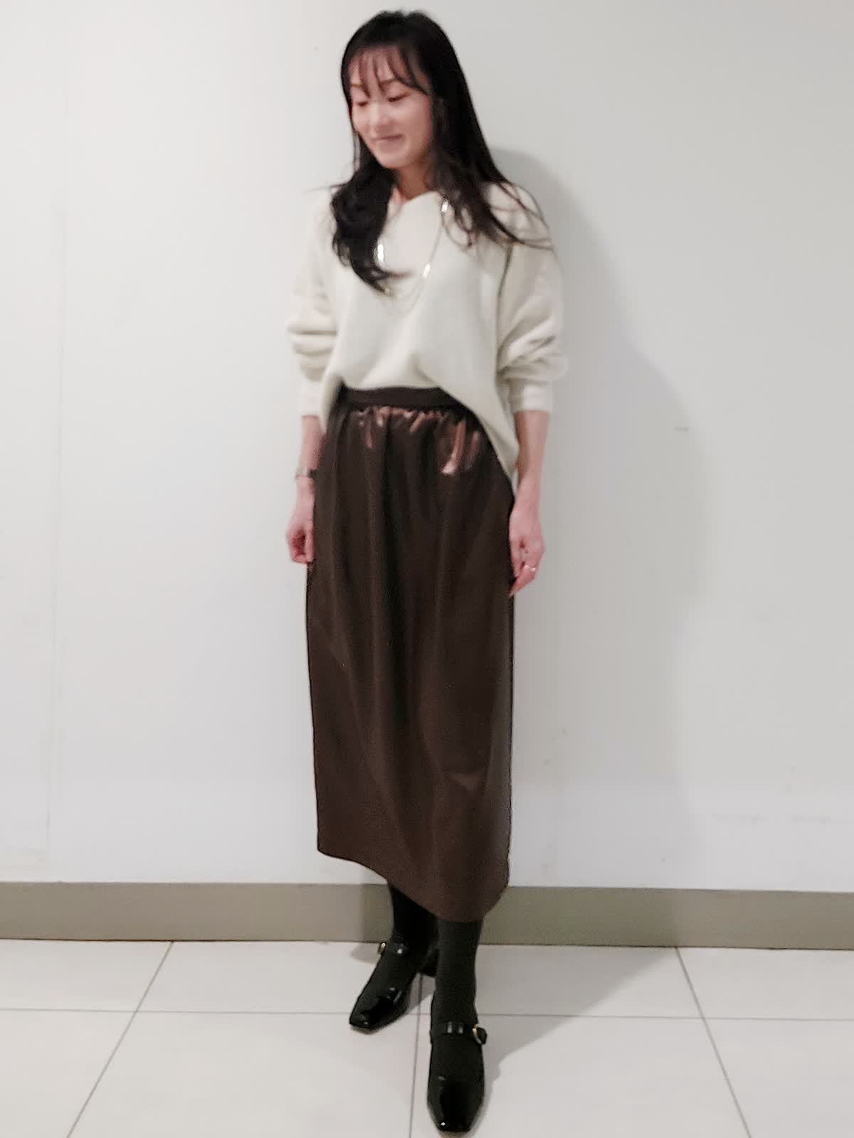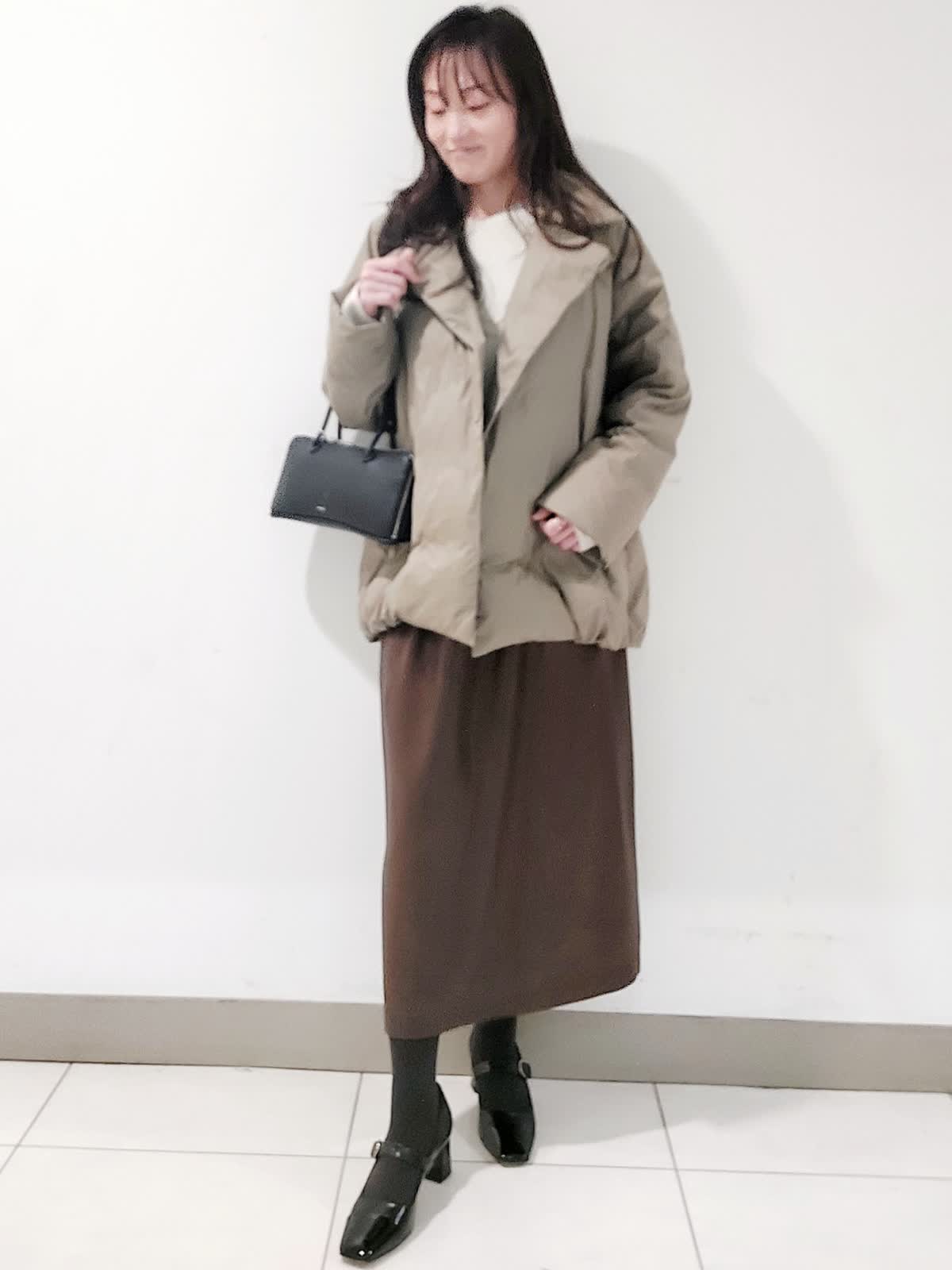 【着用サイズ】ダウン:9号 ニット:フリー スカート:9号 ピーコート風のデザイナがポイントのダウンは、大きめの襟の釦を止めてステンカラーにすることもでき防寒性もプラスしています。軽量素材で着心地抜群で、撥水性・防水性・透湿防風性など機能性も併せもちます。スパンコールVネックニットは、ふんわりとしたアンゴラブレンドの糸にラメとスパンコールを掛け合わせたキラキラとした編み地がステキです。レザーライクギャザースカートは、レザー調の光沢加工を施したやや肉感のあるサテン素材です。すっきり見えしながら身体のラインを拾わないシルエットで、ウエストゴム仕様で着心地も良いです。トレンド感のあるモードなスタイリングです。