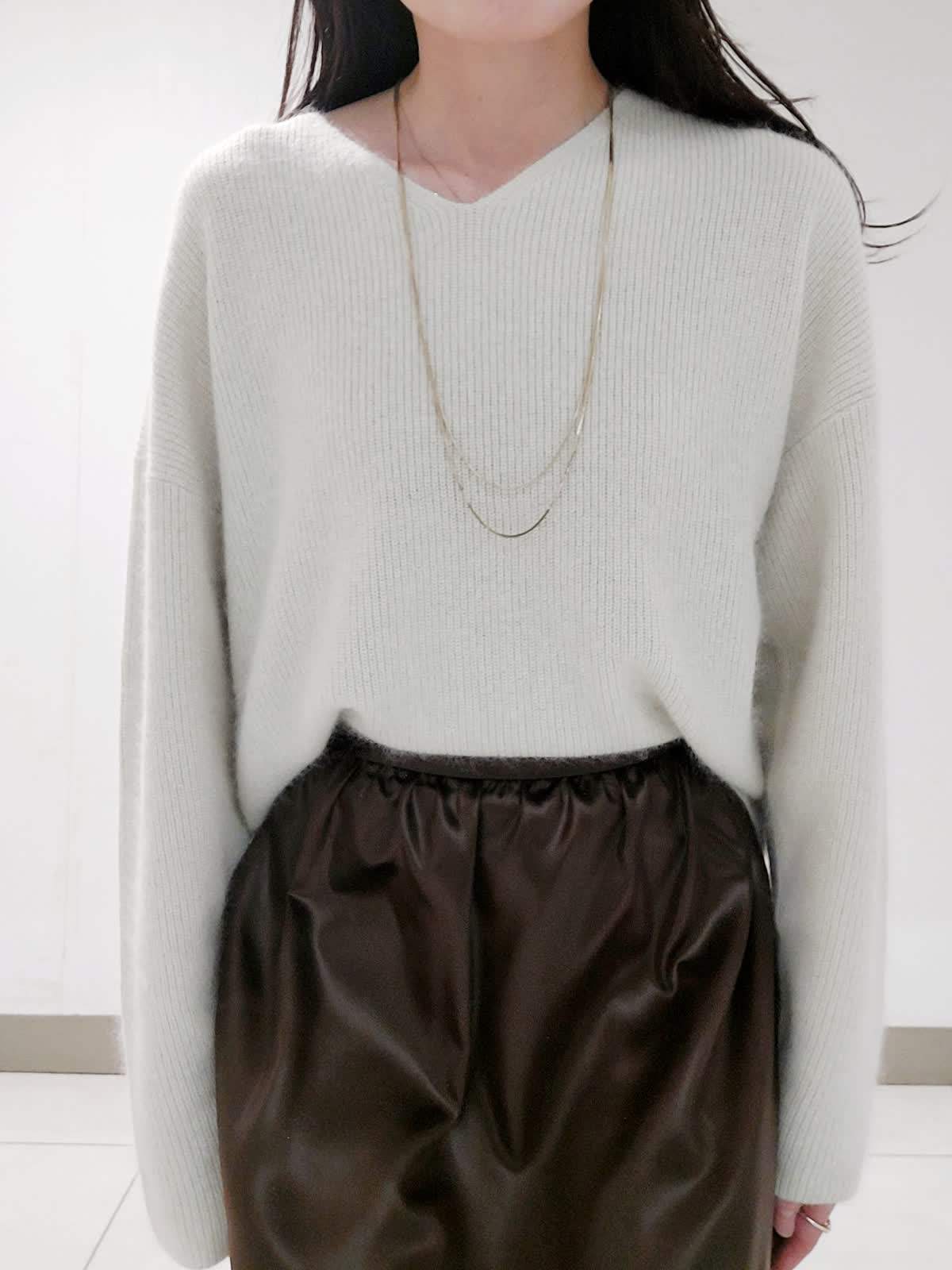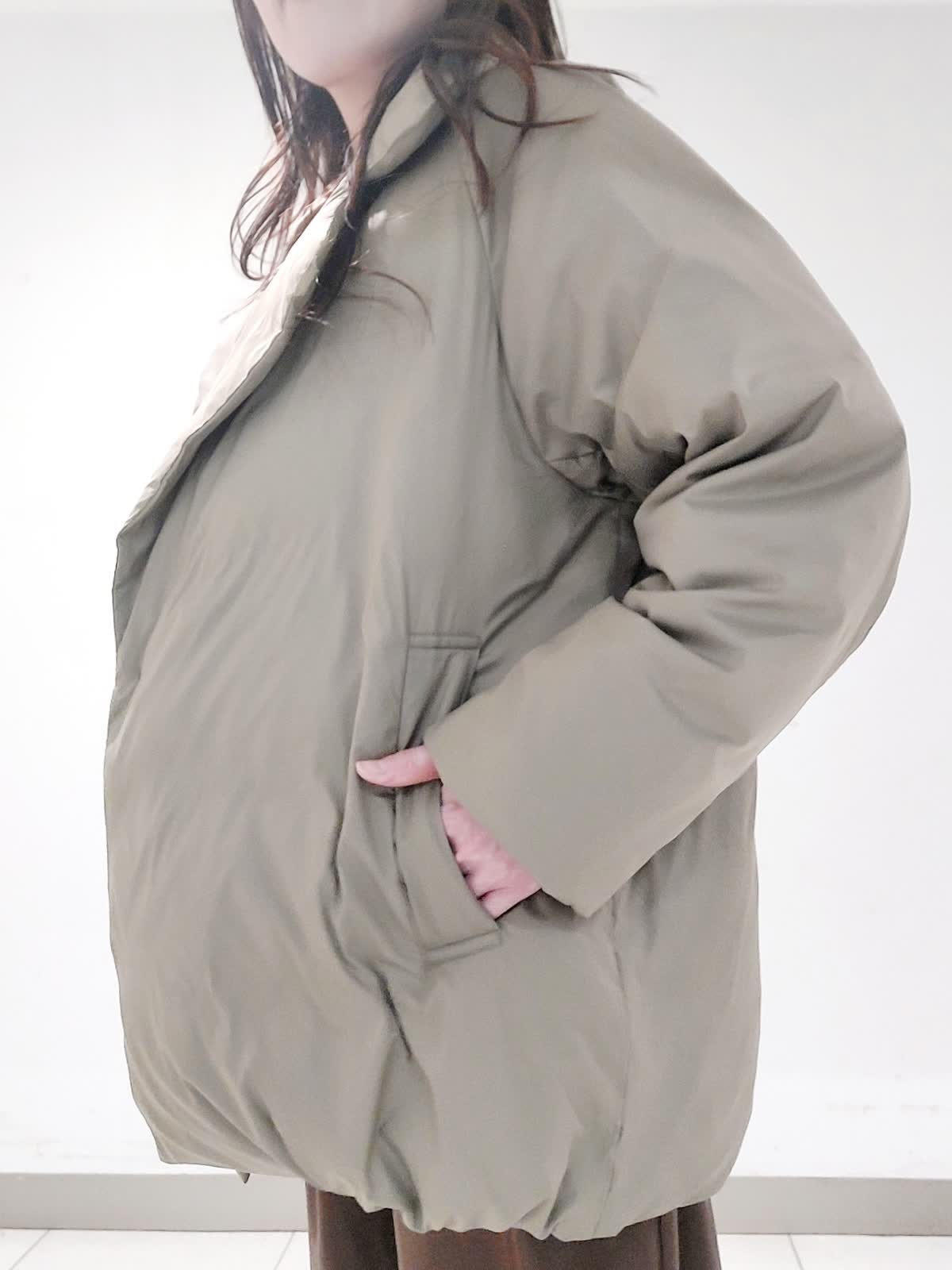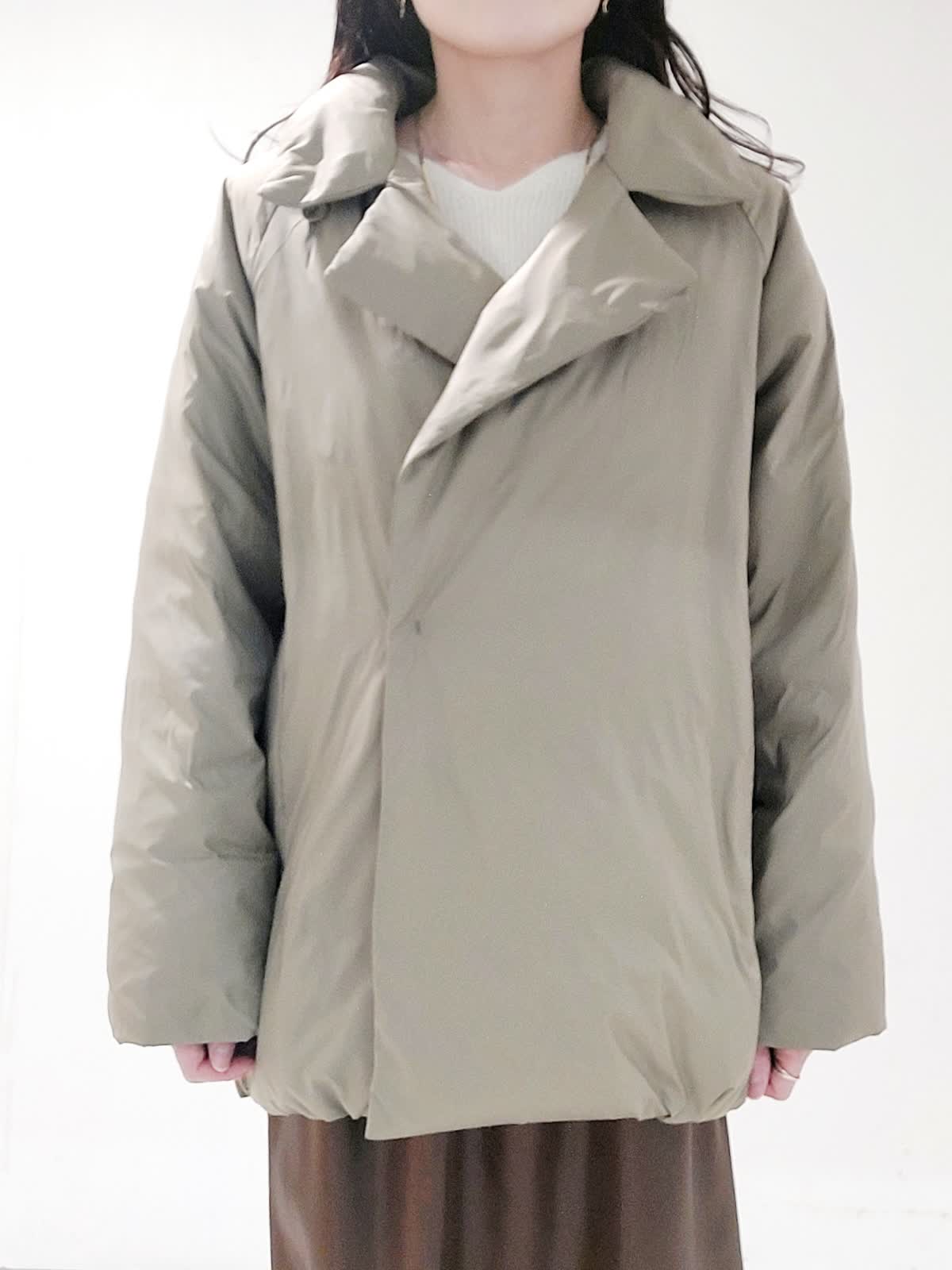 【着用サイズ】ダウン:9号 ニット:フリー スカート:9号 ピーコート風のデザイナがポイントのダウンは、大きめの襟の釦を止めてステンカラーにすることもでき防寒性もプラスしています。軽量素材で着心地抜群で、撥水性・防水性・透湿防風性など機能性も併せもちます。スパンコールVネックニットは、ふんわりとしたアンゴラブレンドの糸にラメとスパンコールを掛け合わせたキラキラとした編み地がステキです。レザーライクギャザースカートは、レザー調の光沢加工を施したやや肉感のあるサテン素材です。すっきり見えしながら身体のラインを拾わないシルエットで、ウエストゴム仕様で着心地も良いです。トレンド感のあるモードなスタイリングです。