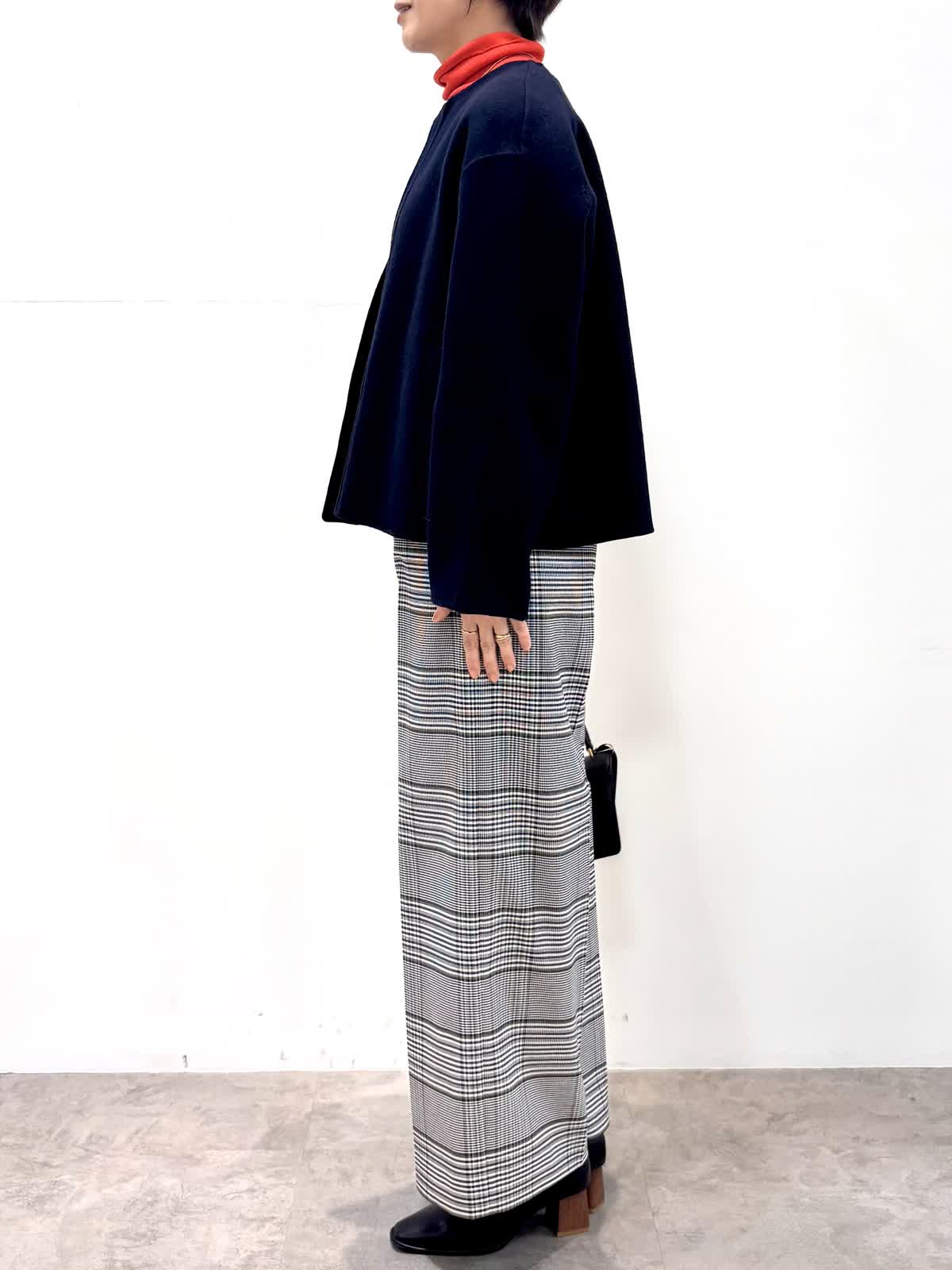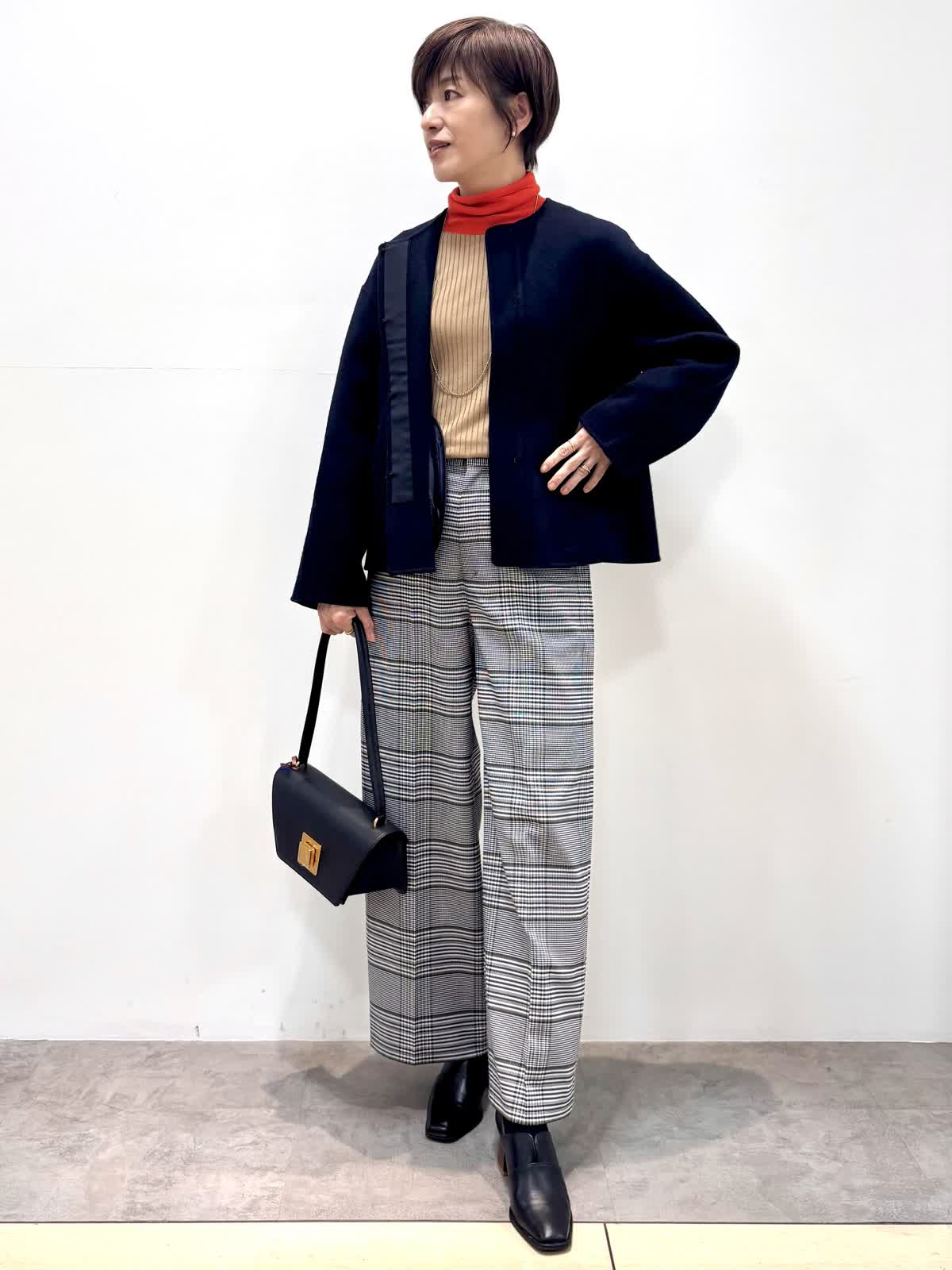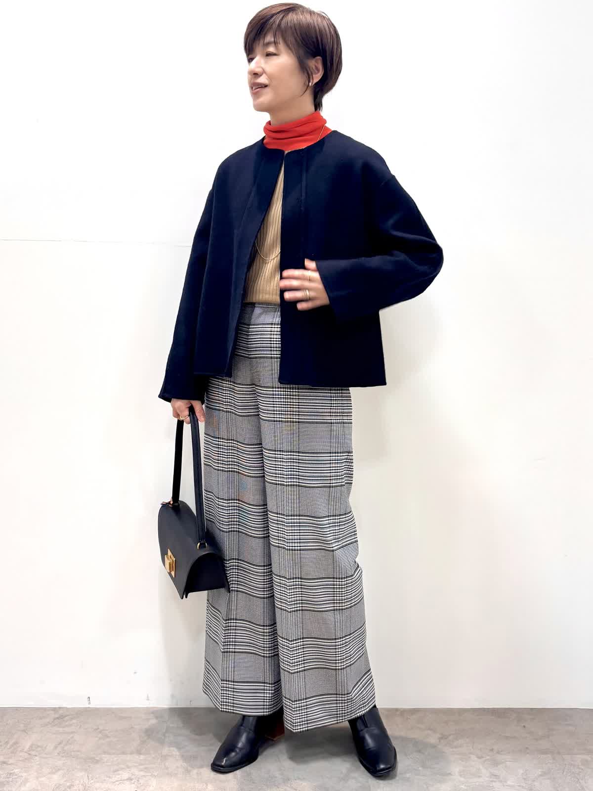 [着用サイズ]コート:9号 ニット:11号 パンツ:9号 [着用カラー]コート:ネイビー ニット:モカチャ パンツ:柄大 軽くて袖通りの良いリバーコートです。コンパクトで軽いのでジャケット感覚で羽織れます。 バイカラーニットはインに入れるとオシャレ度がアップする優れ物です。ウール混のセンタープレスの入ったセミワイドパンツはお仕事から普段使いまで大活躍のパンツです。