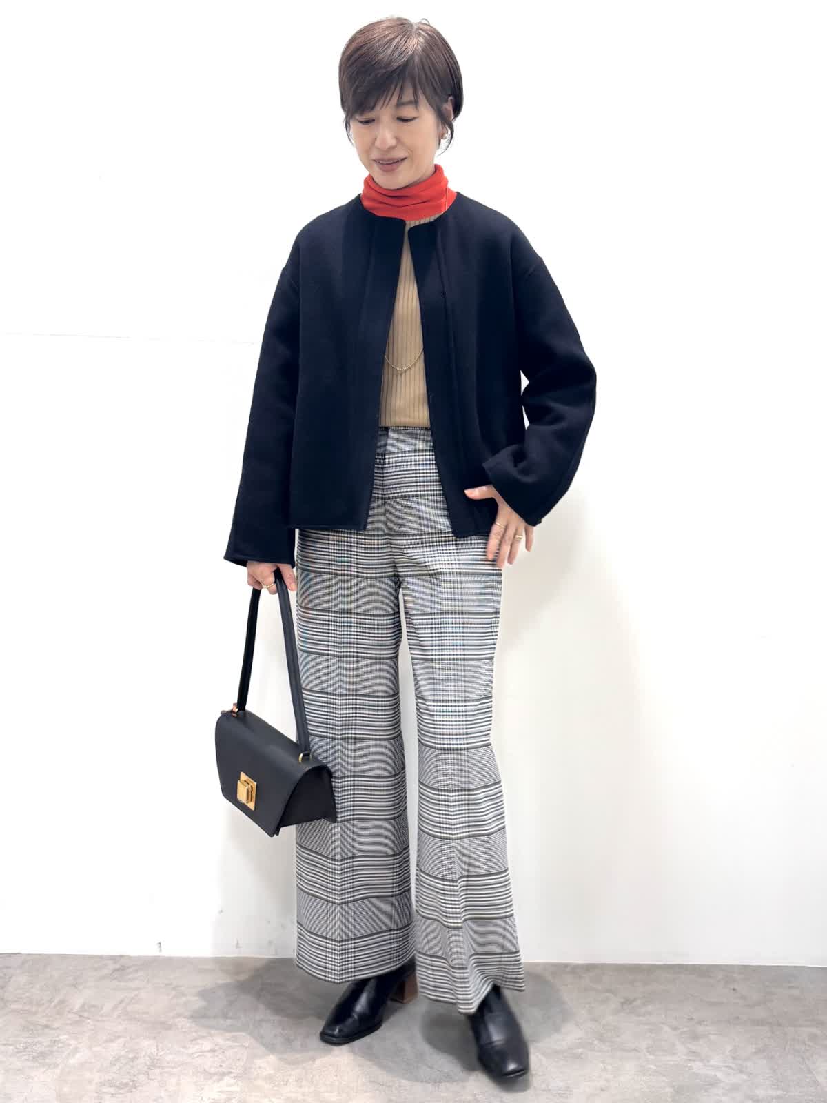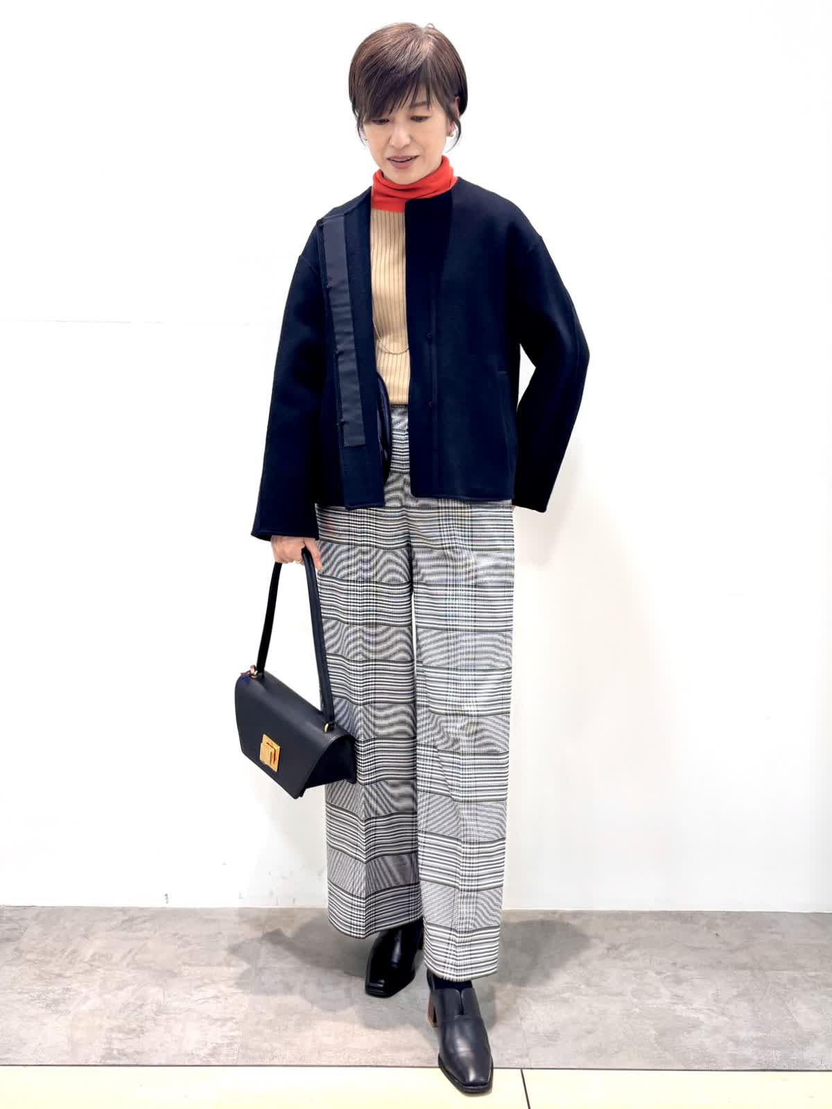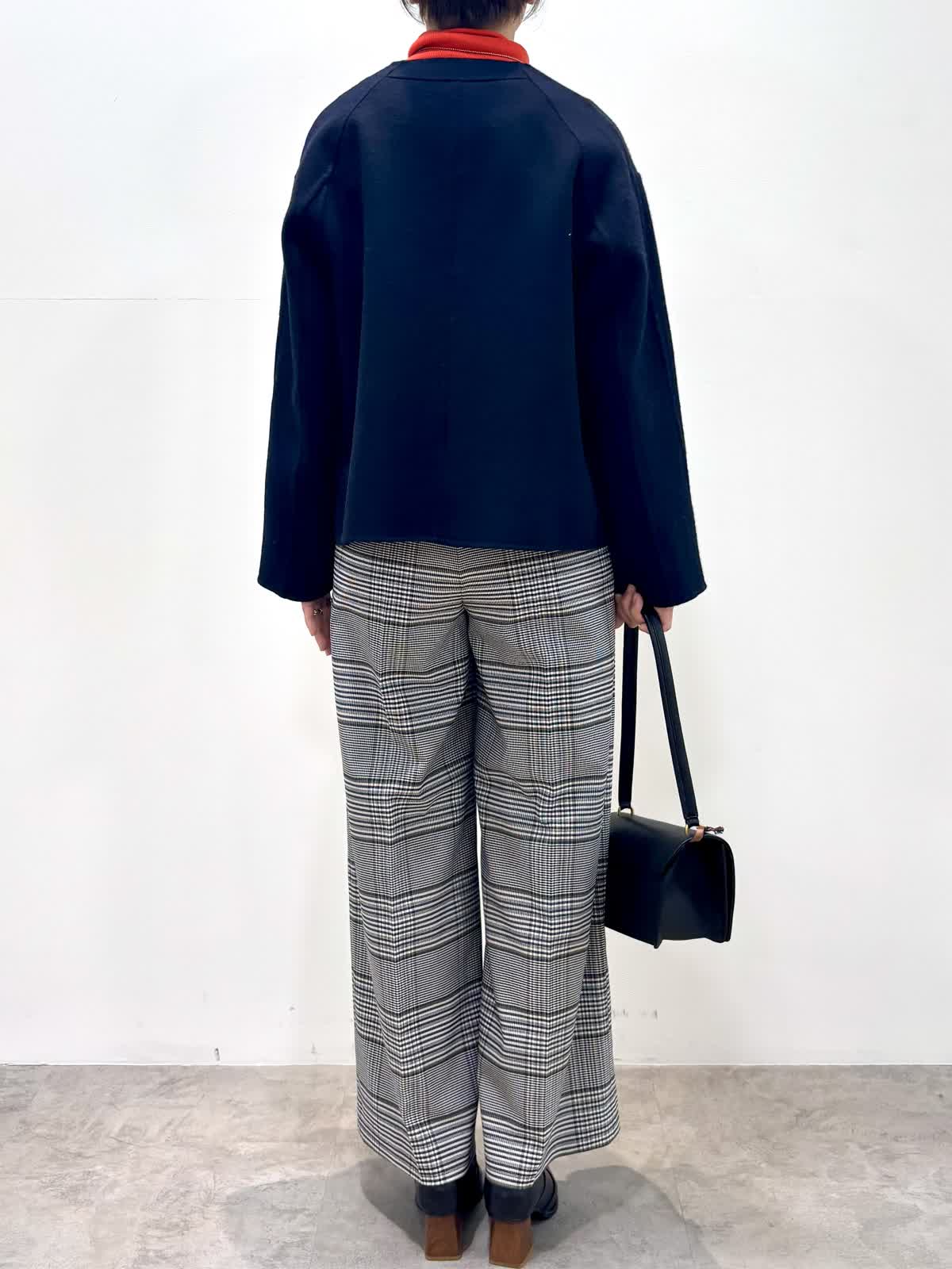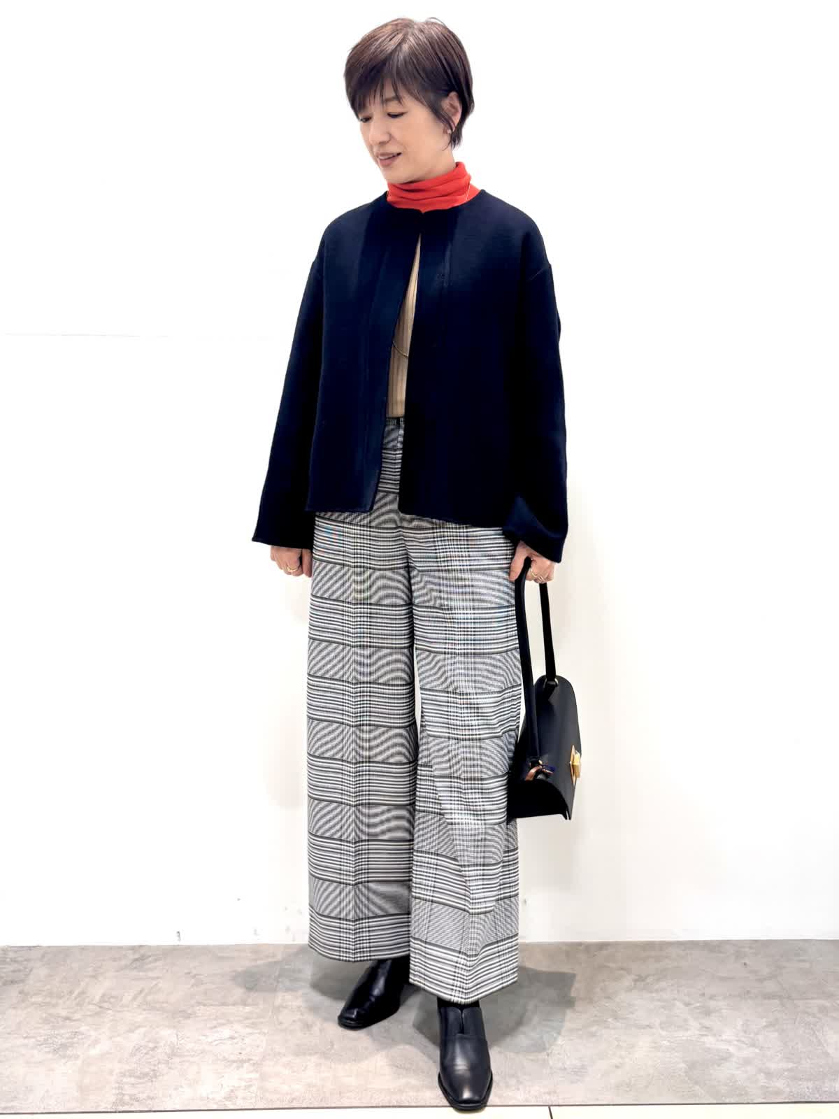 [着用サイズ]コート:9号 ニット:11号 パンツ:9号 [着用カラー]コート:ネイビー ニット:モカチャ パンツ:柄大 軽くて袖通りの良いリバーコートです。コンパクトで軽いのでジャケット感覚で羽織れます。 バイカラーニットはインに入れるとオシャレ度がアップする優れ物です。ウール混のセンタープレスの入ったセミワイドパンツはお仕事から普段使いまで大活躍のパンツです。