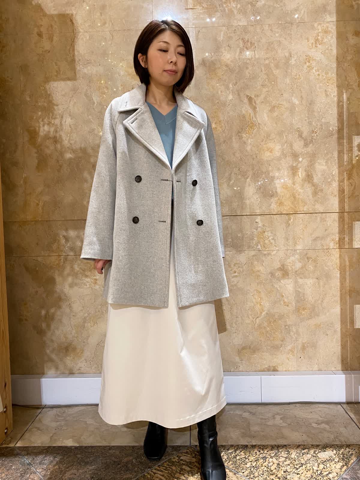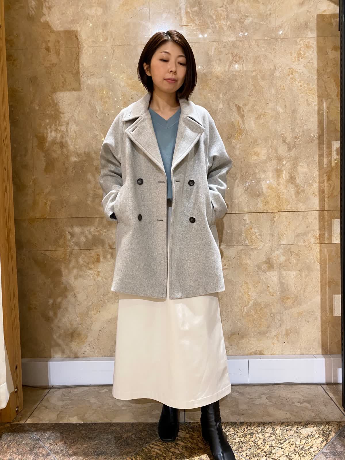 【着用サイズ/カラー】 コート:フリーサイズ/グレー ニット:フリーサイズ/ブルーグレー スカート:9号/ベージュ 定番人気のPコートは、生地がしっかりしているのにとても軽く、肩負担少なめ。襟のボタンを留めれば、ステンカラーにもスタンドカラーにもなる、便利すぎるコートです。ニットは、ふんわり柔らかモチモチ触感でとても気持ちいいんですが、なんと綿素材。お肌が弱い方にもオススメです。スカートは薄手でハリのある素材で、オールシーズン着用可。下半身のラインが響きにくく、ウエストゴムで楽ちんです