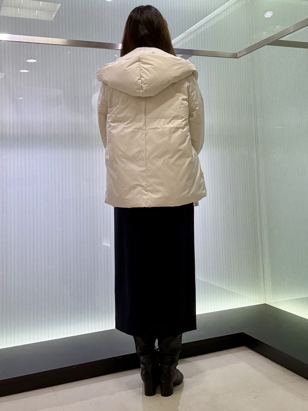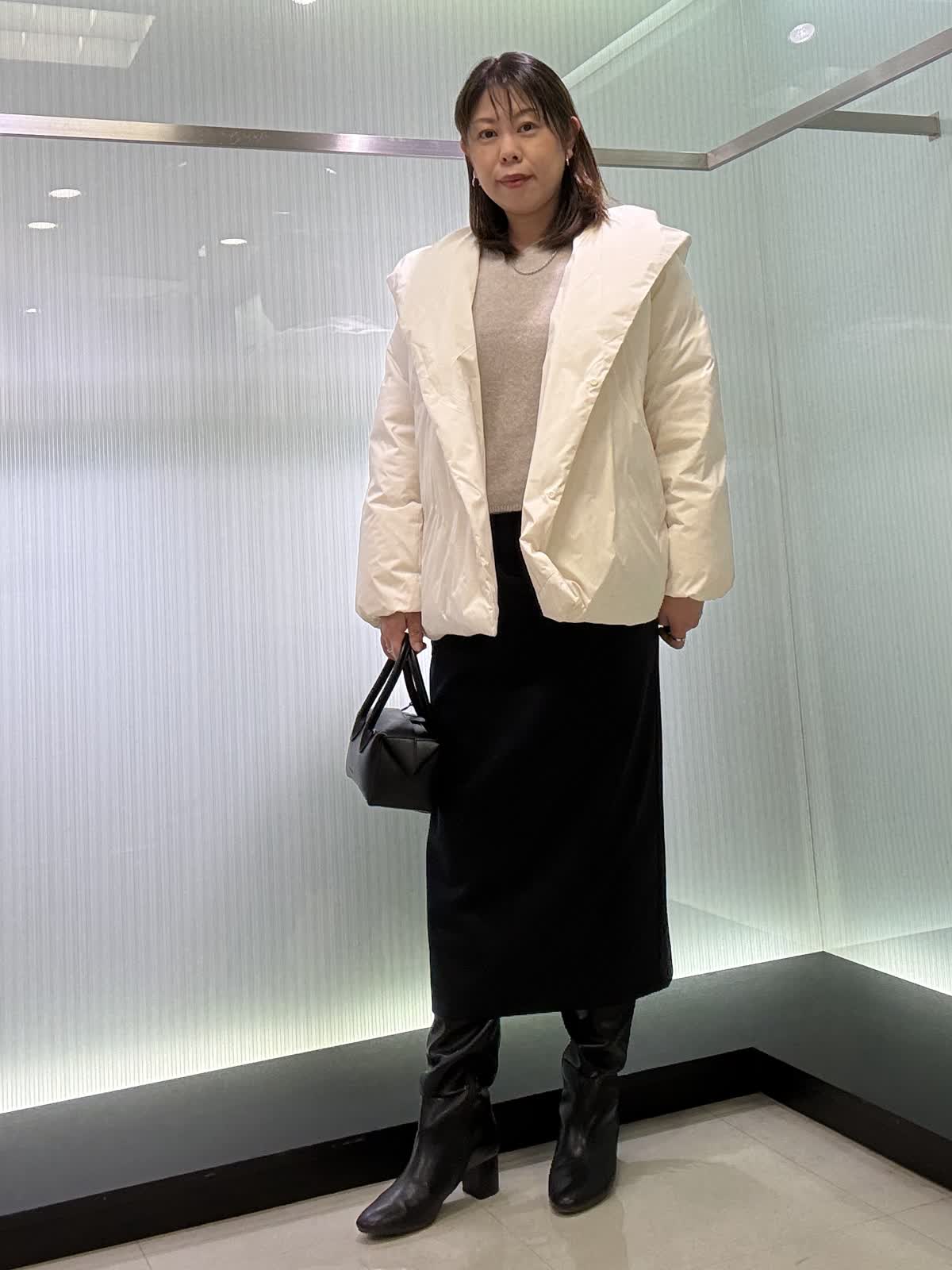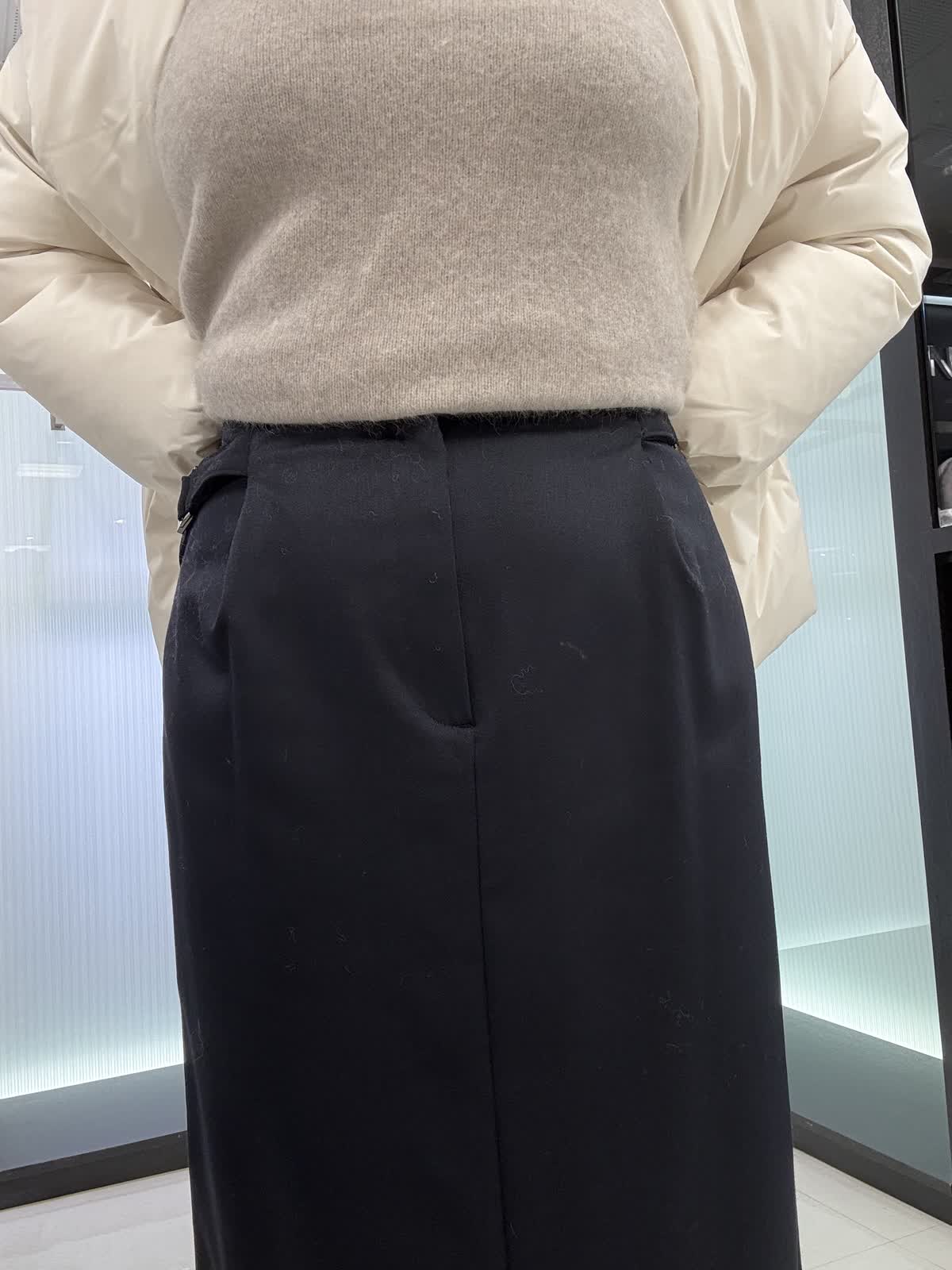 ダウン着用サイズ 9号 ショールカラータイプでフード付きのキレイめダウンになります。全体的にゆったりしているので普段11号ですが、こちらは9号でピッタリでした。軽くて暖かいです!ニット着用サイズ9号 ラクーンが入ったフワフワのVネックニットです。こちらも9号で大丈夫でした。スカート 着用サイズ11号 膝下丈の大人タイトスカート です。光沢感があり、生地も厚すぎずお仕事でもお使いいただけます。裏地付き。