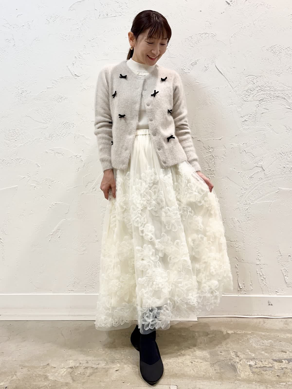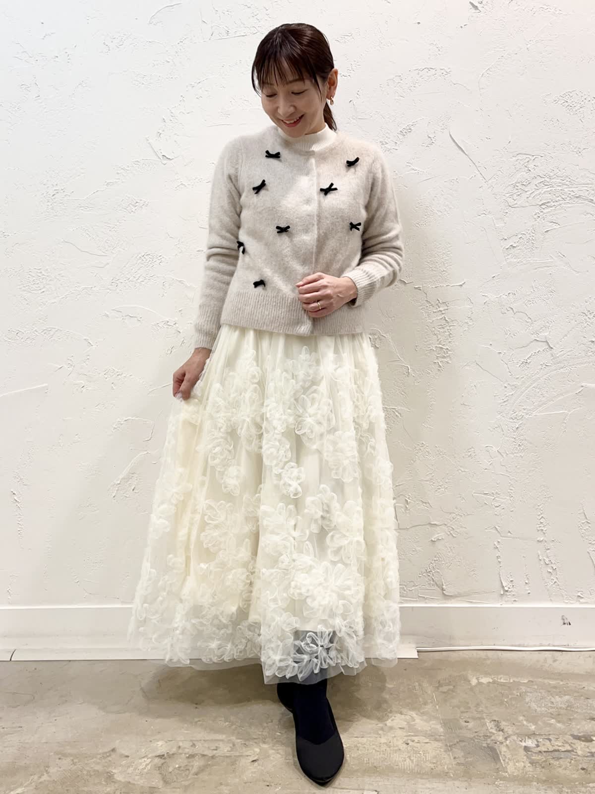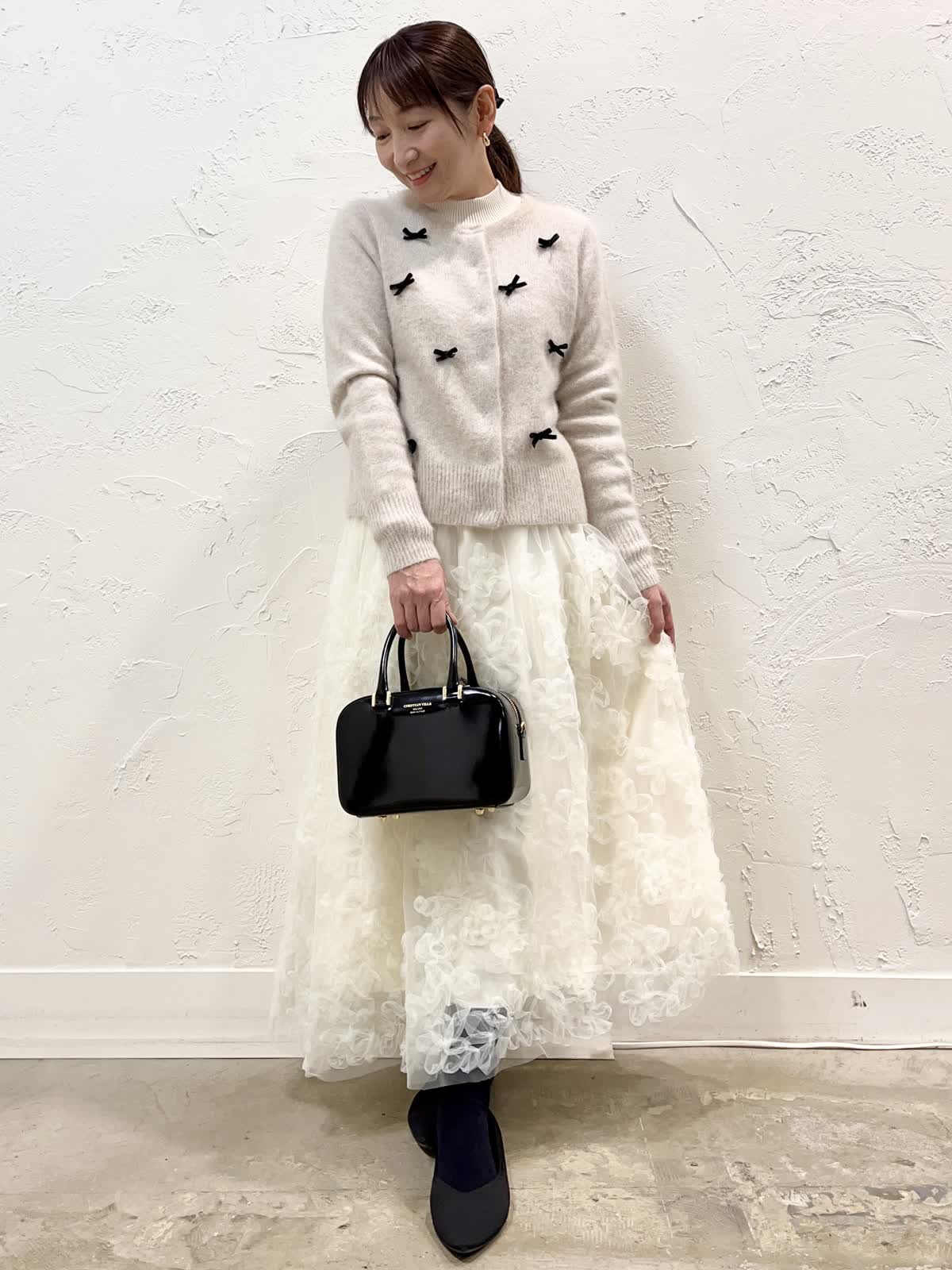 【着用サイズ/カラー】 カーディガン:9号/グレーベージュ ニット:9号/アイボリー スカート:9号/オフホワイト Maglie冬のとっておきコーデ。 女子会やお食事会などみんなで集まる日にもおすすめ!かわいいリボンカーデは自然と笑顔を誘います♪冬のホワイトを中心としたスタイリングは、とても上品で好印象まちがいなし◎