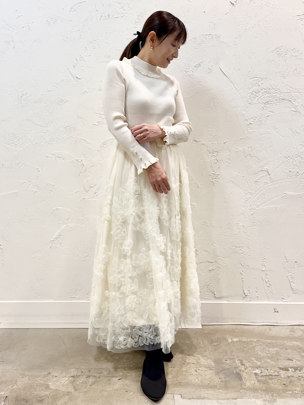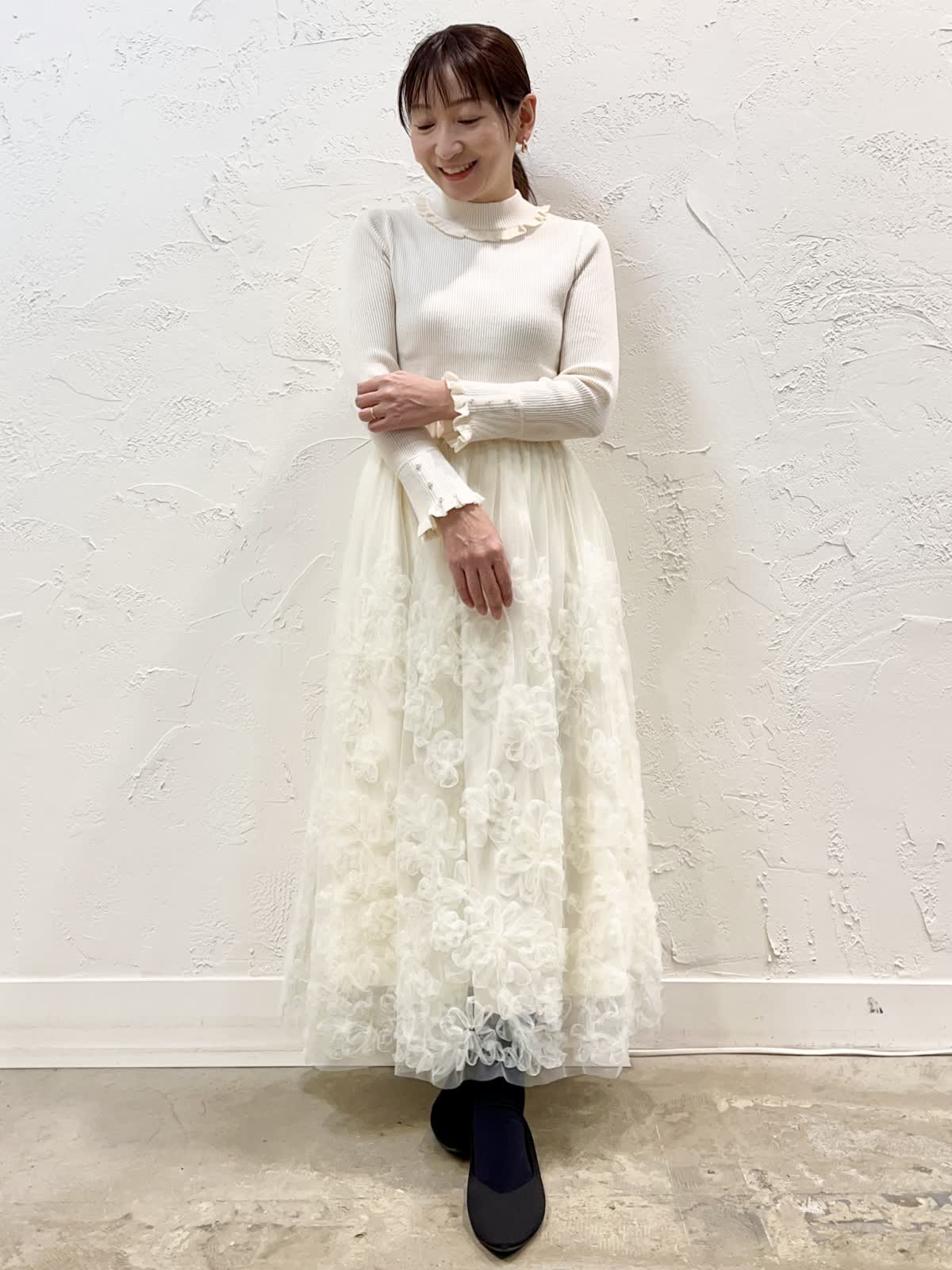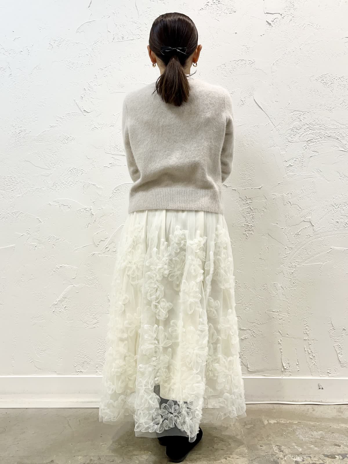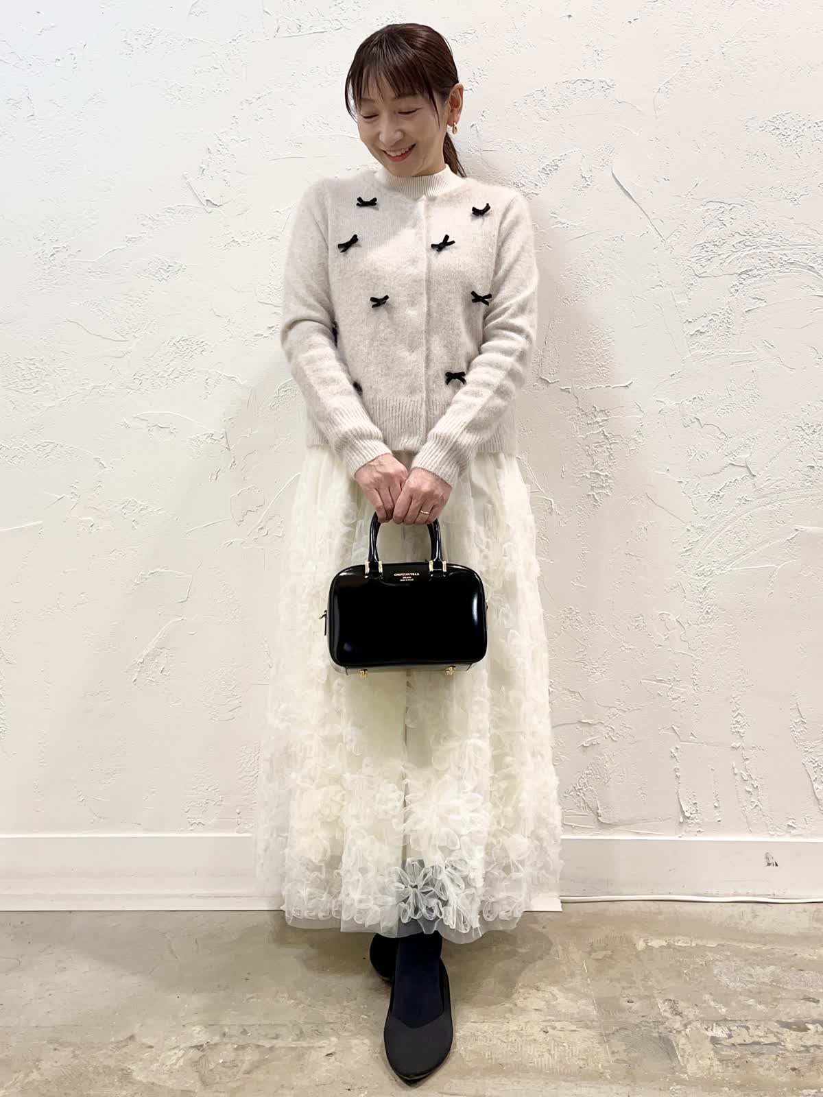 【着用サイズ/カラー】 カーディガン:9号/グレーベージュ ニット:9号/アイボリー スカート:9号/オフホワイト Maglie冬のとっておきコーデ。 女子会やお食事会などみんなで集まる日にもおすすめ!かわいいリボンカーデは自然と笑顔を誘います♪冬のホワイトを中心としたスタイリングは、とても上品で好印象まちがいなし◎