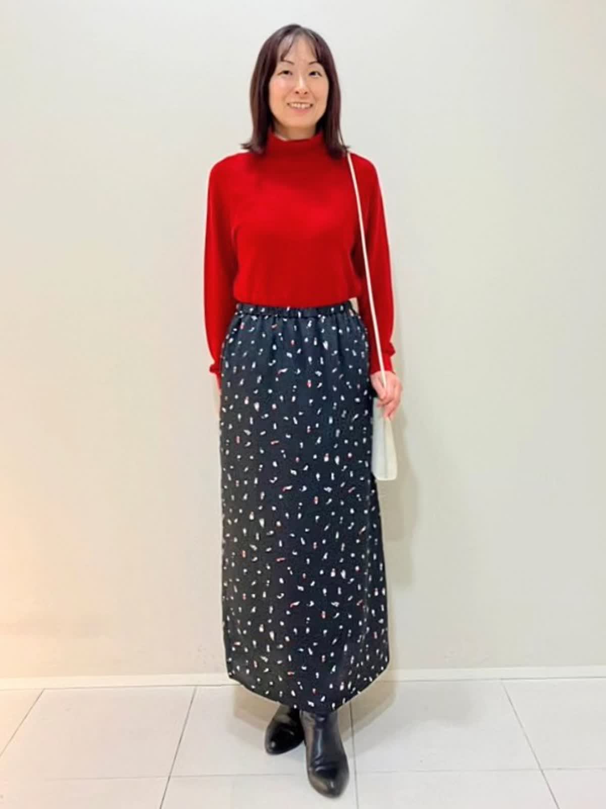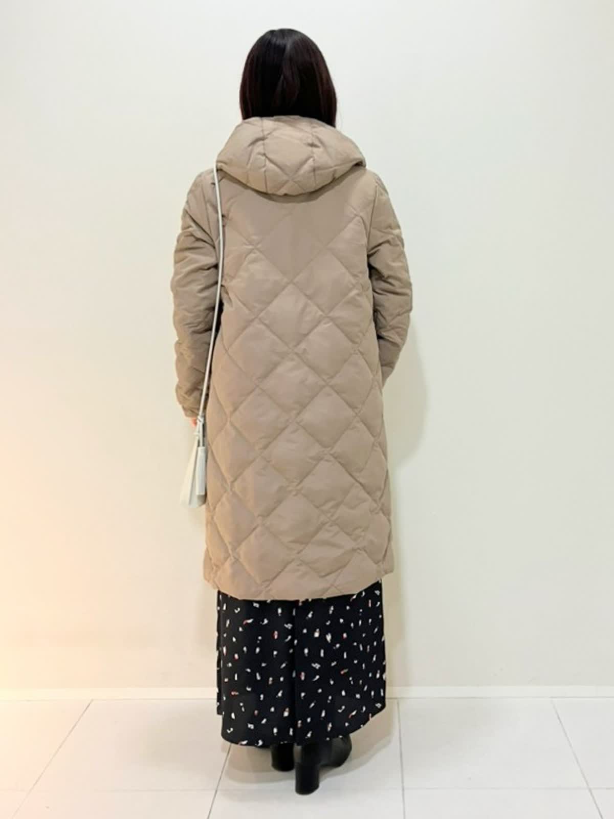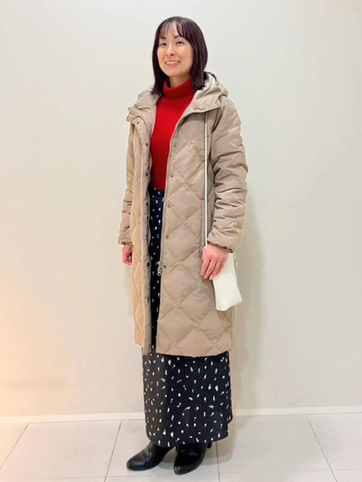 【着用サイズ】ダウン:9号 ニット:9号 スカート:フリー 【着用カラー】ダウン:キャメル ニット:レッド スカート:ブラック 寒い日のおでかけスタイル フード付きのロングダウンは、軽くて暖かく気軽に着ていただけるアイテム。タートルはサラッとした肌触りで適度なゆとりがあり、スカートはウエストゴム仕様で締めつけ感がなくストレスフリーです。