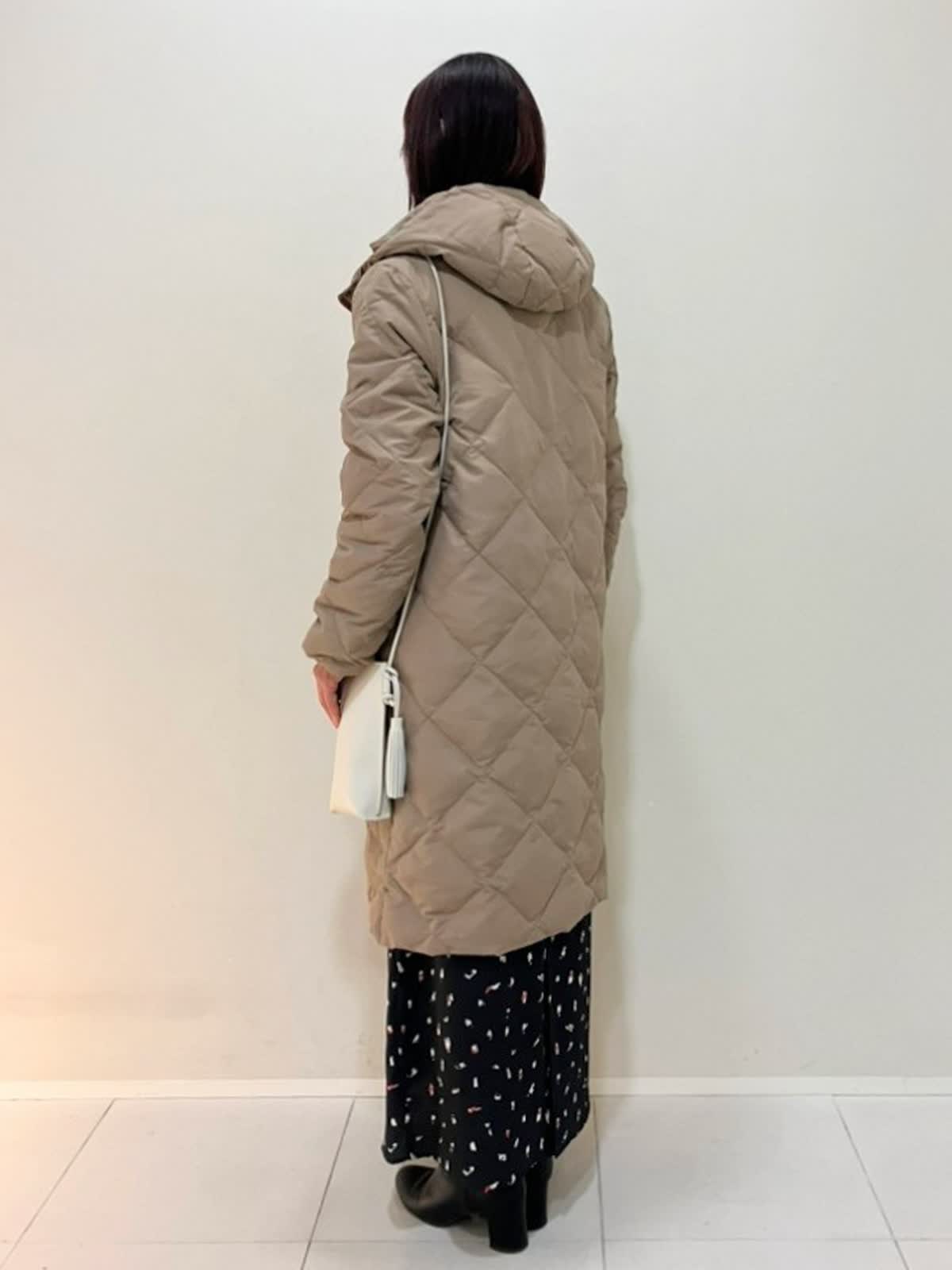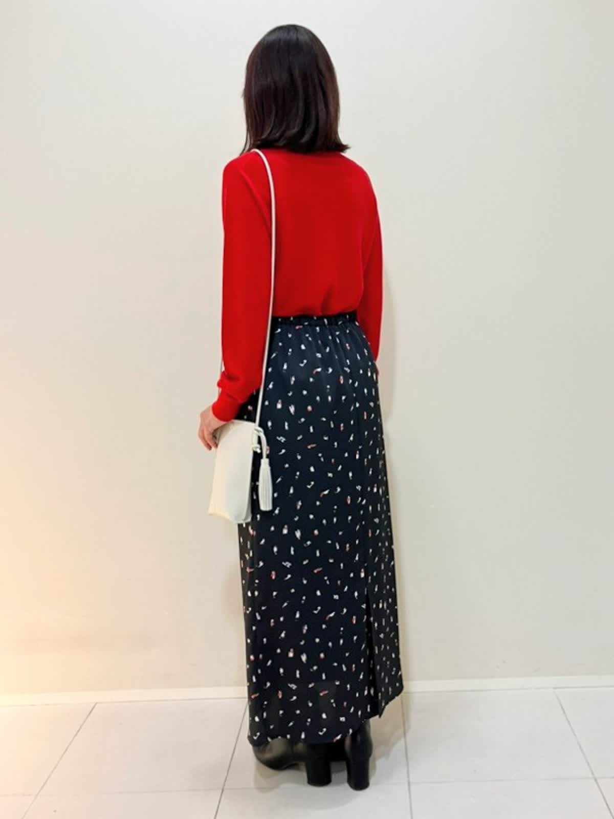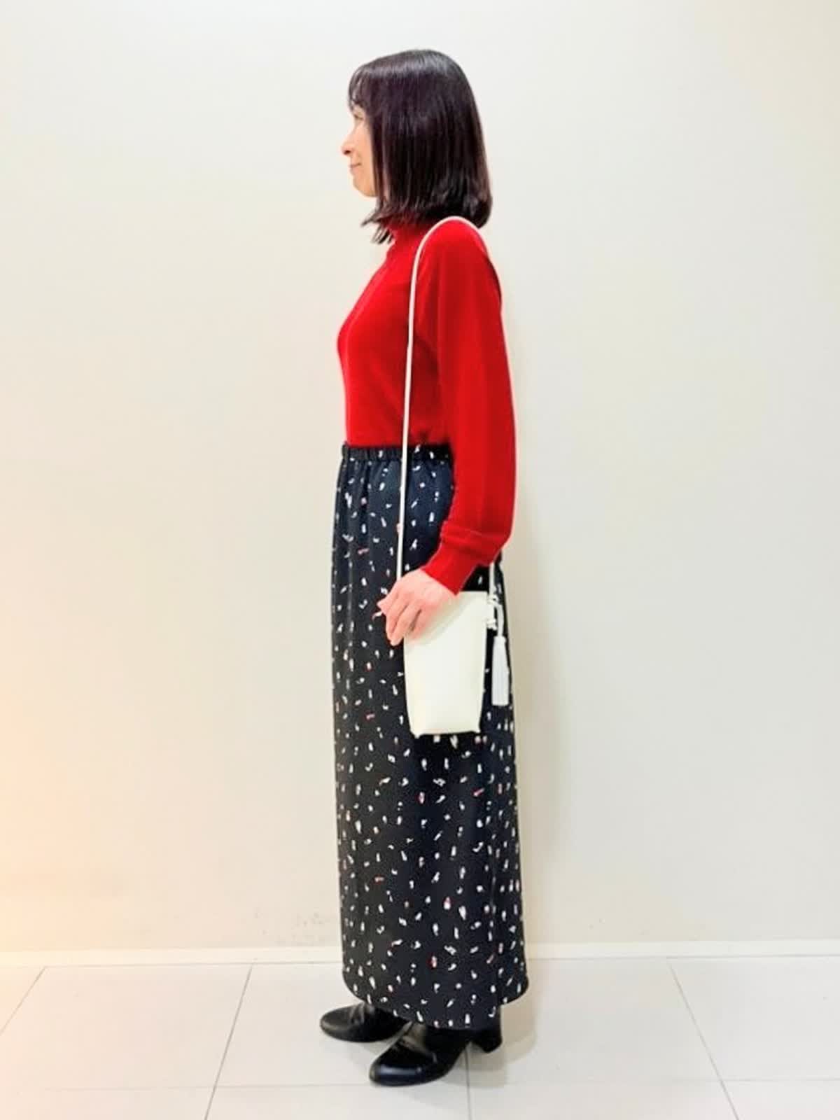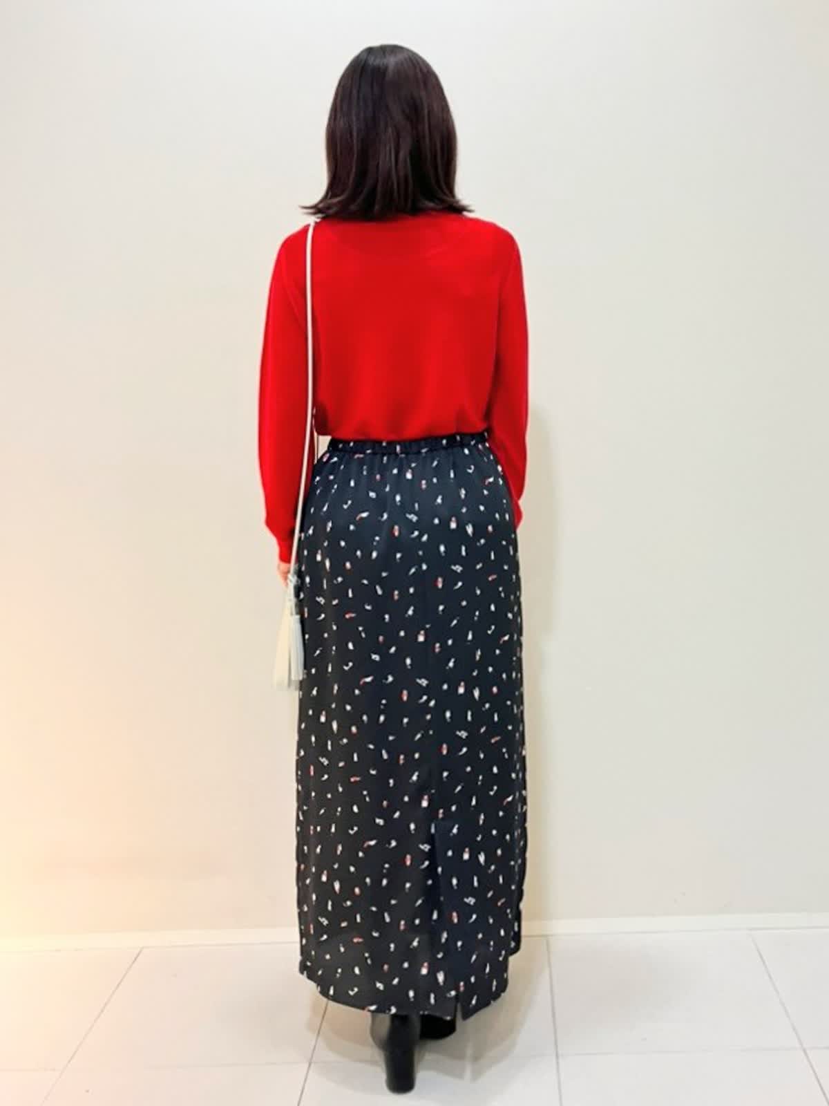 【着用サイズ】ダウン:9号 ニット:9号 スカート:フリー 【着用カラー】ダウン:キャメル ニット:レッド スカート:ブラック 寒い日のおでかけスタイル フード付きのロングダウンは、軽くて暖かく気軽に着ていただけるアイテム。タートルはサラッとした肌触りで適度なゆとりがあり、スカートはウエストゴム仕様で締めつけ感がなくストレスフリーです。