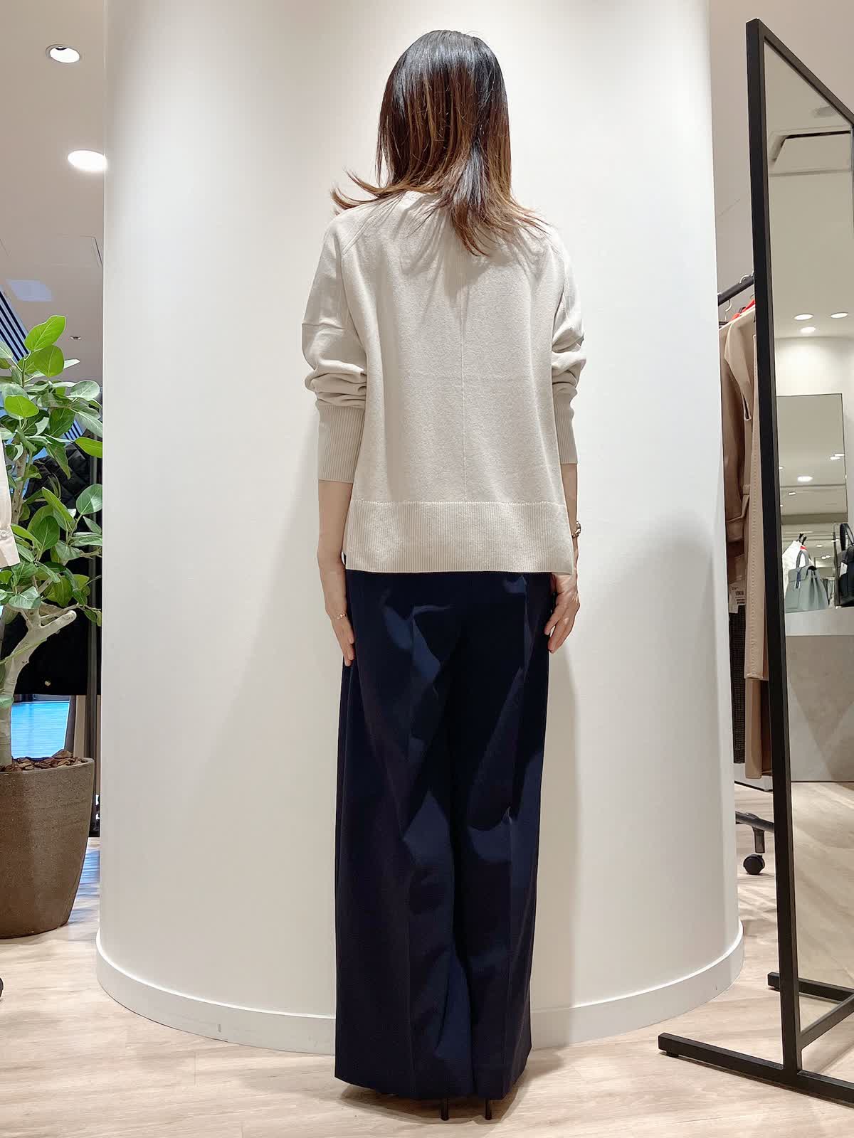【着用サイズ】ニット:9号 パンツ:7号【着用カラー】ニット:グレーベージュ パンツ:ネイビー コーディネートのテーマは通勤スタイリングです。 ウール100%のニットは、落ち感が綺麗で、華奢見えするデザイン。クルーネックで、開きも少なく上品です。ネイビーのワイドパンツで合わせて、きちんと感がある通勤コーディネートに。