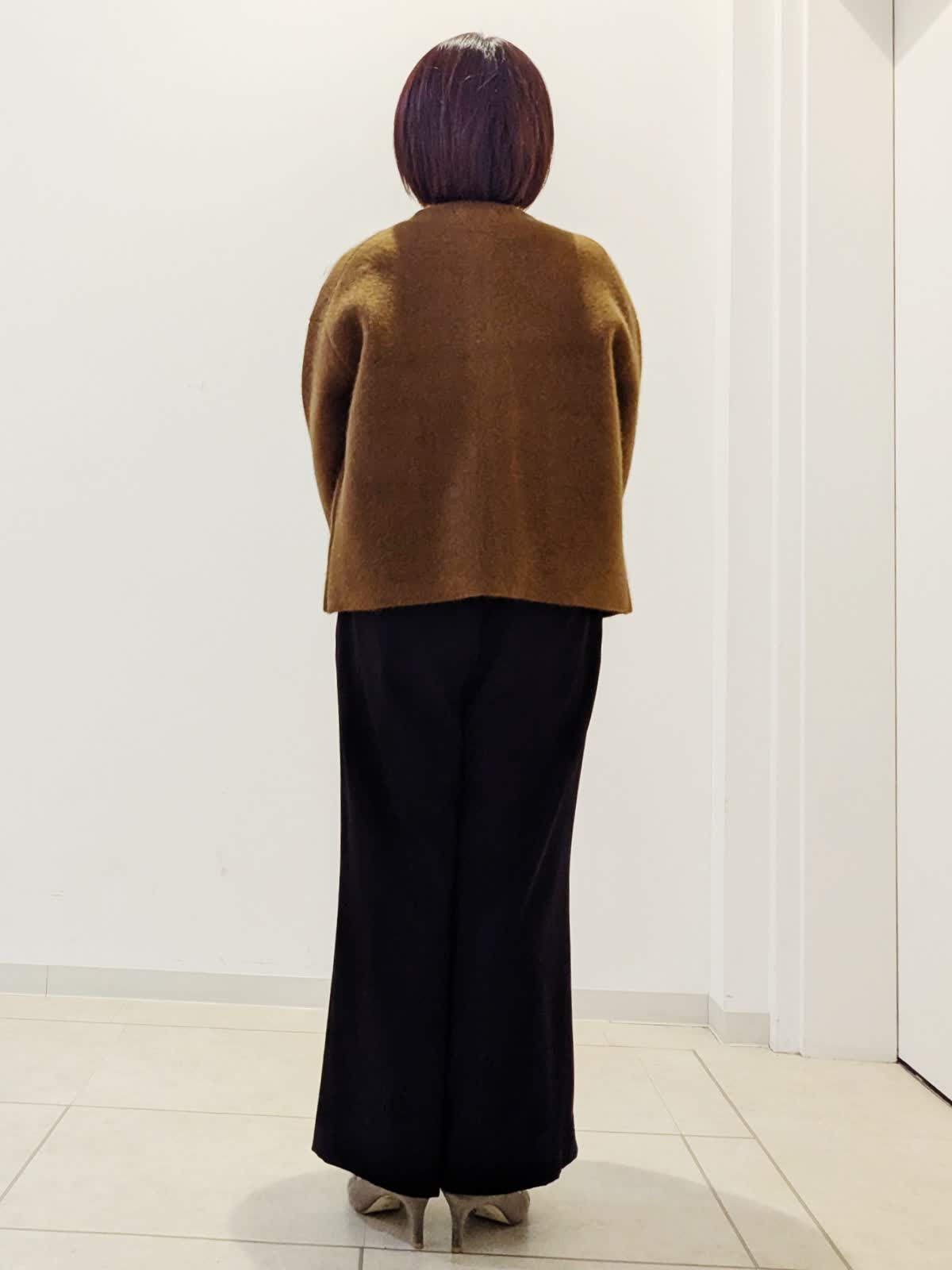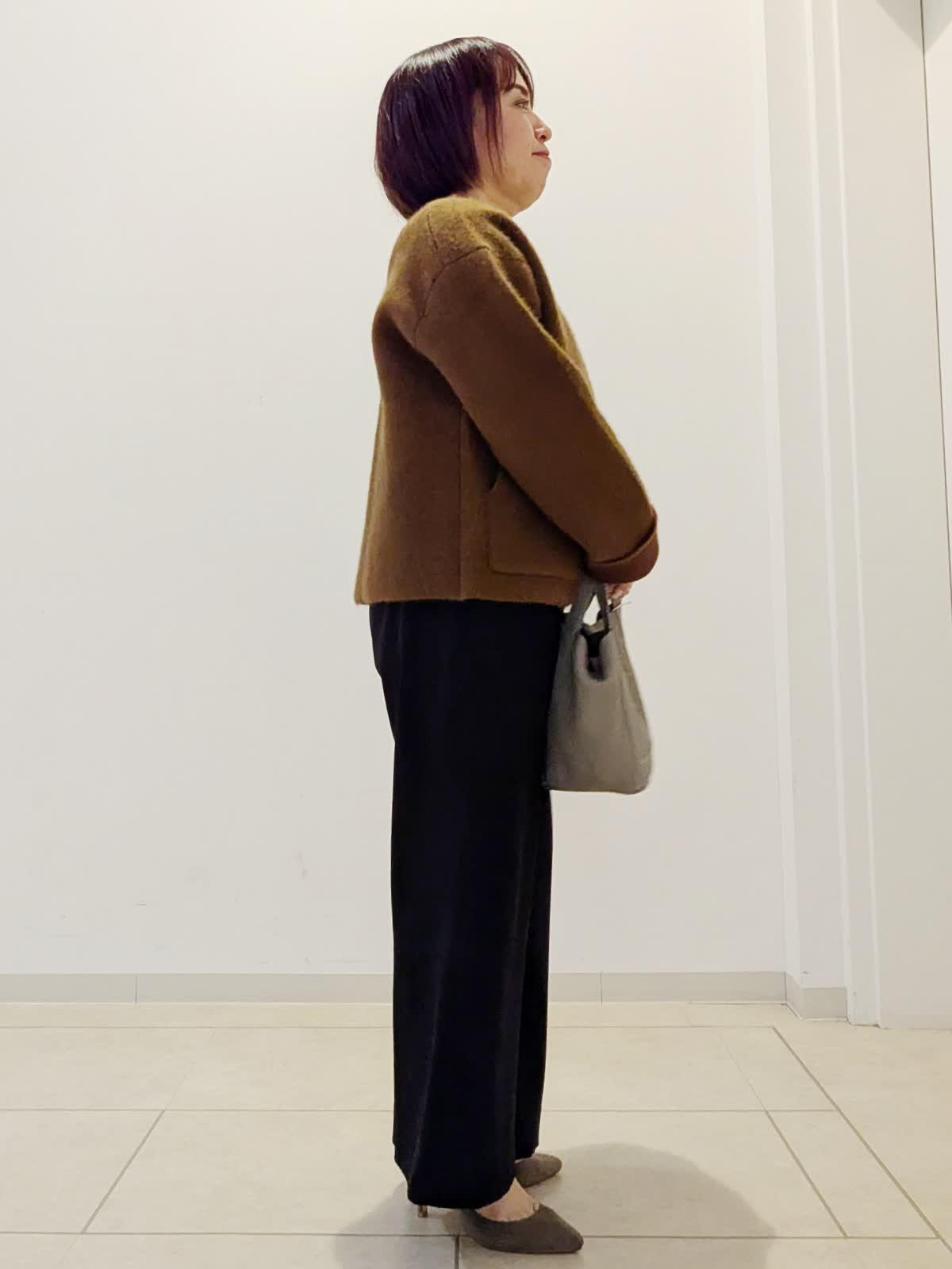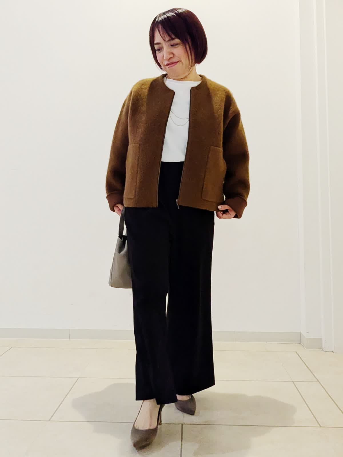 【着用サイズ】ブルゾン:フリー カットソー:フリー パンツ:7号【着用カラー】ブルゾン:ブラウンカットソー:オフホワイト パンツ:ブラック 冬の通勤コーデです。ブルゾンはカーディガン以上コート未満の厚さで前がジップ仕様。短めの着丈なのでボトムを選ばずあわせていただけます。パンツはウエスト総ゴムのワイドパンツ。足がスッキリ見えるように作られているのがうれしいポイントです。私は着丈10センチカットしています。