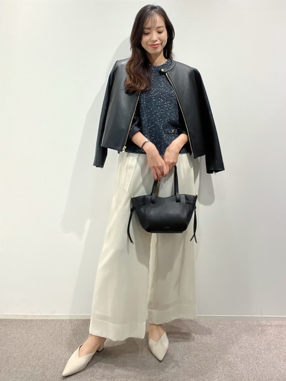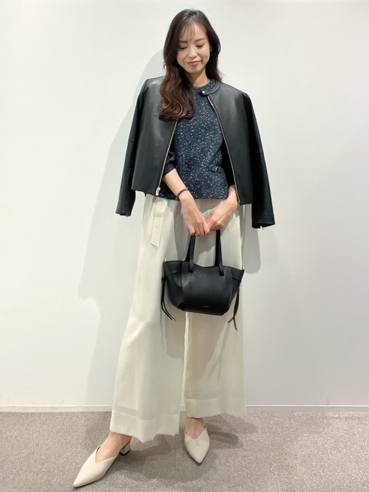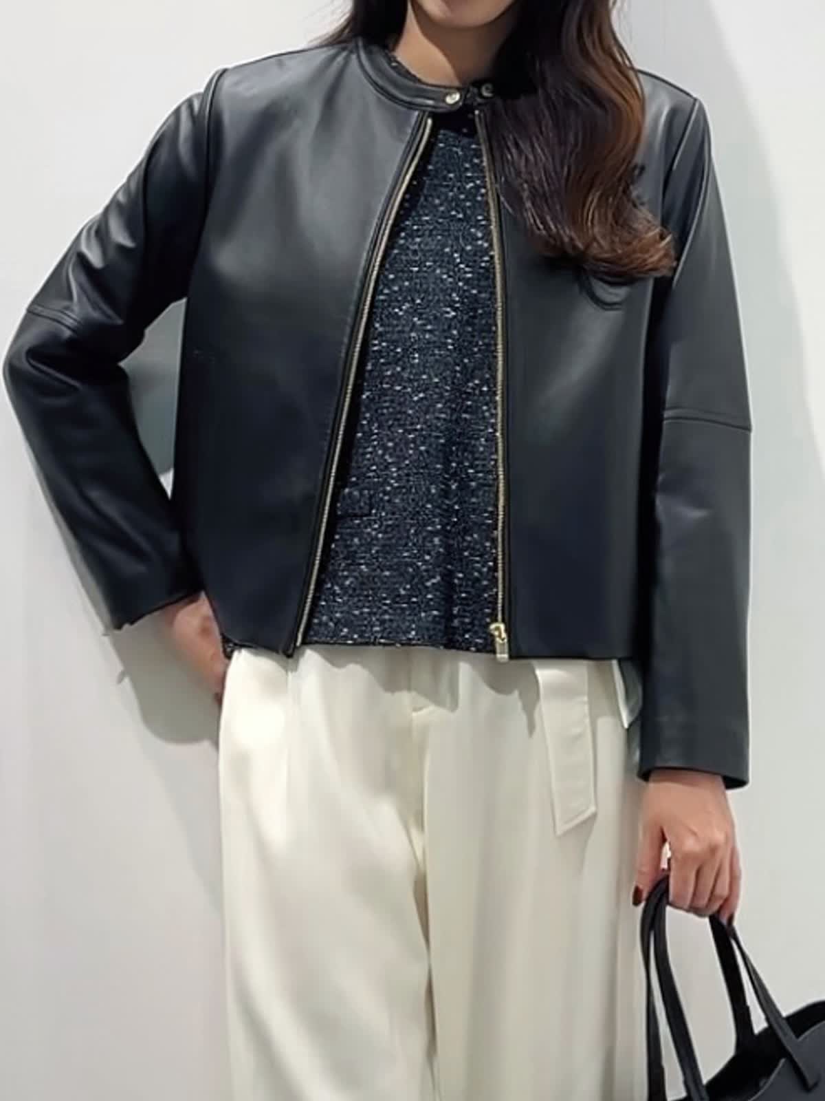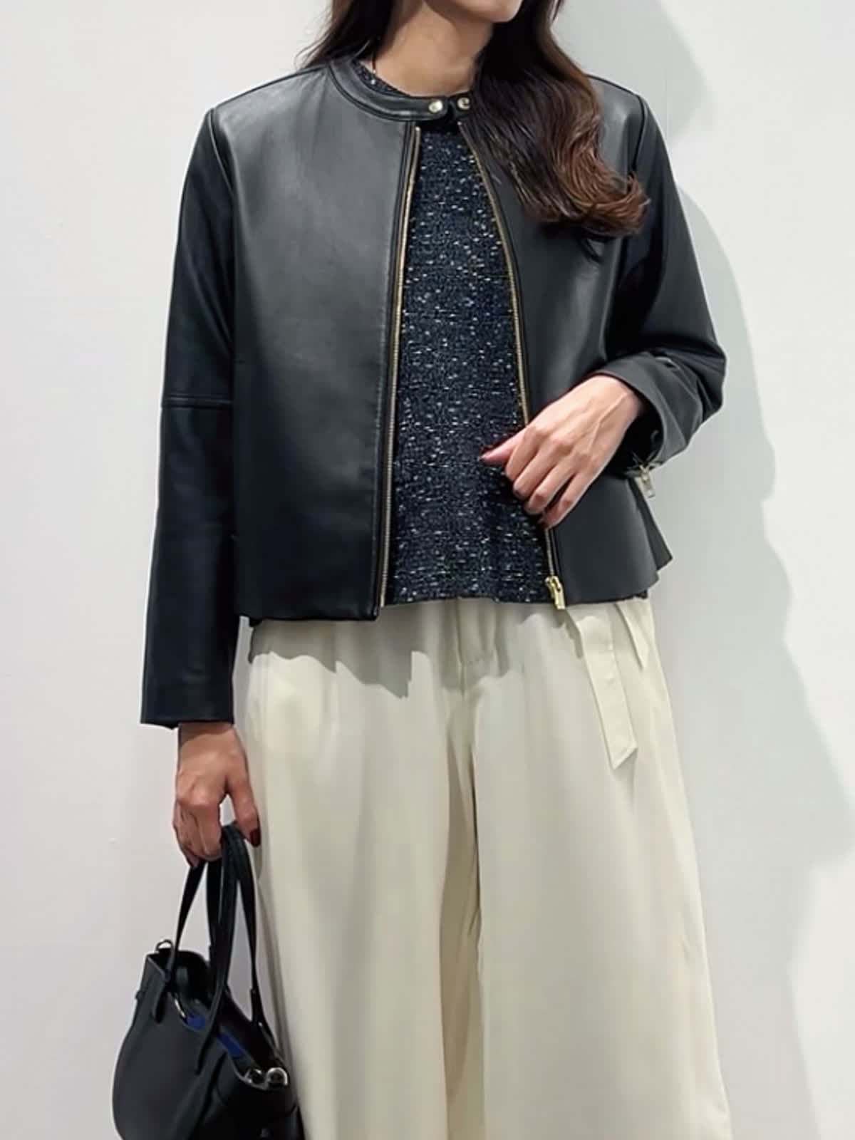 【着用サイズ】ジャケット:9号 カットソー:9号 パンツ:11号 【着用カラー】ジャケット:ブラック カットソー:ネイビー パンツ:オフホワイト バッグ:ブラック 「大人のミックスエレガンスコーデ」 シルエットが美しく、ベーシックに着こなせるラムレザージャケット。すっきりとした身頃と、シャープな印象で、羽織るだけでサマになるデザイン。上質なラムレザーで、着心地良く、万能に着こなせるアイテムでおすすめ。インナーは、1枚でドッキングしたようなデザインのツイード風カットソー。きれいめなのに、リラックス感があり、ワイドパンツとのバランスもすっきり着こなせます。レザーで上品に合わせた、大人のミックスエレガンススタイルです。