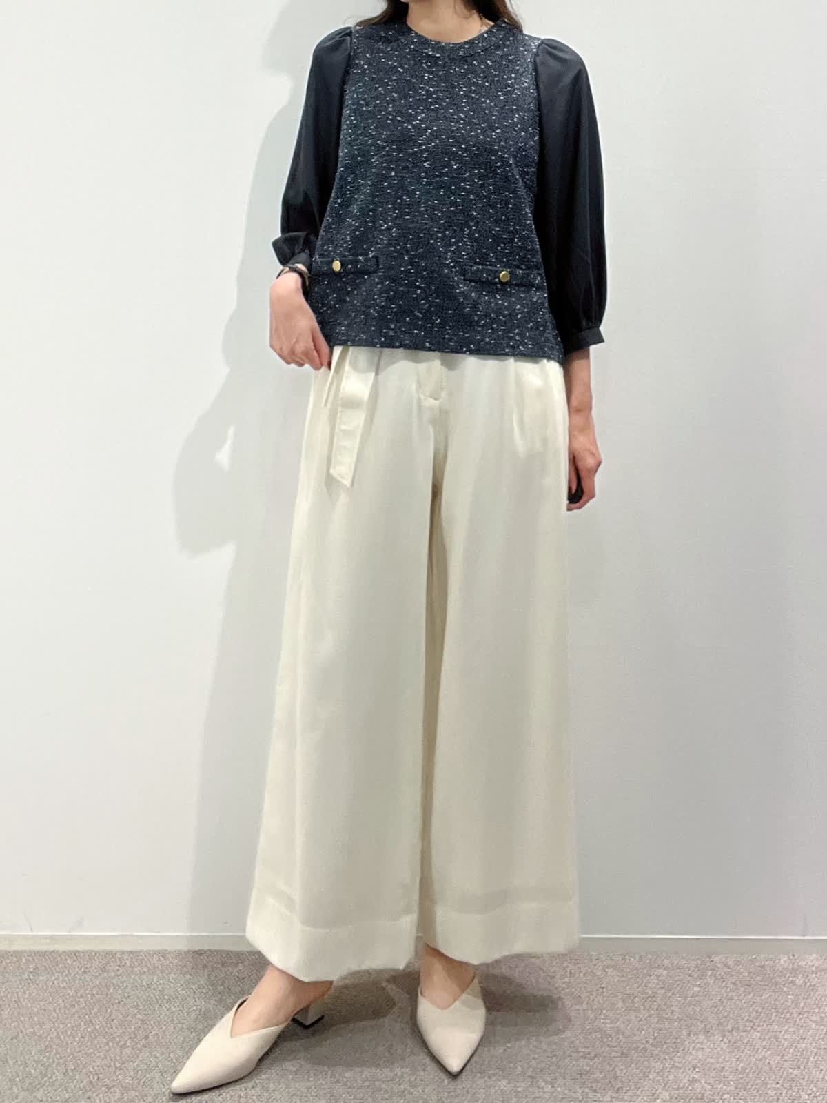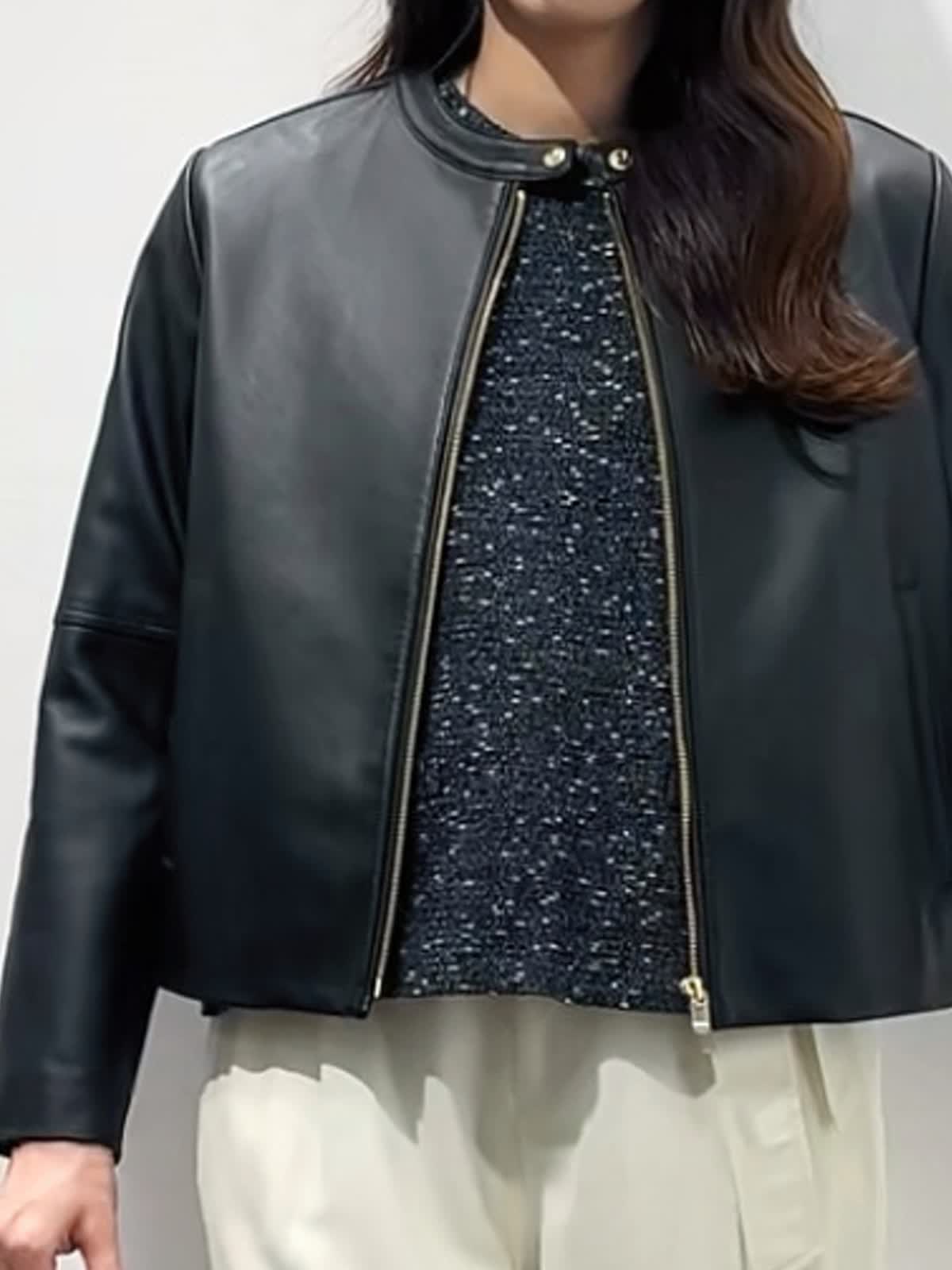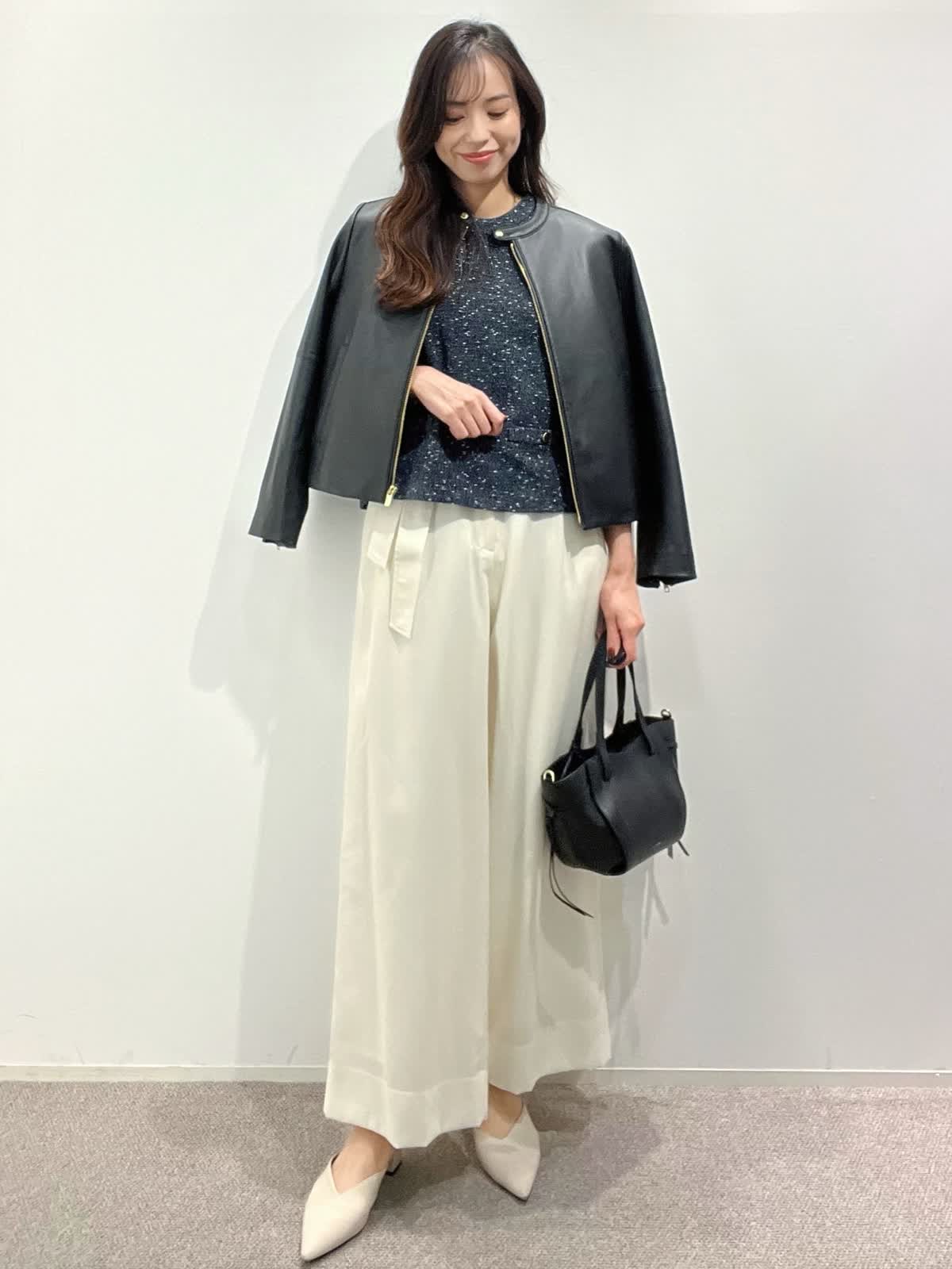 【着用サイズ】ジャケット:9号 カットソー:9号 パンツ:11号 【着用カラー】ジャケット:ブラック カットソー:ネイビー パンツ:オフホワイト バッグ:ブラック 「大人のミックスエレガンスコーデ」 シルエットが美しく、ベーシックに着こなせるラムレザージャケット。すっきりとした身頃と、シャープな印象で、羽織るだけでサマになるデザイン。上質なラムレザーで、着心地良く、万能に着こなせるアイテムでおすすめ。インナーは、1枚でドッキングしたようなデザインのツイード風カットソー。きれいめなのに、リラックス感があり、ワイドパンツとのバランスもすっきり着こなせます。レザーで上品に合わせた、大人のミックスエレガンススタイルです。