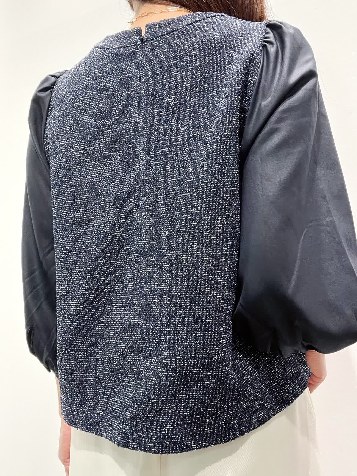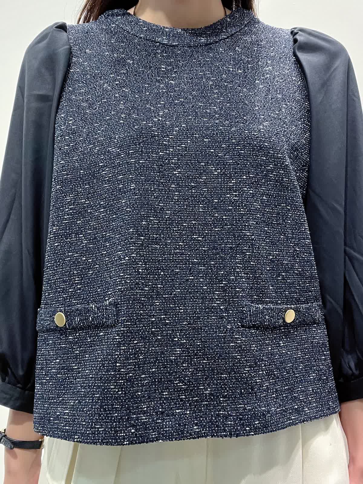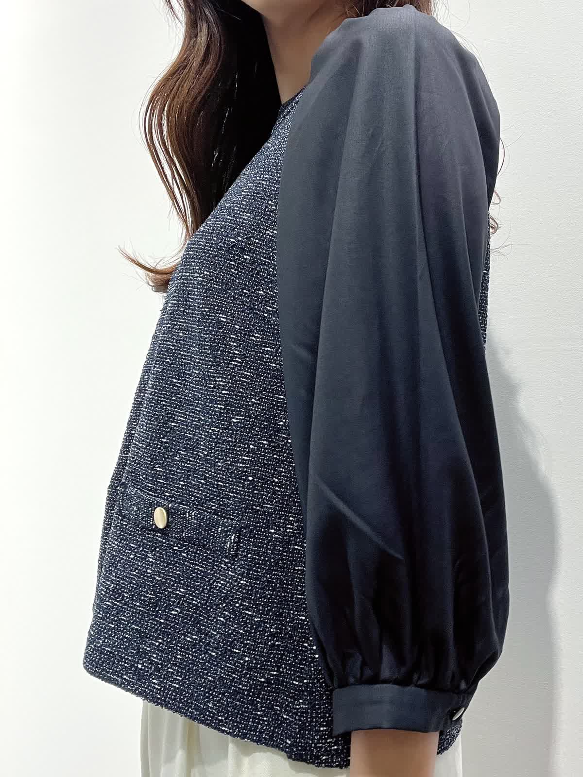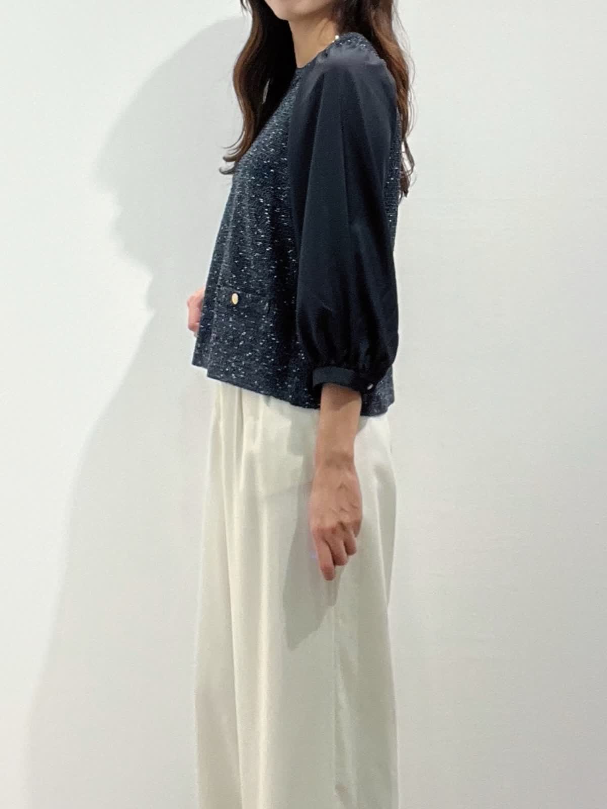 【着用サイズ】ジャケット:9号 カットソー:9号 パンツ:11号 【着用カラー】ジャケット:ブラック カットソー:ネイビー パンツ:オフホワイト バッグ:ブラック 「大人のミックスエレガンスコーデ」 シルエットが美しく、ベーシックに着こなせるラムレザージャケット。すっきりとした身頃と、シャープな印象で、羽織るだけでサマになるデザイン。上質なラムレザーで、着心地良く、万能に着こなせるアイテムでおすすめ。インナーは、1枚でドッキングしたようなデザインのツイード風カットソー。きれいめなのに、リラックス感があり、ワイドパンツとのバランスもすっきり着こなせます。レザーで上品に合わせた、大人のミックスエレガンススタイルです。