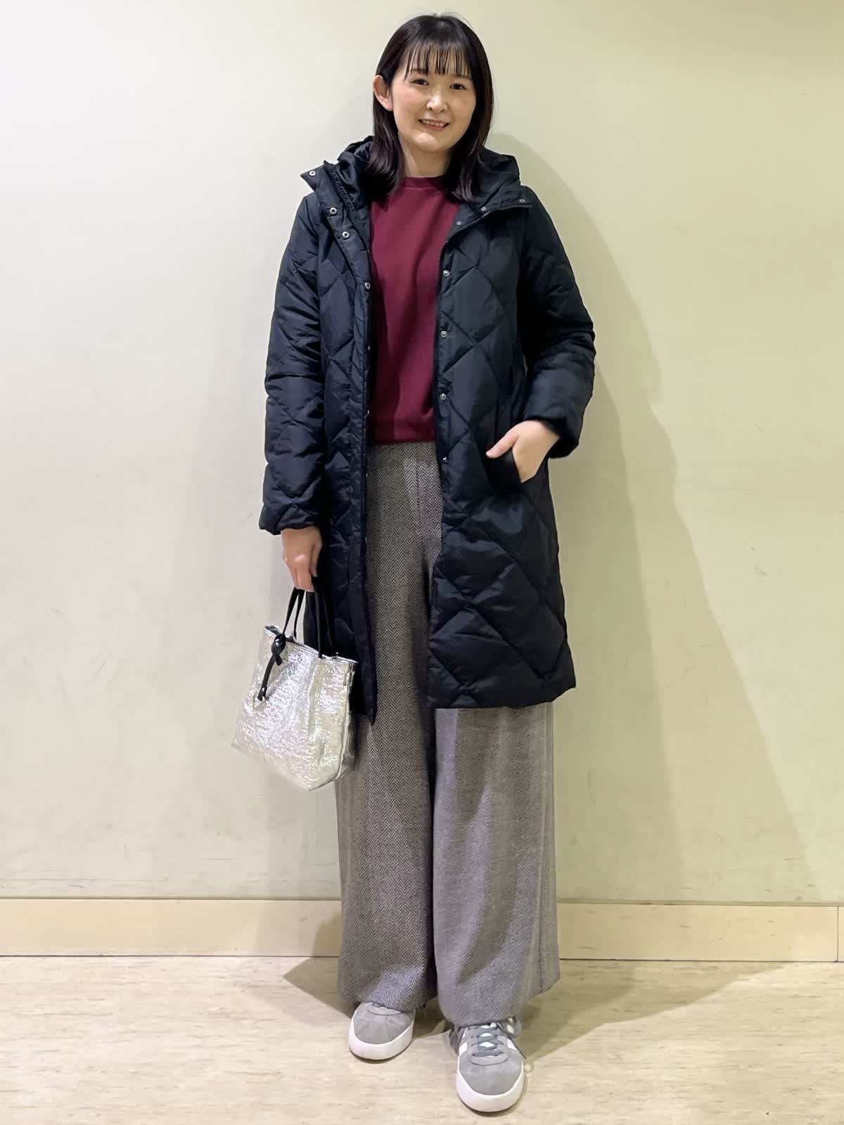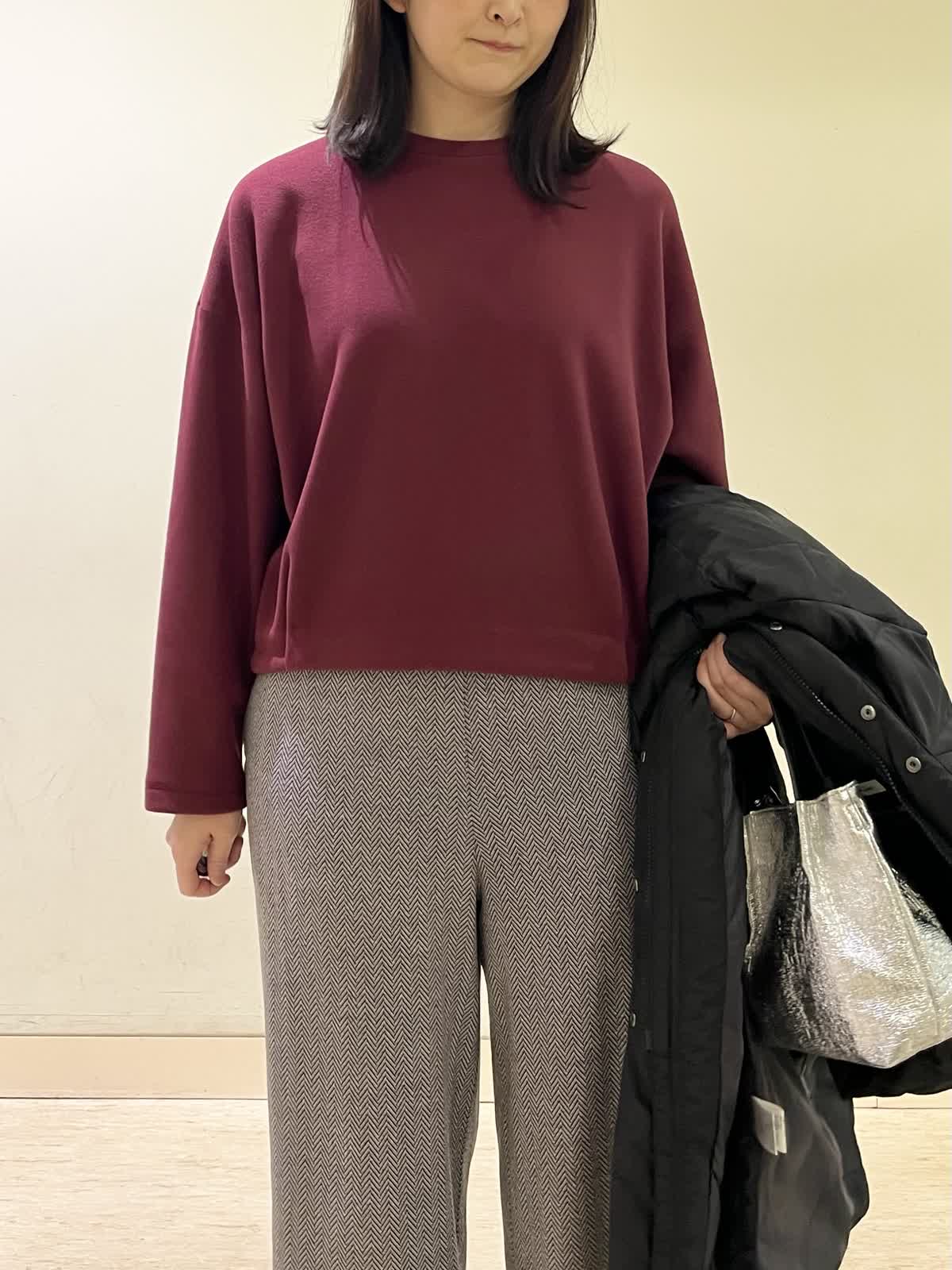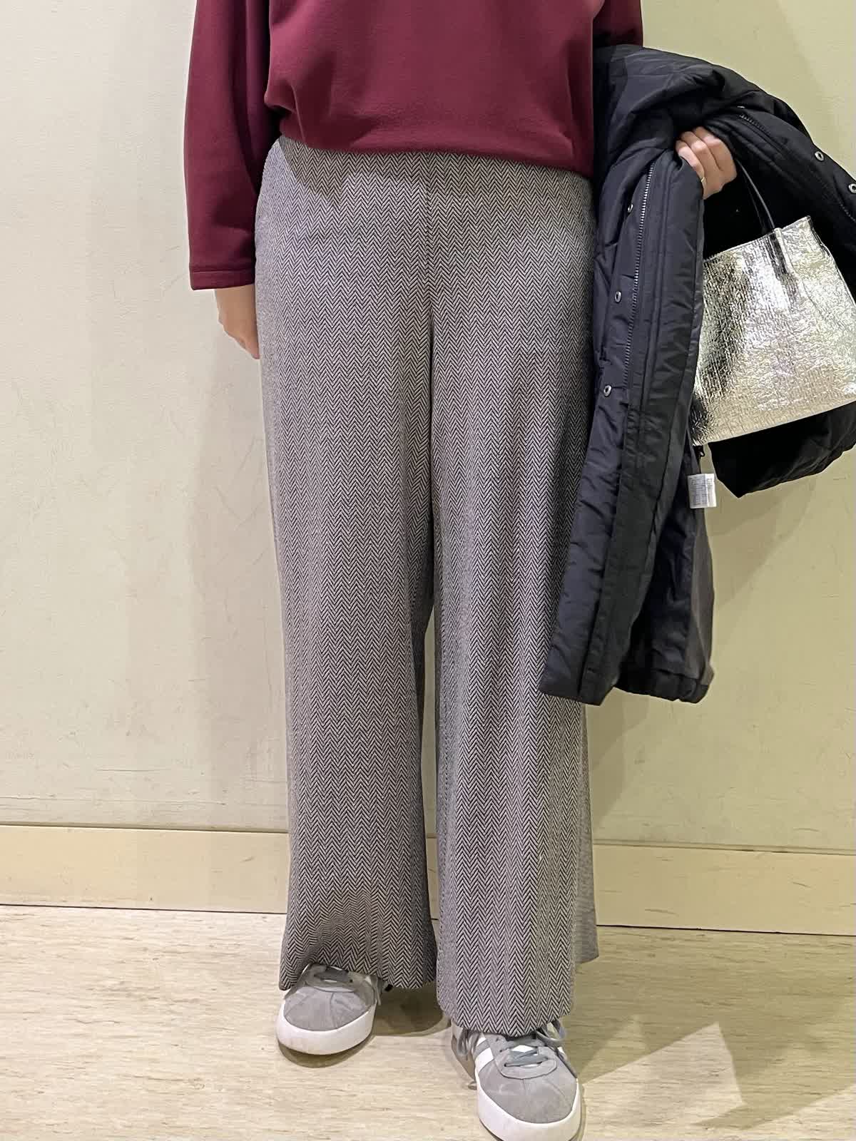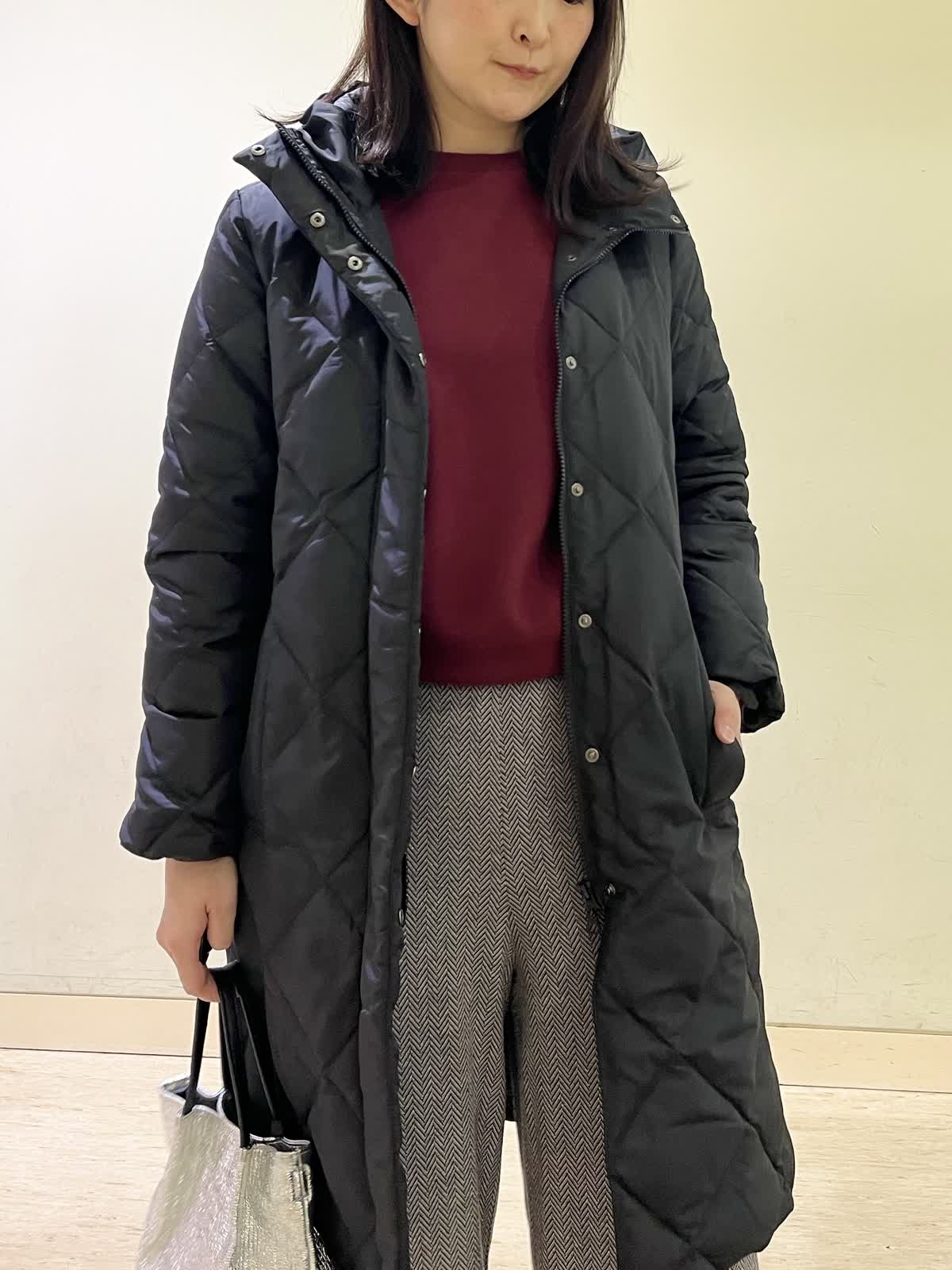 【着用カラー/サイズ】ダウンコート:ブラック/9号カットソー:ボルドー/フリー パンツ:ブラック/9号 冬のお出かけコーデ。ダウンコートのサイズ感は、ジャストで着れるぴったりサイズなので、飽きのこないシンプル設計。圧縮起毛のカットソーは、ふんわり暖かく柔らかいので、普段着にも着やすい一着。ヘリンボーン柄のパンツでより秋冬らしい雰囲気にコーディネート。ウール混の素材なので、暖かく、シワにもならないのでこの冬たくさん着たくなる万能パンツです。