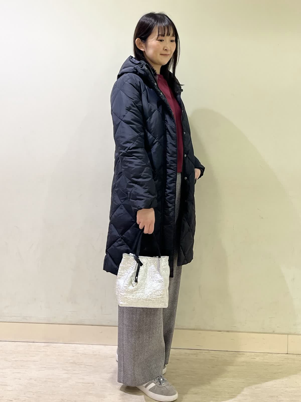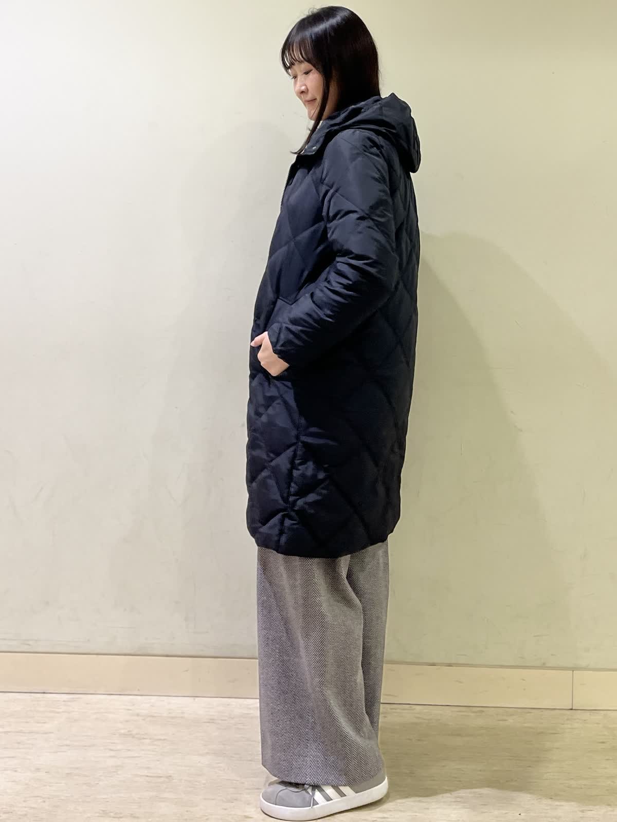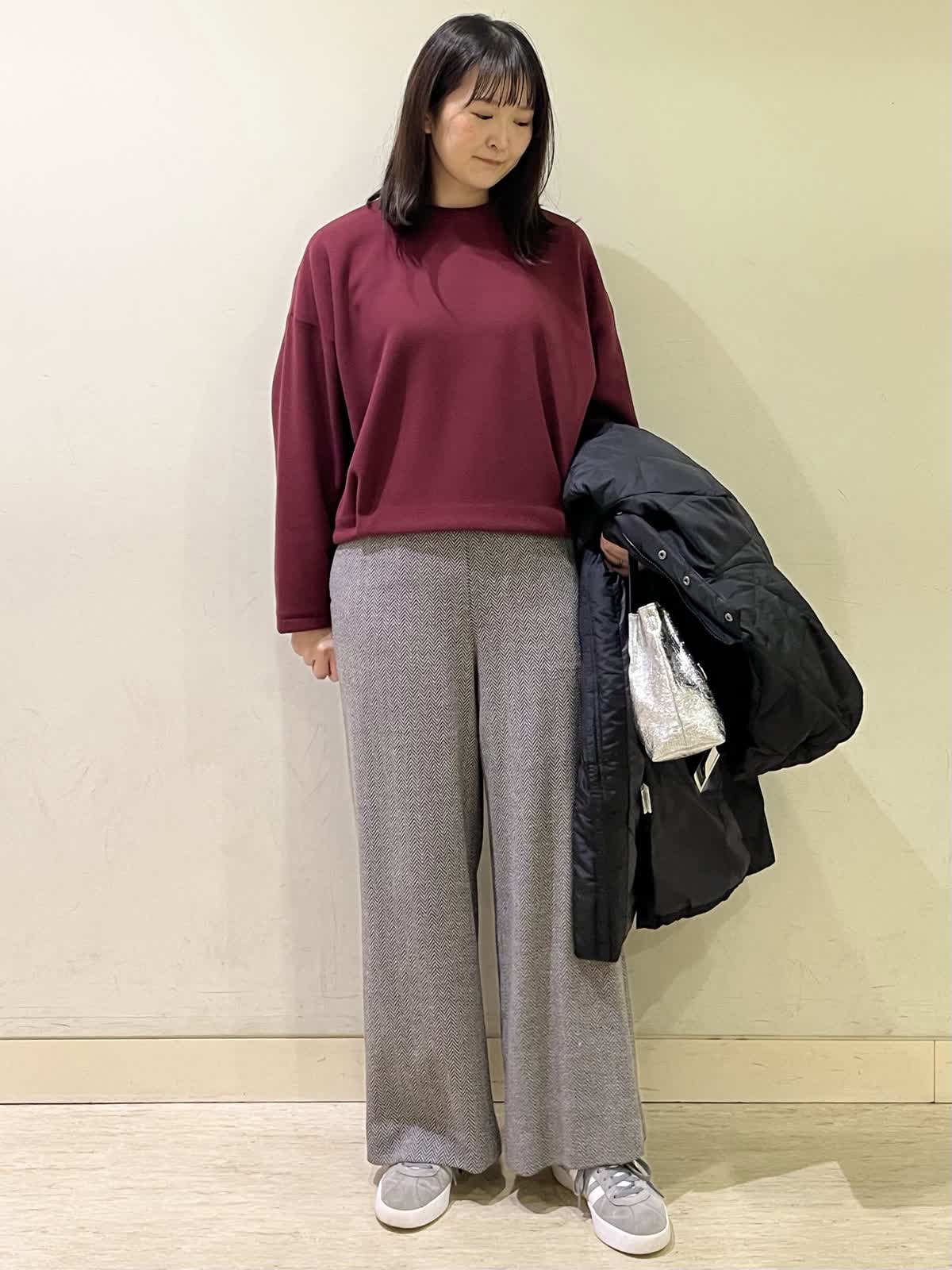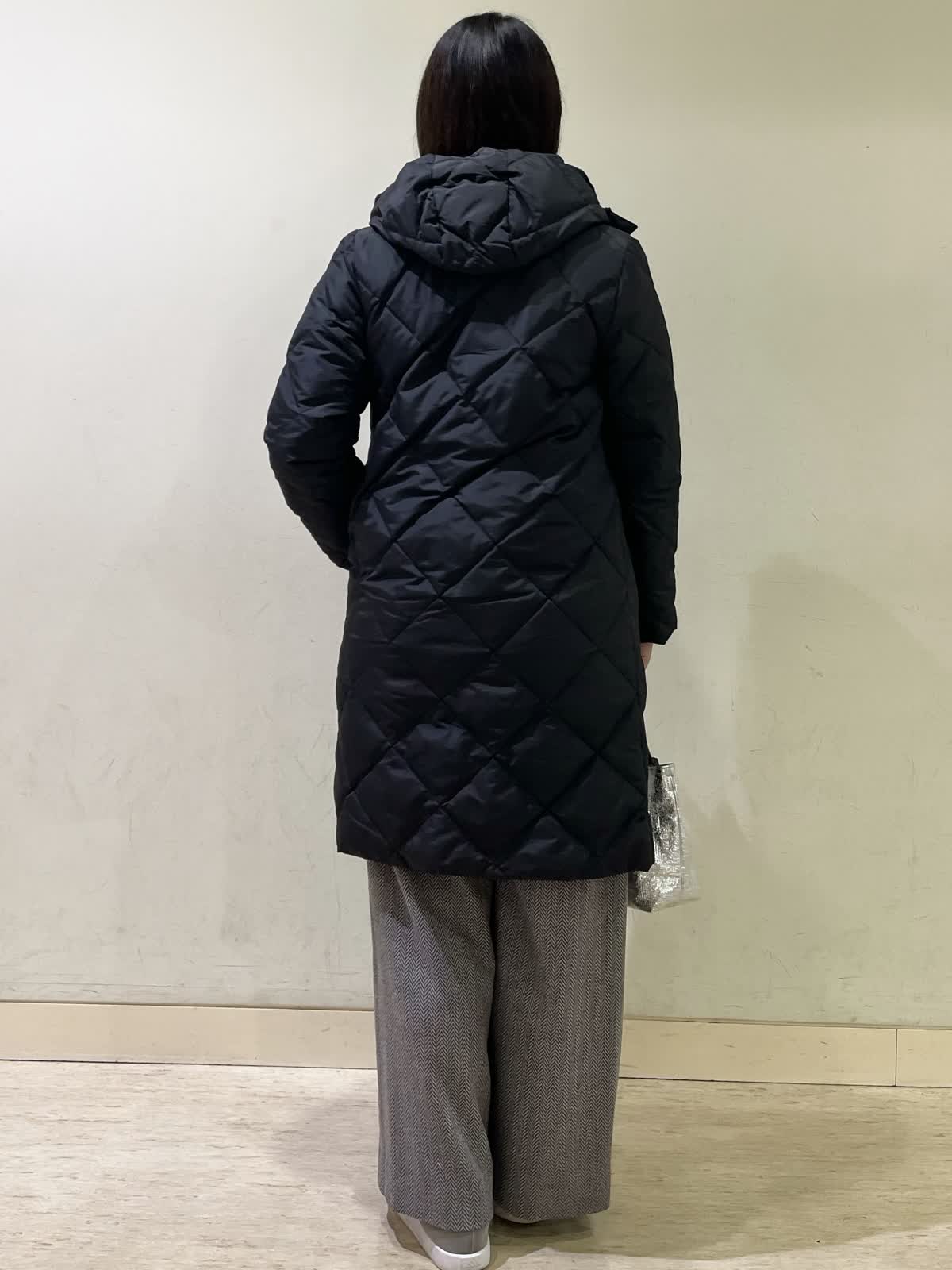【着用カラー/サイズ】ダウンコート:ブラック/9号カットソー:ボルドー/フリー パンツ:ブラック/9号 冬のお出かけコーデ。ダウンコートのサイズ感は、ジャストで着れるぴったりサイズなので、飽きのこないシンプル設計。圧縮起毛のカットソーは、ふんわり暖かく柔らかいので、普段着にも着やすい一着。ヘリンボーン柄のパンツでより秋冬らしい雰囲気にコーディネート。ウール混の素材なので、暖かく、シワにもならないのでこの冬たくさん着たくなる万能パンツです。