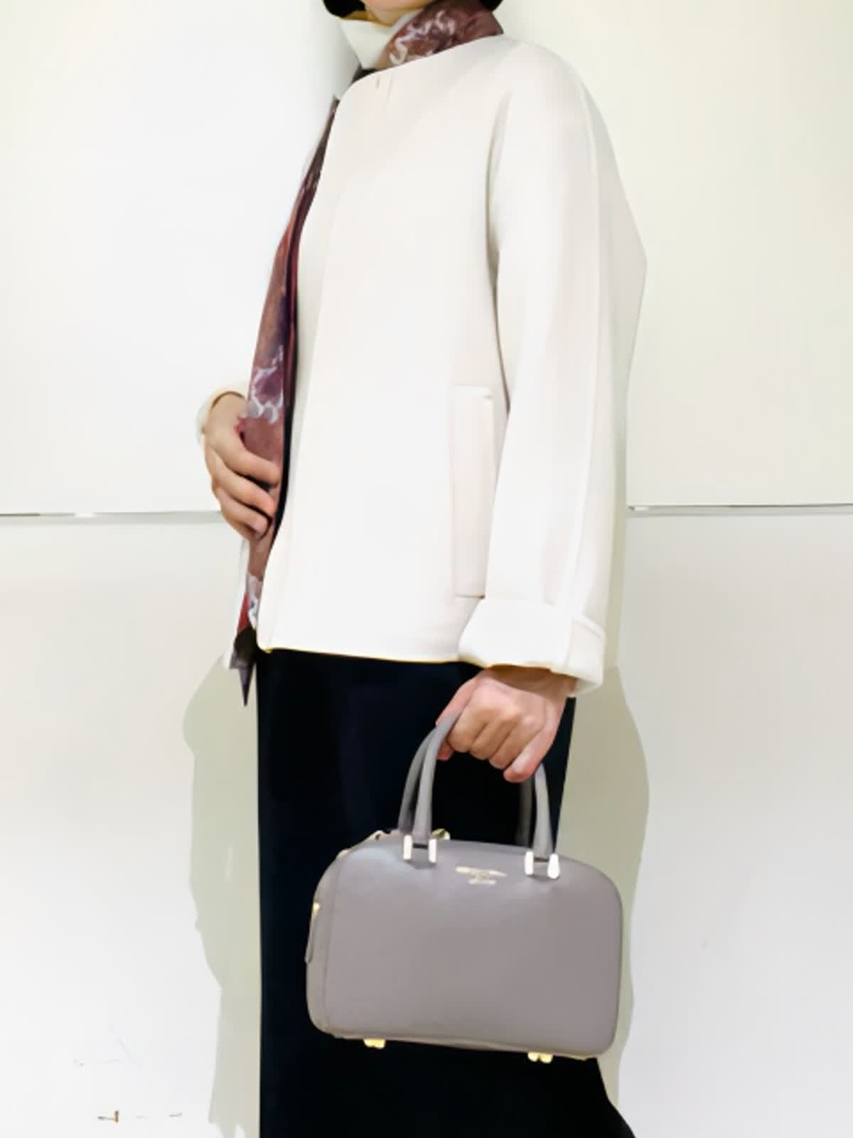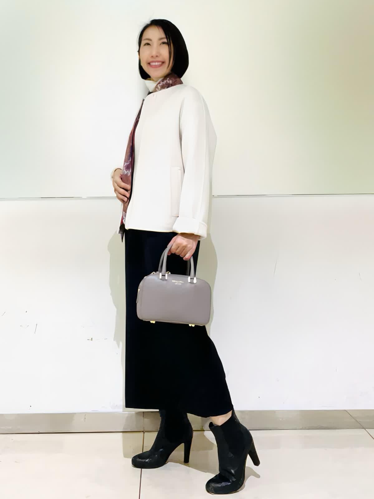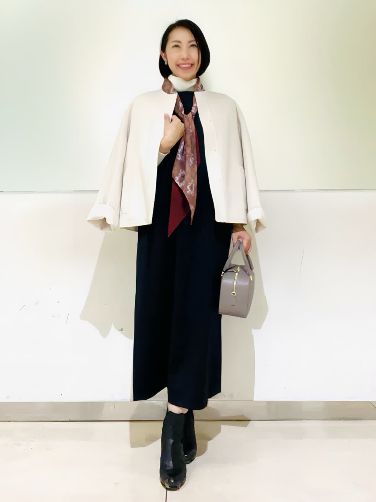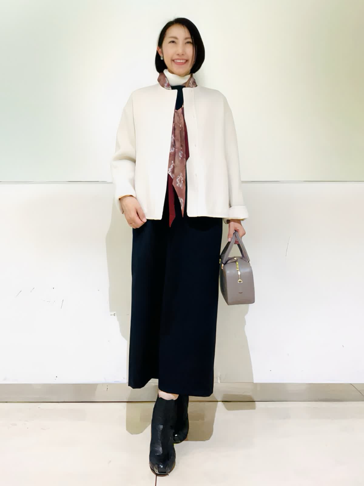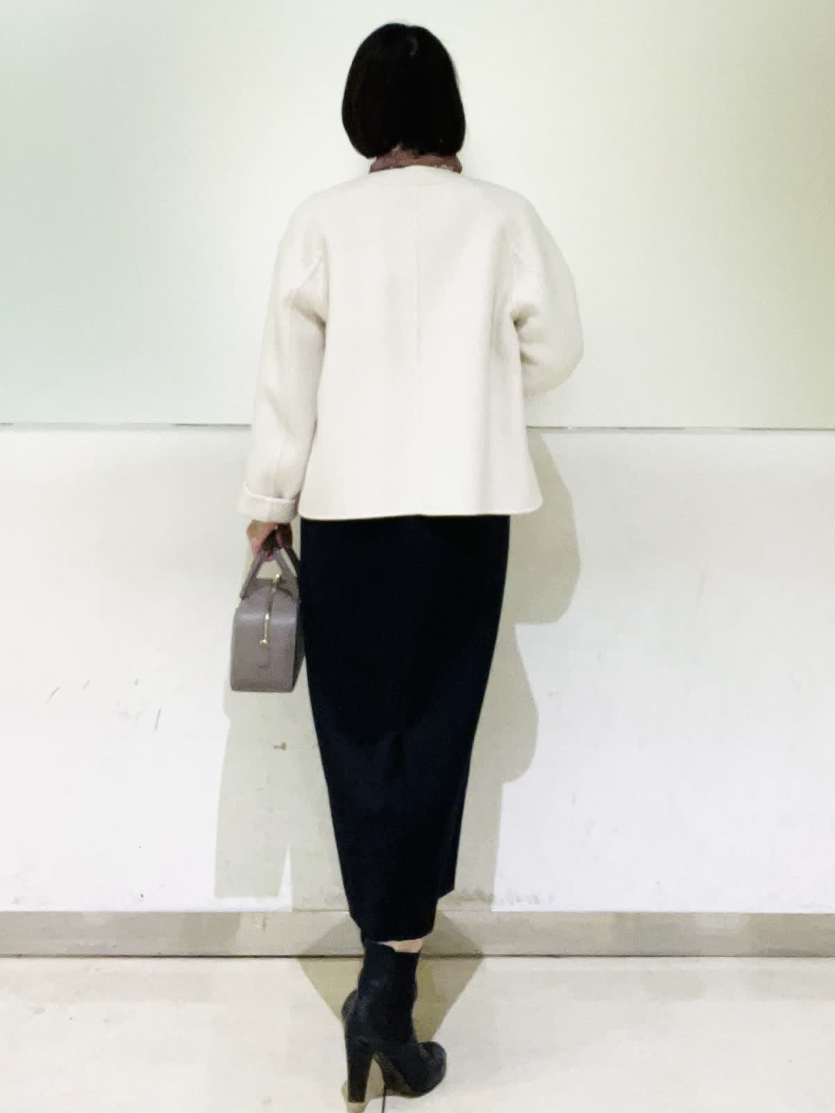 【着用アイテム】すべて9号 【着用カラー】コート:アイボリー ワンピース:ネイビー ニット:グレーベージュ 初冬のお出かけコーディネート。ノーカラーのショートコートはジャケット感覚で着られるので気温が下がったらすぐ羽織れます。コンパクトな着丈が合わせやすく、ワンピースにもバランス良いです。柔らかなアイボリーが優しい雰囲気で、ネイビーのワンピースに馴染みます。