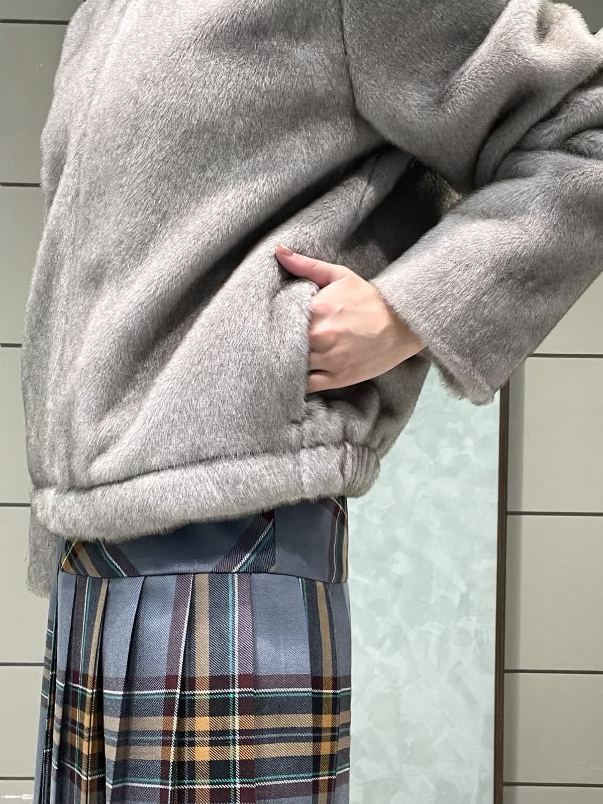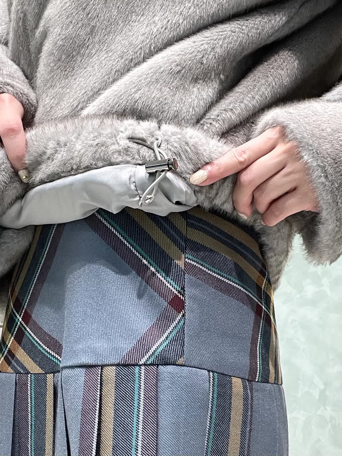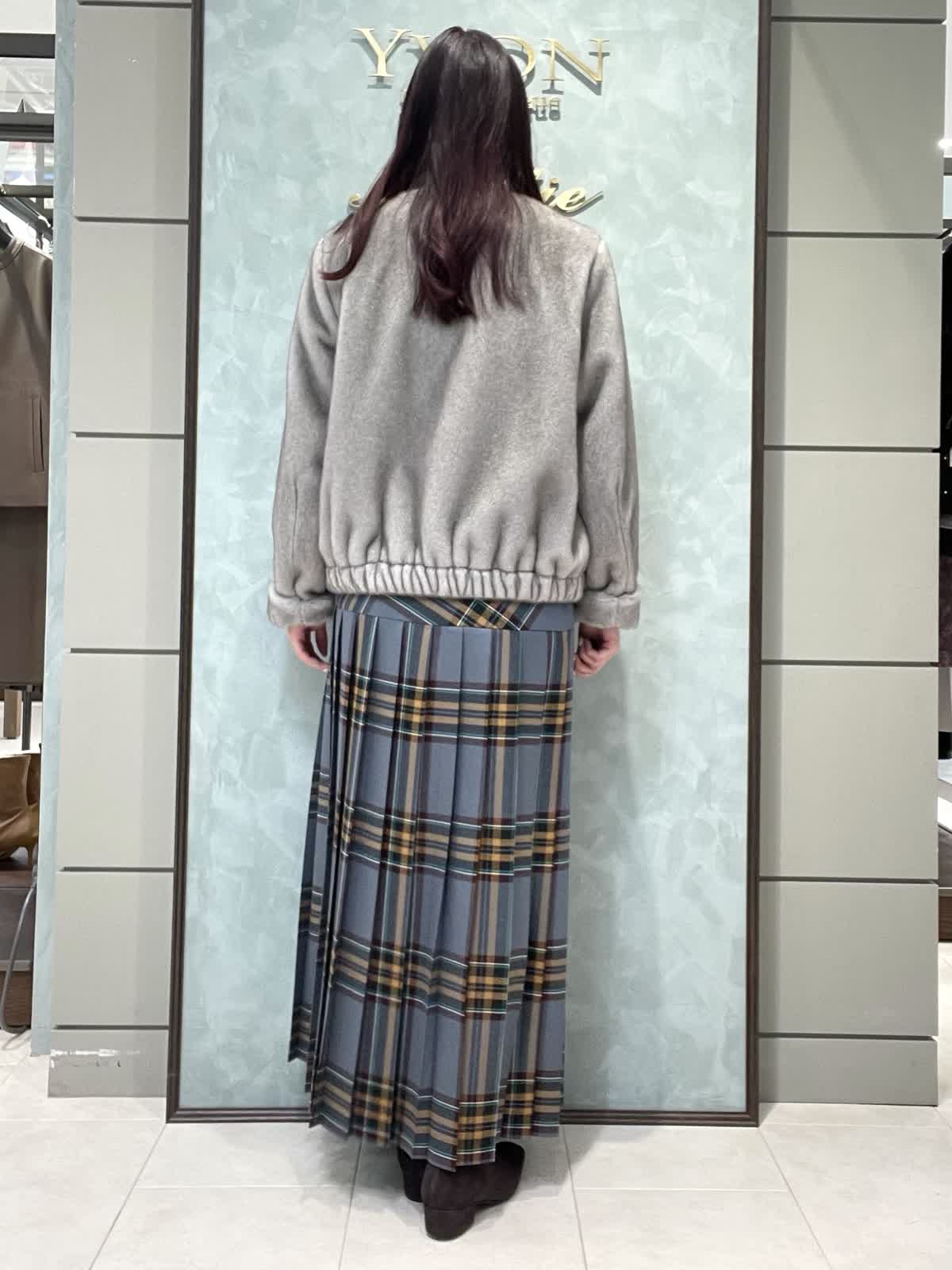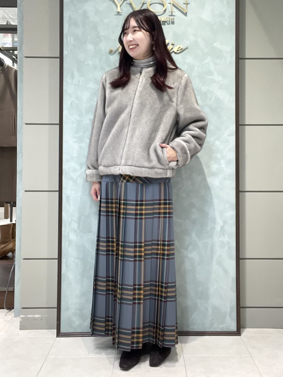 ファーと秋冬カラーのチェックで季節を楽しむスタイリングです。ファーブルゾンはフェイクファーですが柔らかく触り心地が良いです。毛抜けしにくいのも嬉しいポイントです。短すぎない着丈でスカートパンツどちらでもバランスよく合わせられます。インナーは薄手のタートルネックです。柔らかくてとにかく着心地が良いです。タートル部分は落ちないように縁がキュッとなっています。スカートはO'neil of Dublinです。ヒップ位置に切り替えがあるので制服感が出ず、シルエットも広がらず綺麗に着用できます。ウエストゴムなし、ポケットなし、左ファスナーです。着丈は157センチでくるぶし下くらいです。