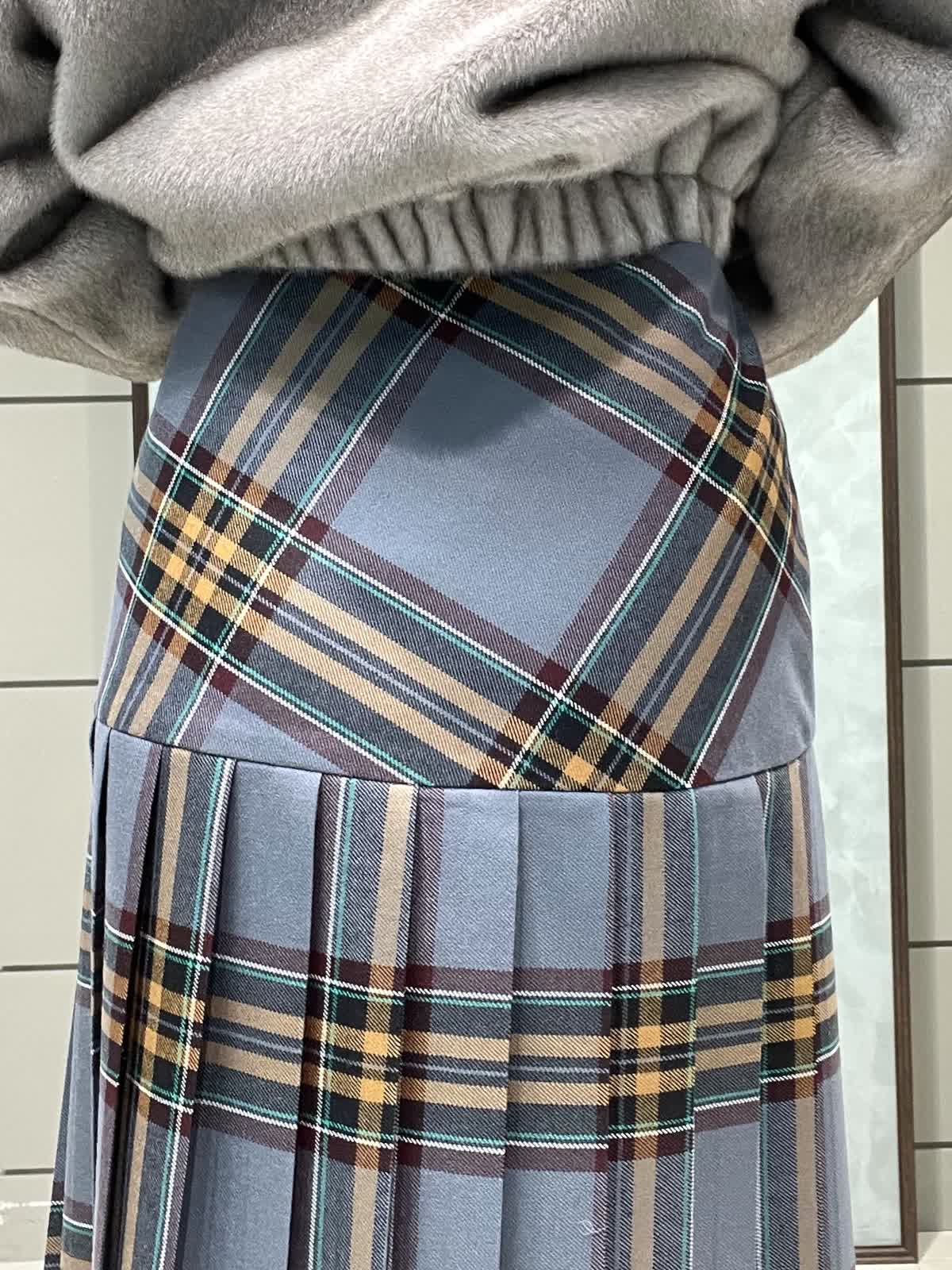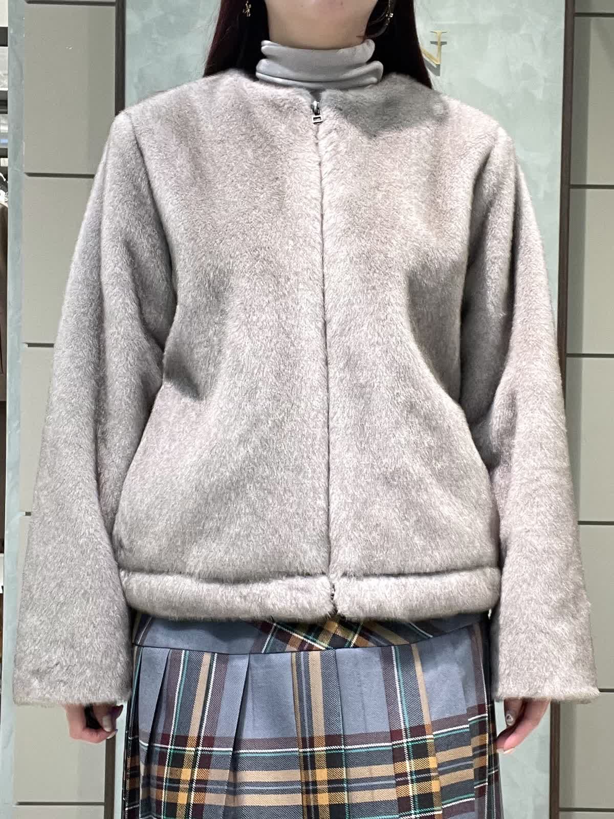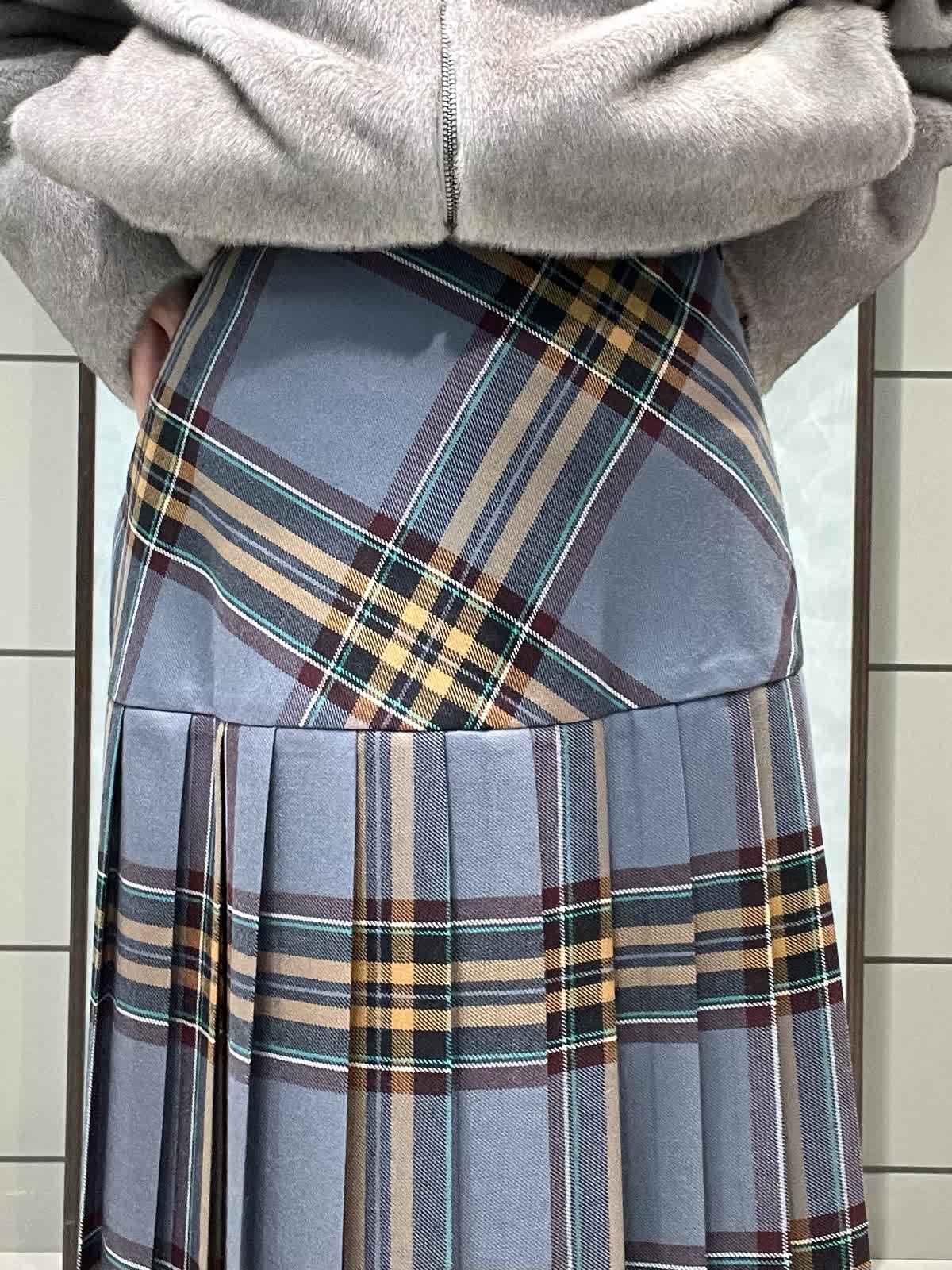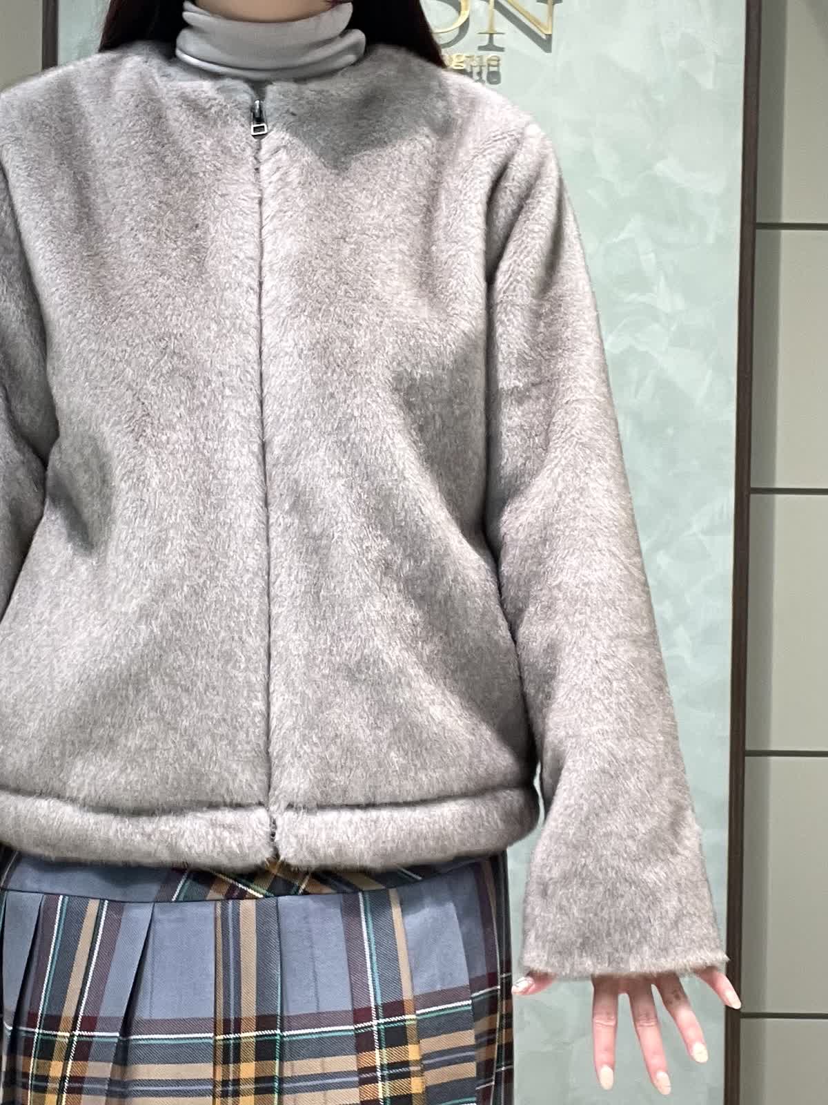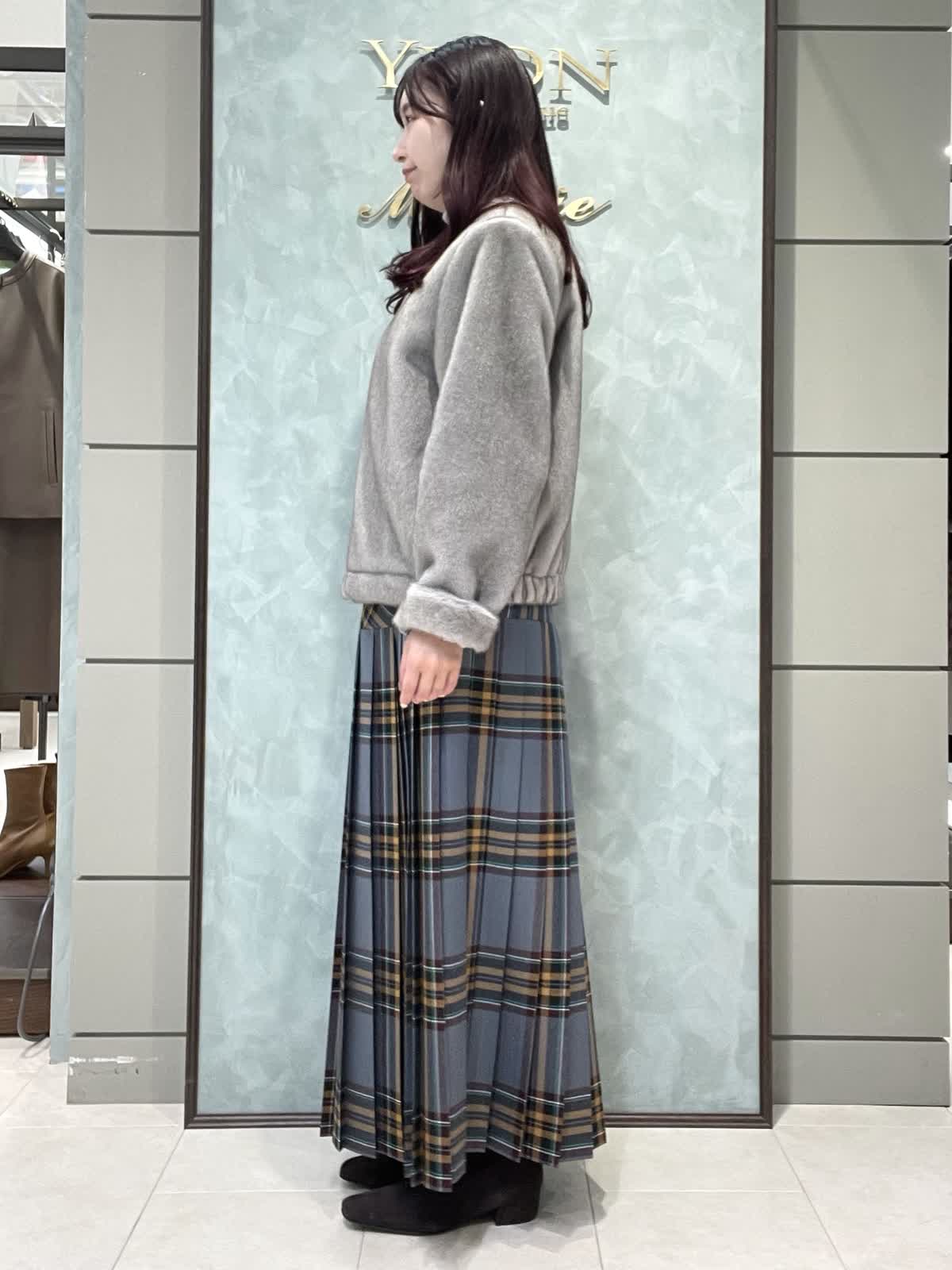 ファーと秋冬カラーのチェックで季節を楽しむスタイリングです。ファーブルゾンはフェイクファーですが柔らかく触り心地が良いです。毛抜けしにくいのも嬉しいポイントです。短すぎない着丈でスカートパンツどちらでもバランスよく合わせられます。インナーは薄手のタートルネックです。柔らかくてとにかく着心地が良いです。タートル部分は落ちないように縁がキュッとなっています。スカートはO'neil of Dublinです。ヒップ位置に切り替えがあるので制服感が出ず、シルエットも広がらず綺麗に着用できます。ウエストゴムなし、ポケットなし、左ファスナーです。着丈は157センチでくるぶし下くらいです。