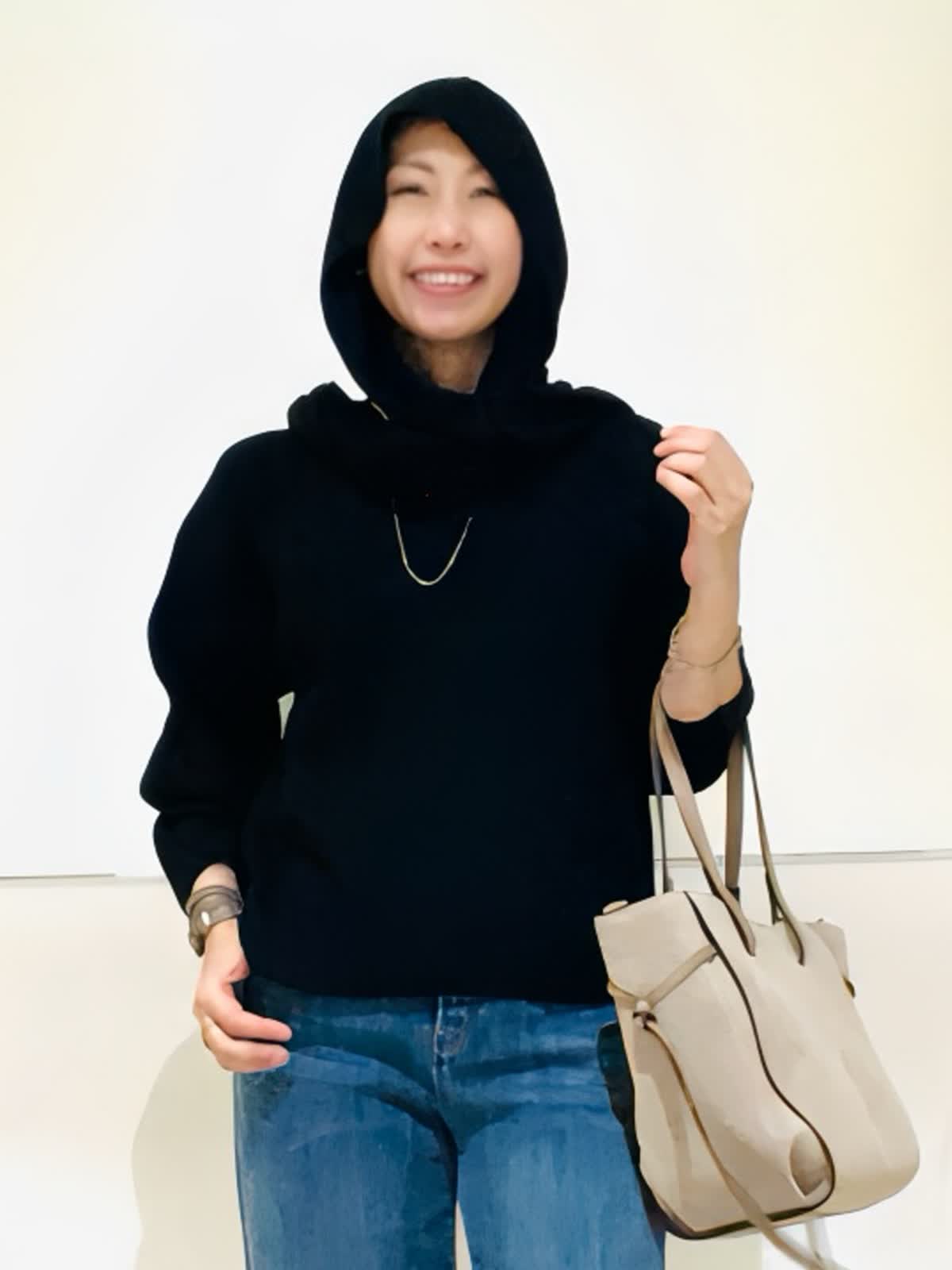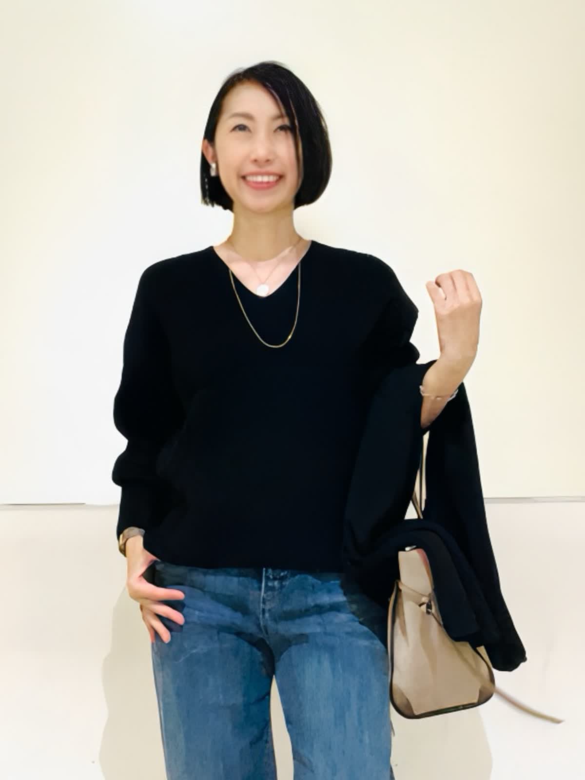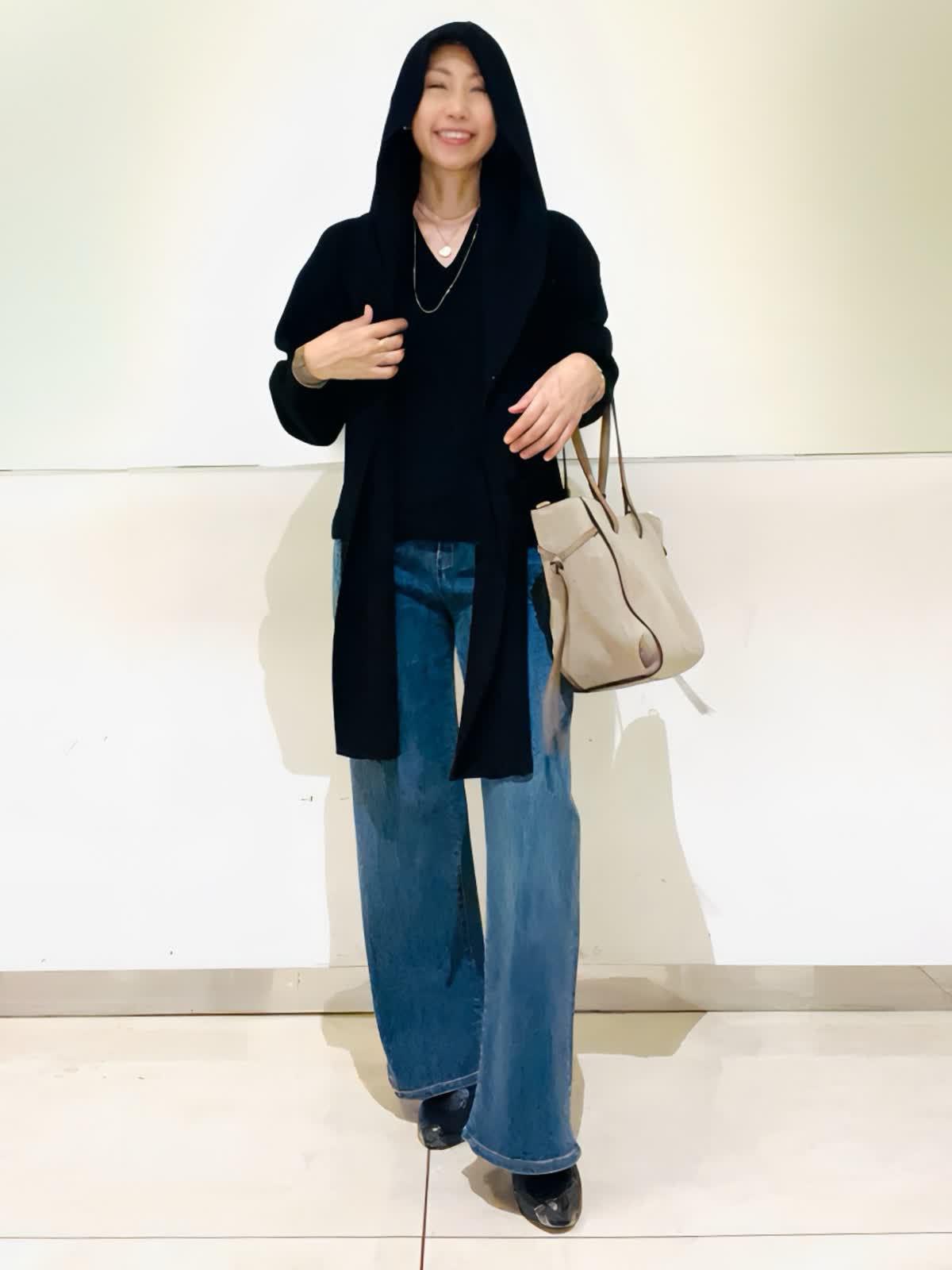 【着用アイテム】すべて9号 【着用カラー】ニット、マフラー:ブラック パンツ:インディゴ 絶対セットで持っていたいニットとマフラー。マフラーはフード付きで、巻き方でいろんな着こなしが楽しめるアイテム。スタイリングのアクセントになぅてくれます。シンプルなVネックニットもアレンジ次第でこなれた印象にしてくれます。